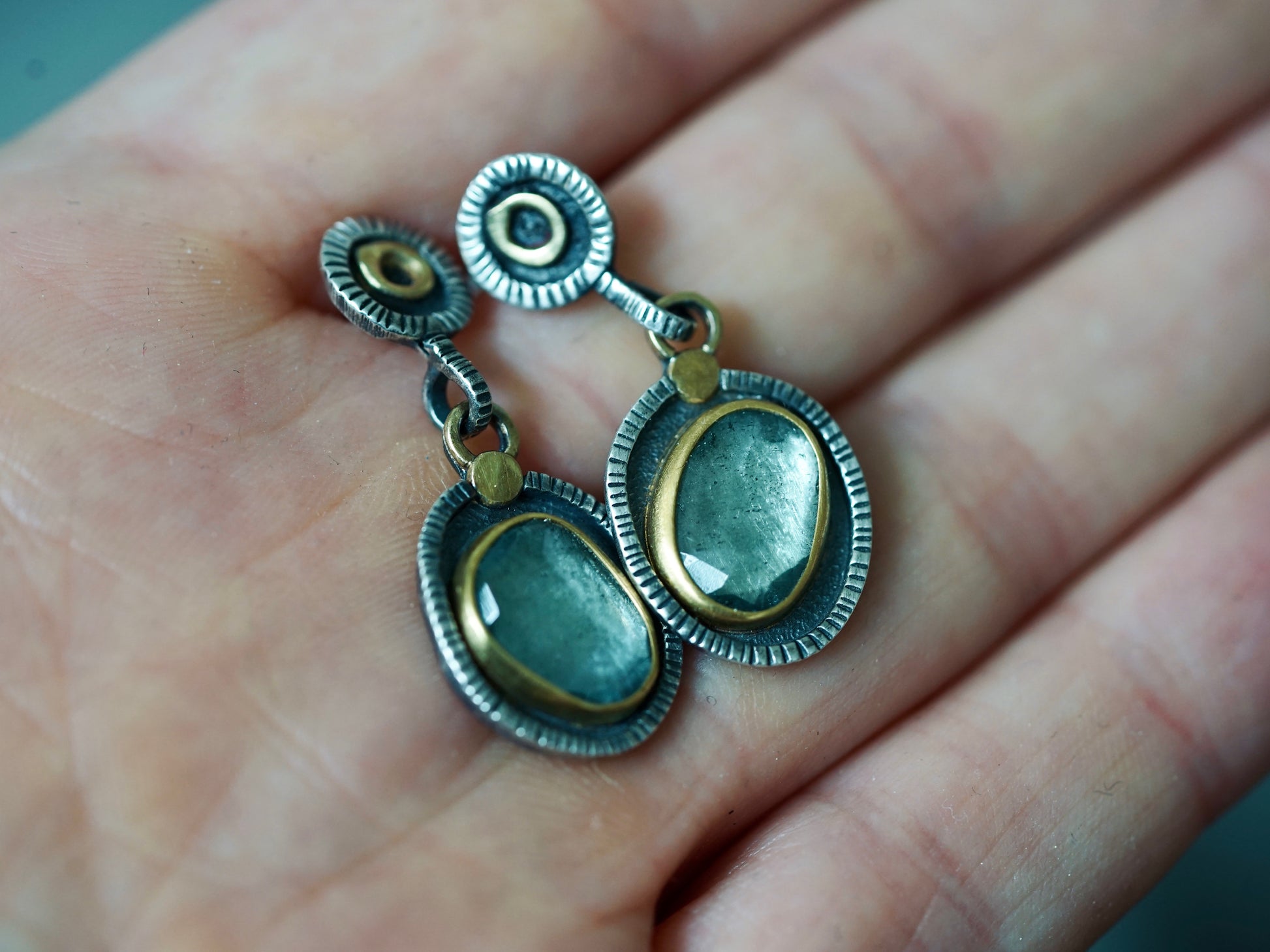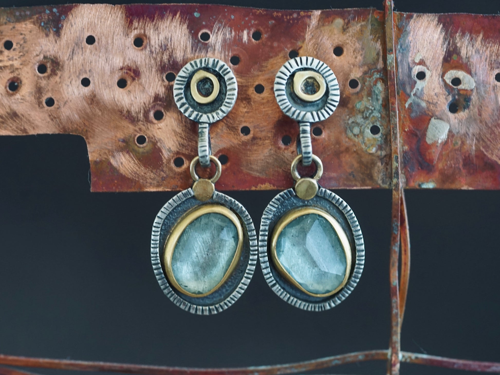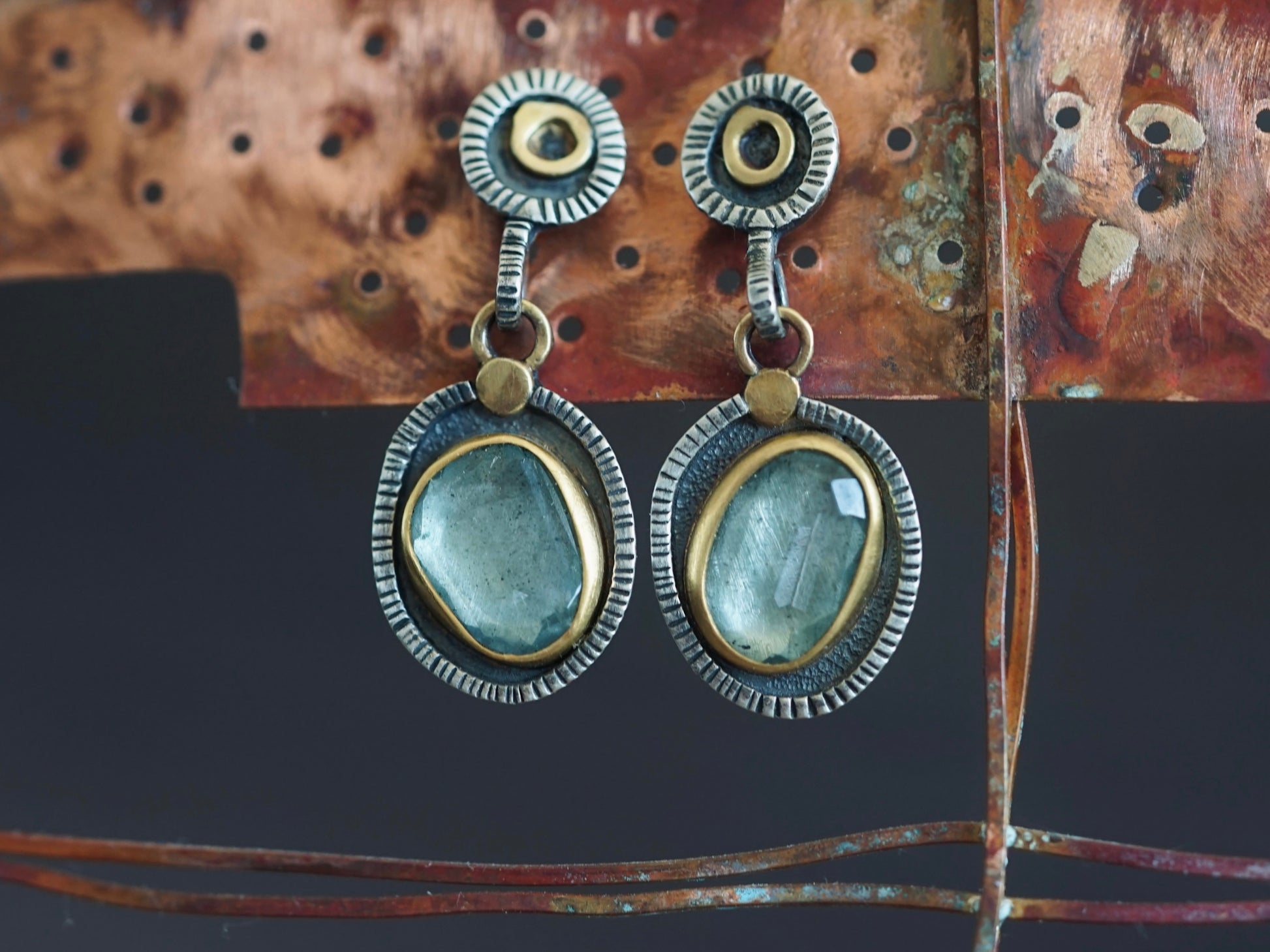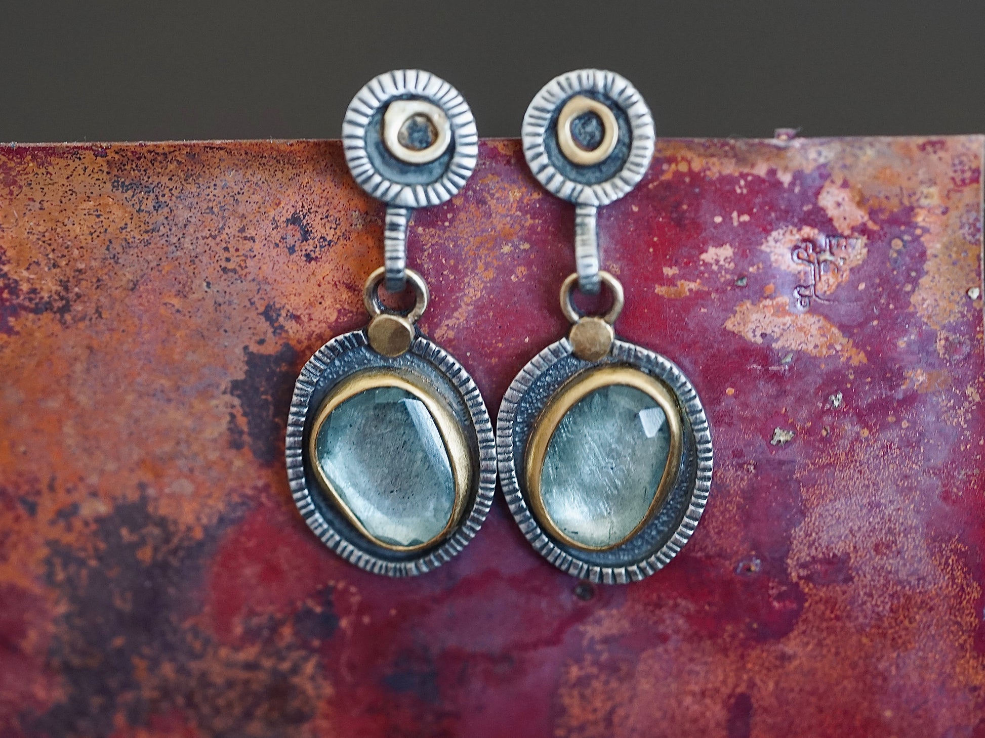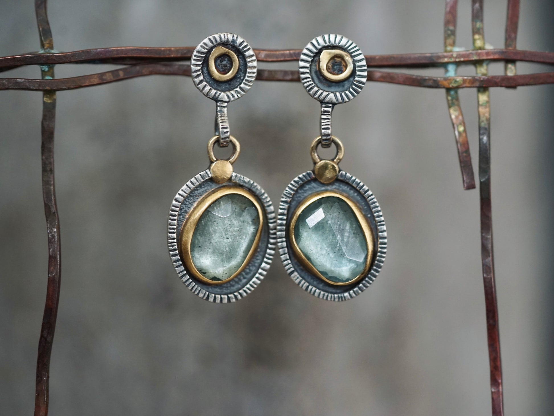 A lovely pair of rose cut, asymmetrically shaped moss aquamarines were set in 22k gold and positioned purposefully askew on textured and framed sterling silver backplates. The stone elements dangle from gold embellished sterling silver posts, fastened with butterfly friction closures to ensure a secure wear.