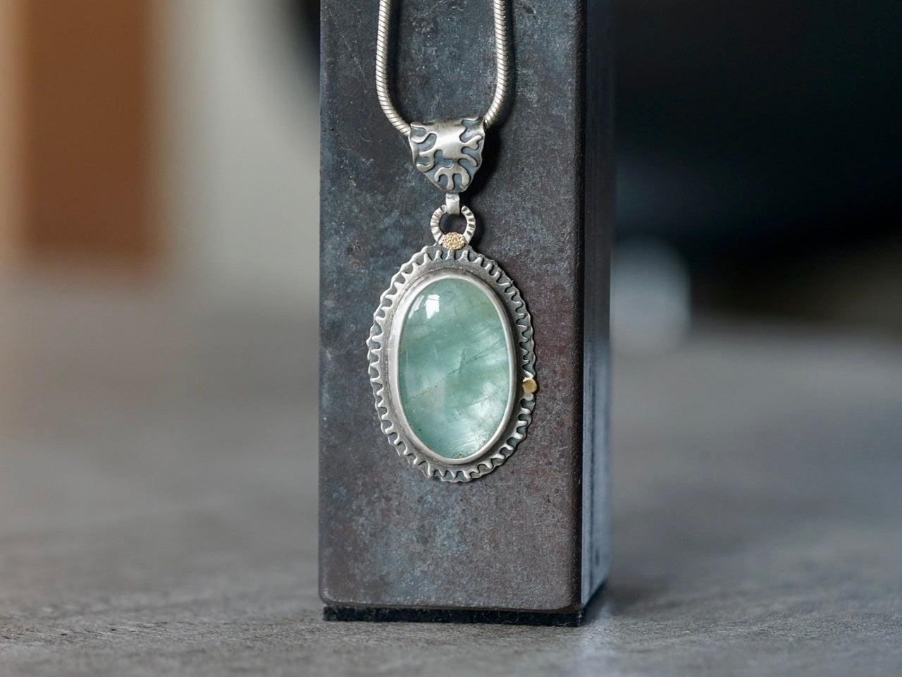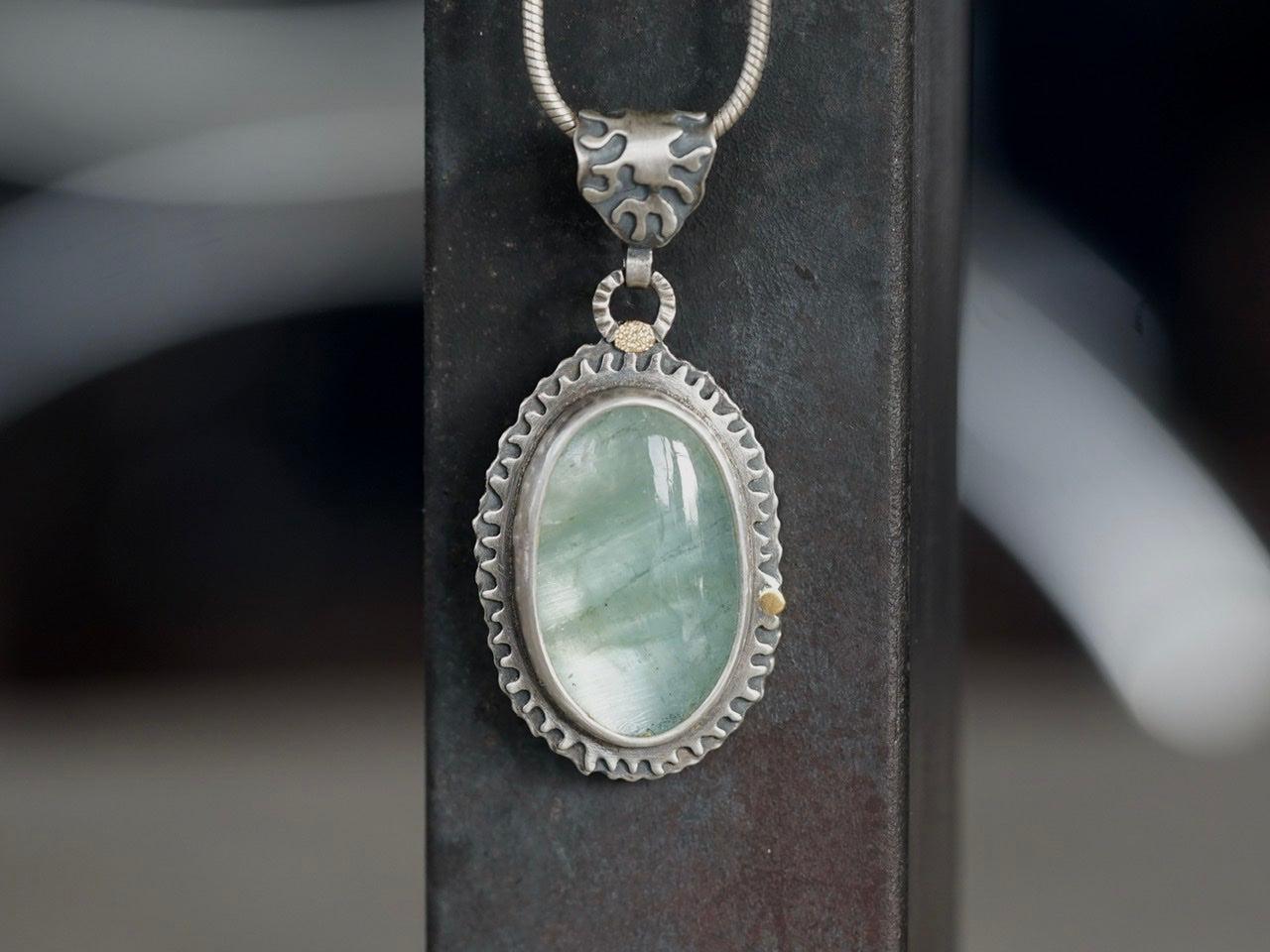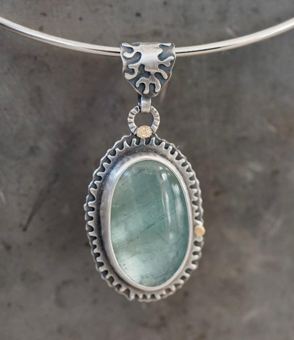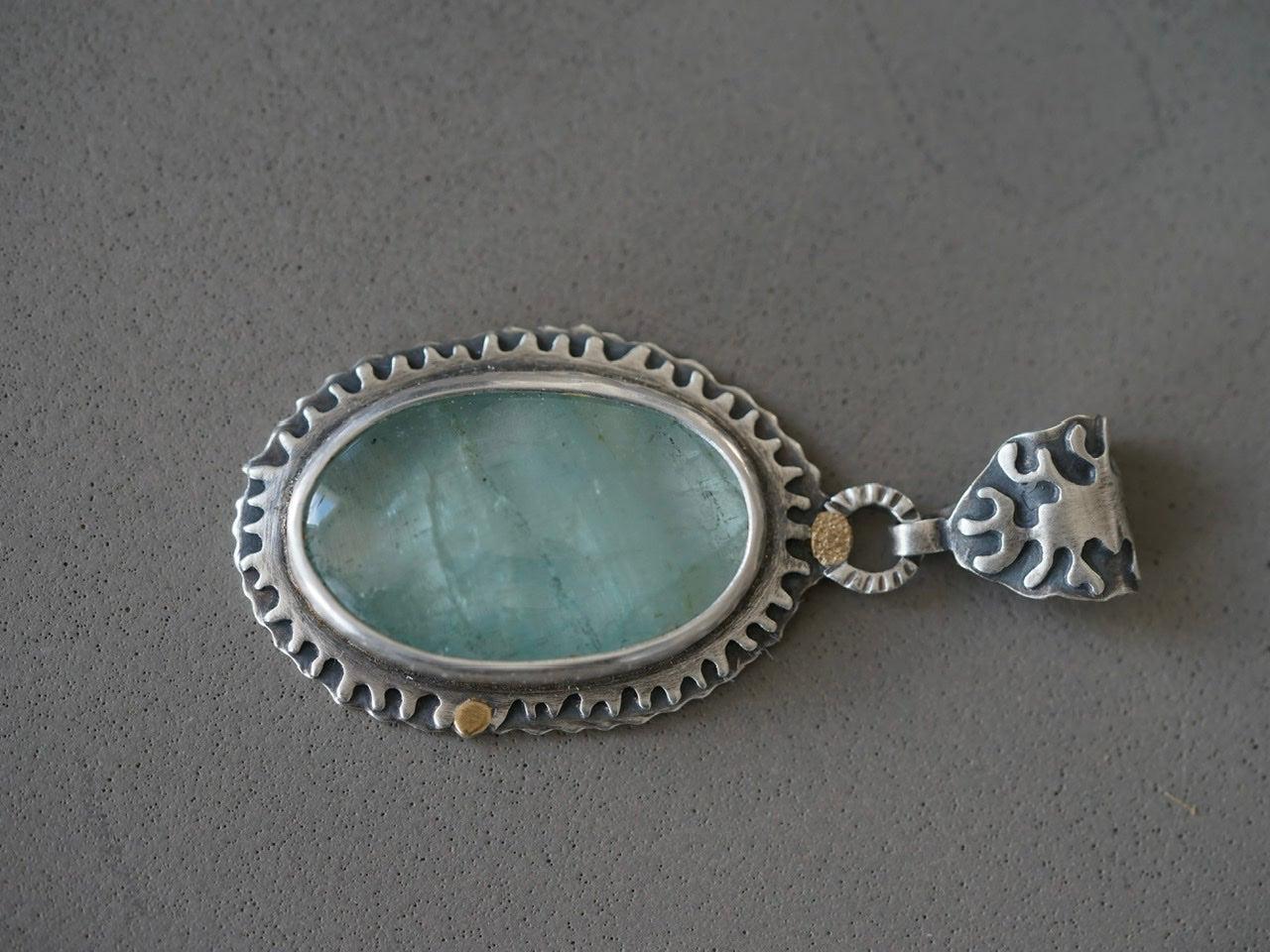 A large, semi-translucent, glacier blue aquamarine cabochon with wonderful inclusions is the focal element of this pendant. Set in fine silver, surrounded by a hand pierced border, embellished with 22k gold accents, and complemented by a matching bail, this stone displays its natural glow.