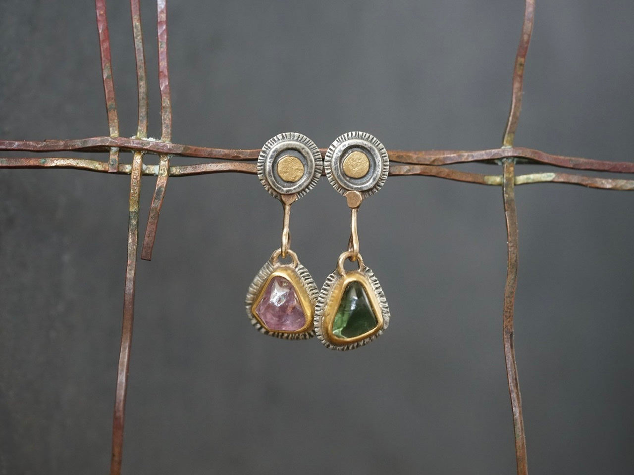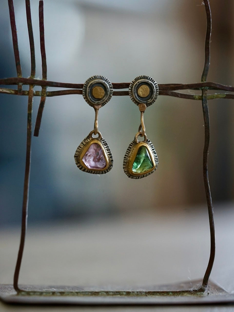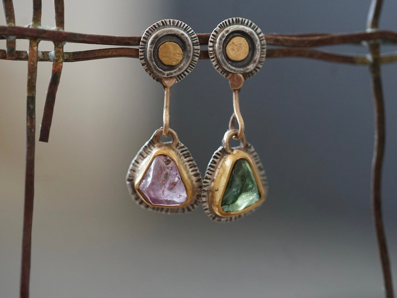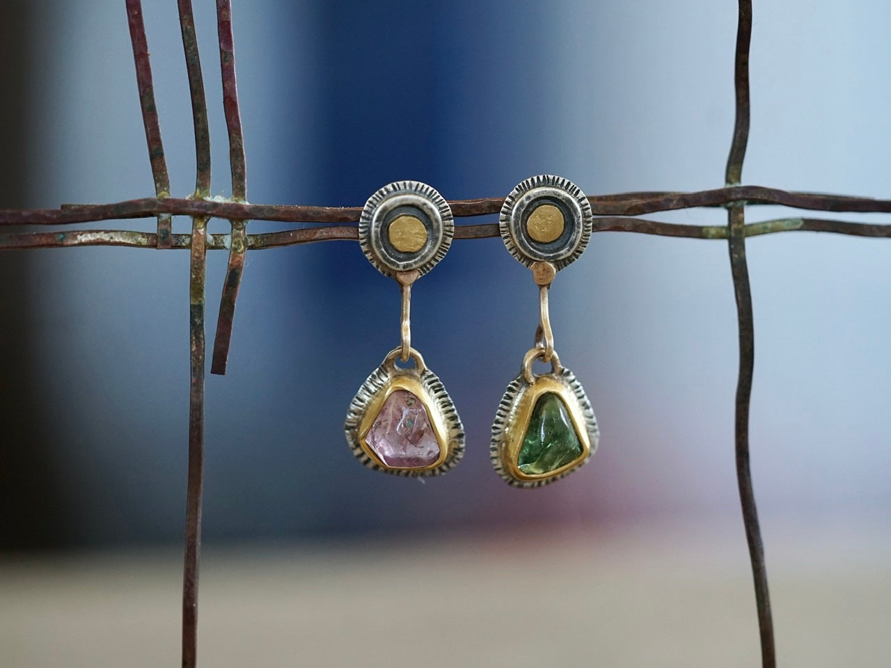 A lavender coloured spinel and a deep green tourmaline were handcarved to organic forms and set in 22k gold to create this one of a kind set. The sterling silver backplates are pierced to allow light shining through the stones. Golden accents add a nice contrast to the color scheme and complement the overall look of this set.