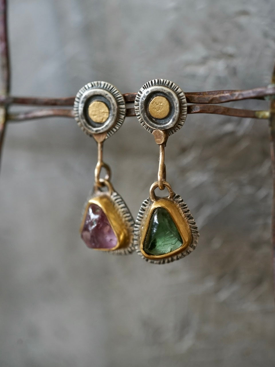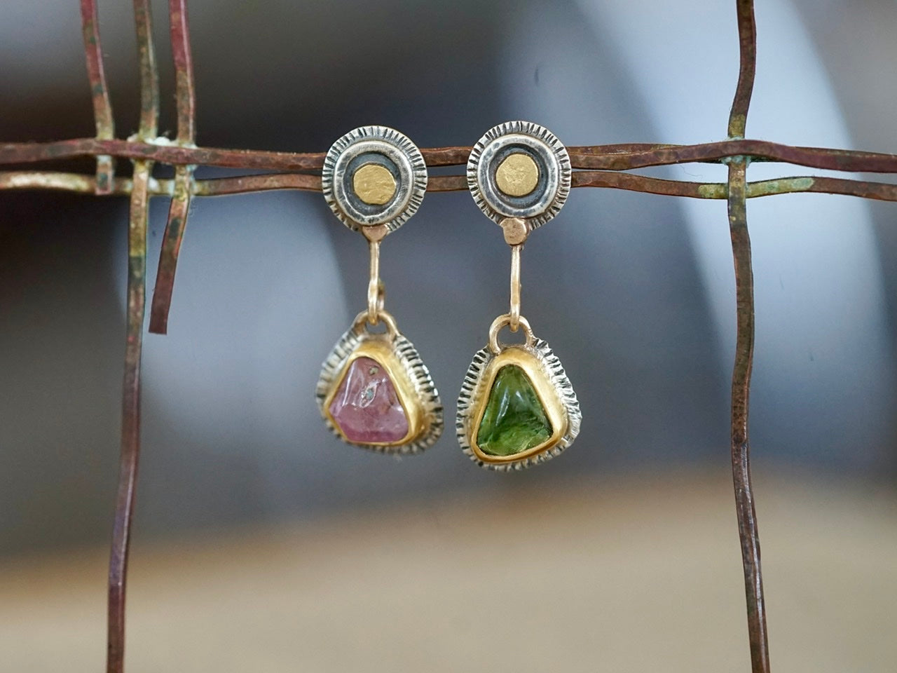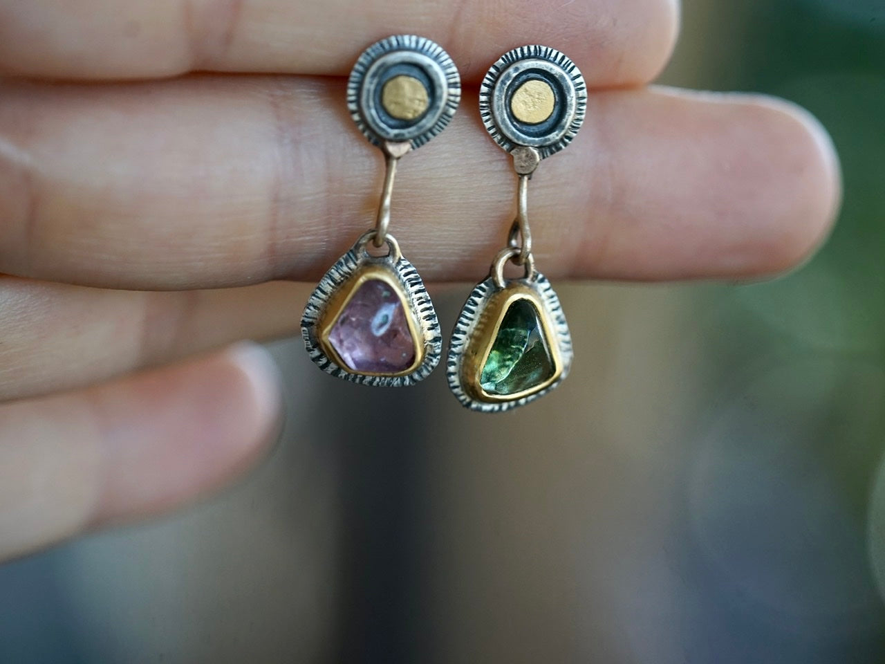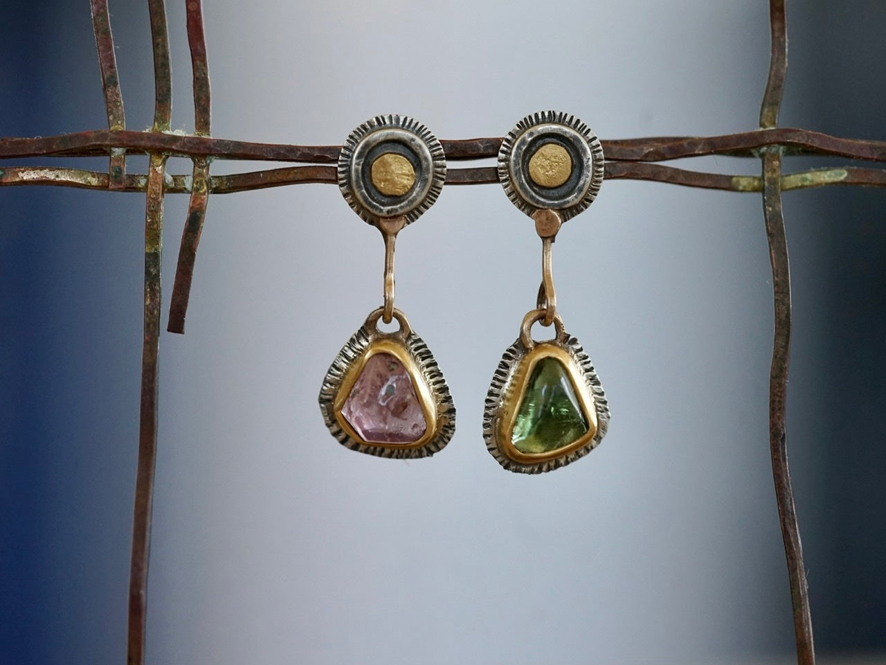 A lavender coloured spinel and a deep green tourmaline were handcarved to organic forms and set in 22k gold to create this one of a kind set. The sterling silver backplates are pierced to allow light shining through the stones. Golden accents add a nice contrast to the color scheme and complement the overall look of this set.