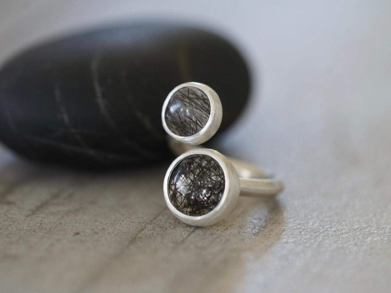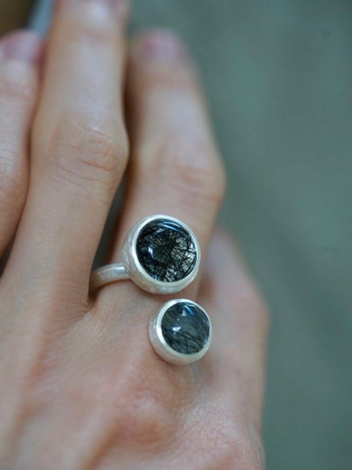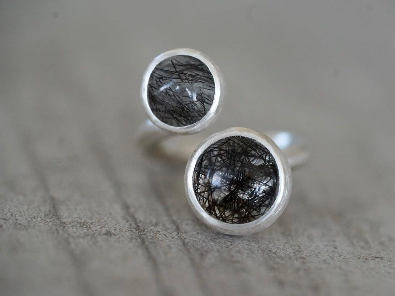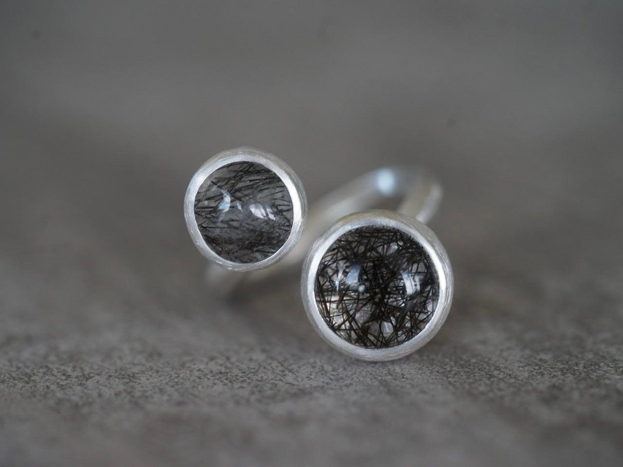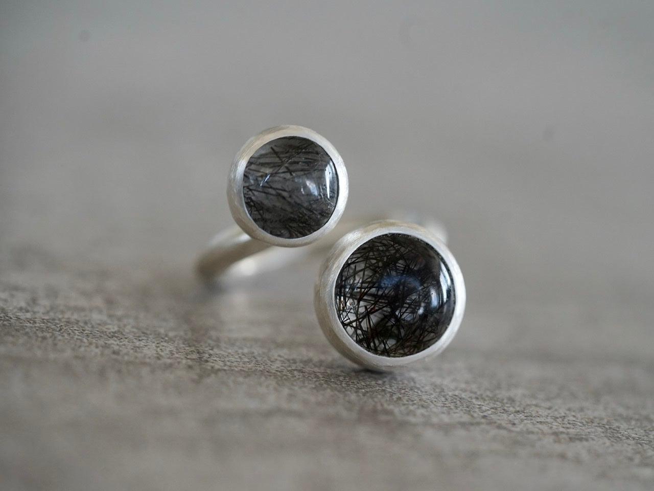 Two black rutilated quartz cabochons, orbiting each other on a spiral shaped sterling silver band, are the focal elements of this ring. This is a modern design, understated and geometrical. A ring that will perfectly complement a contemporary wardrobe, a statement piece that stands for minimalistic simplicity, a quiet yet powerful look. It is marked with my maker stamp and you can find a version featuring golden rutilated quartz on my website.
