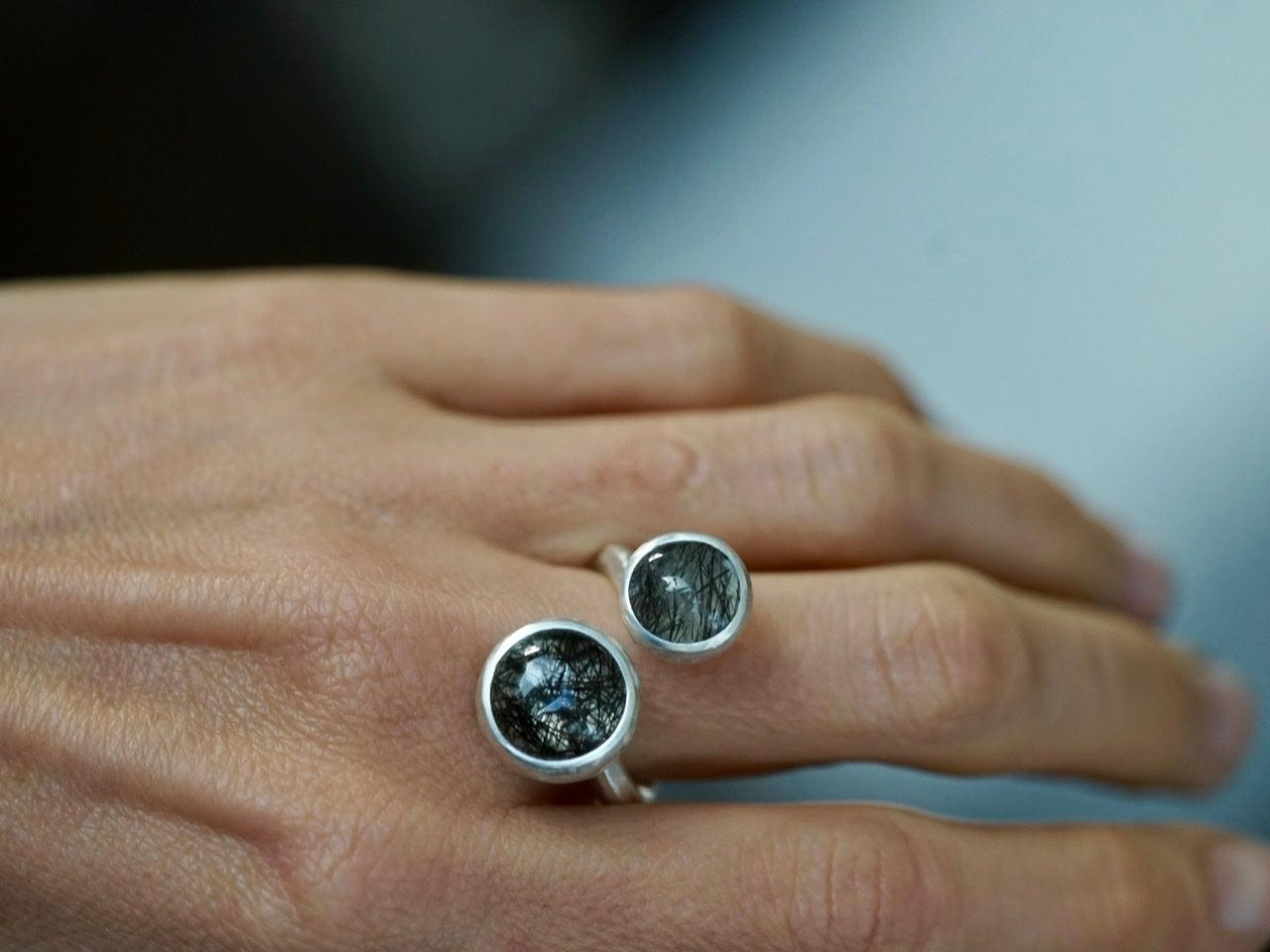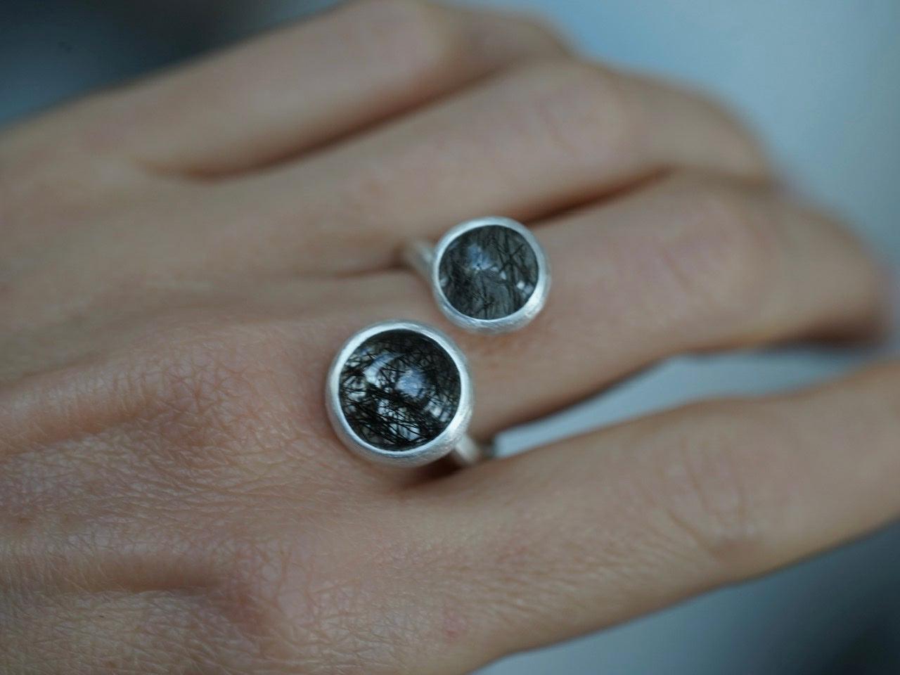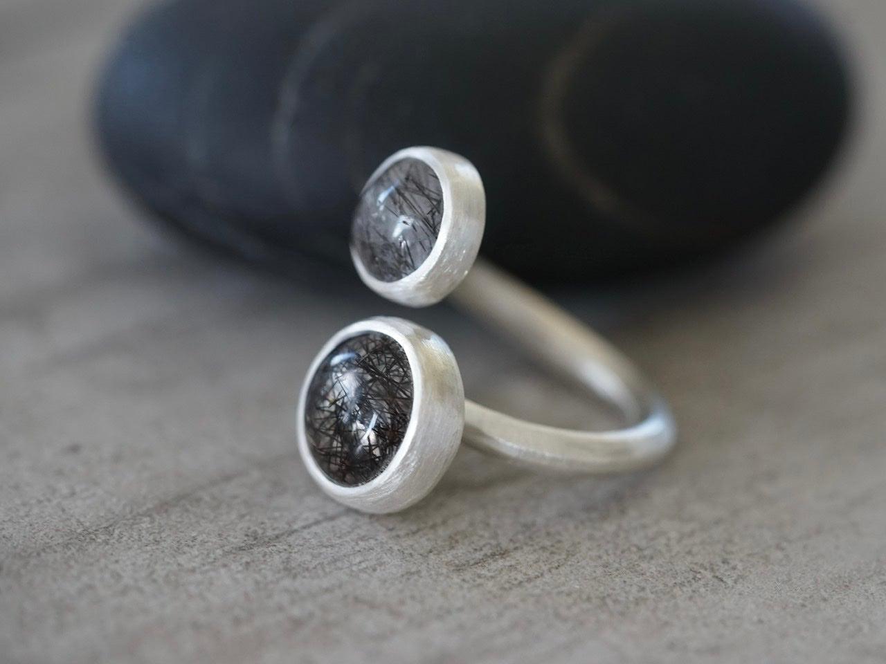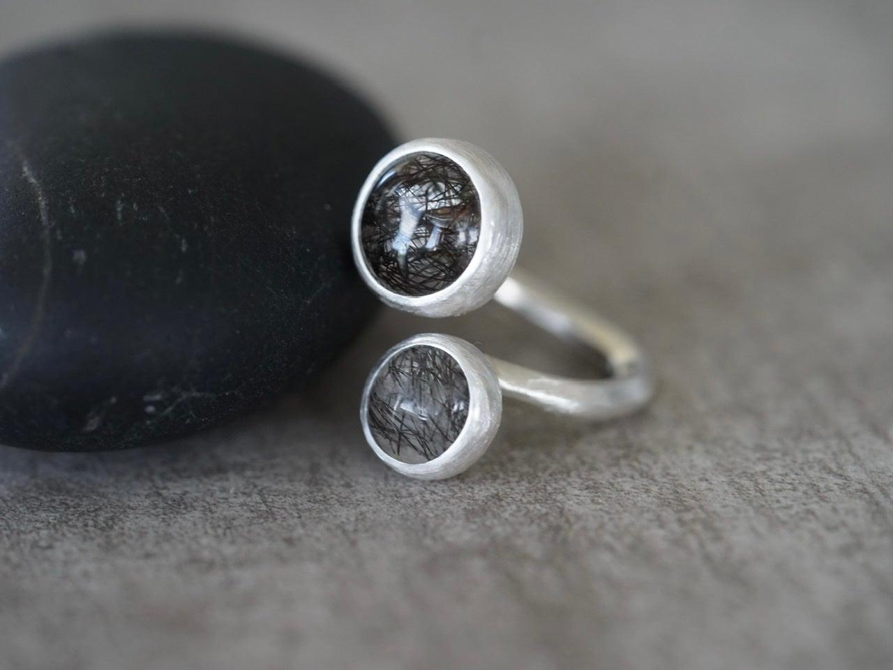 Two black rutilated quartz cabochons, orbiting each other on a spiral shaped sterling silver band, are the focal elements of this ring. This is a modern design, understated and geometrical. A ring that will perfectly complement a contemporary wardrobe, a statement piece that stands for minimalistic simplicity, a quiet yet powerful look. It is marked with my maker stamp and you can find a version featuring golden rutilated quartz on my website.