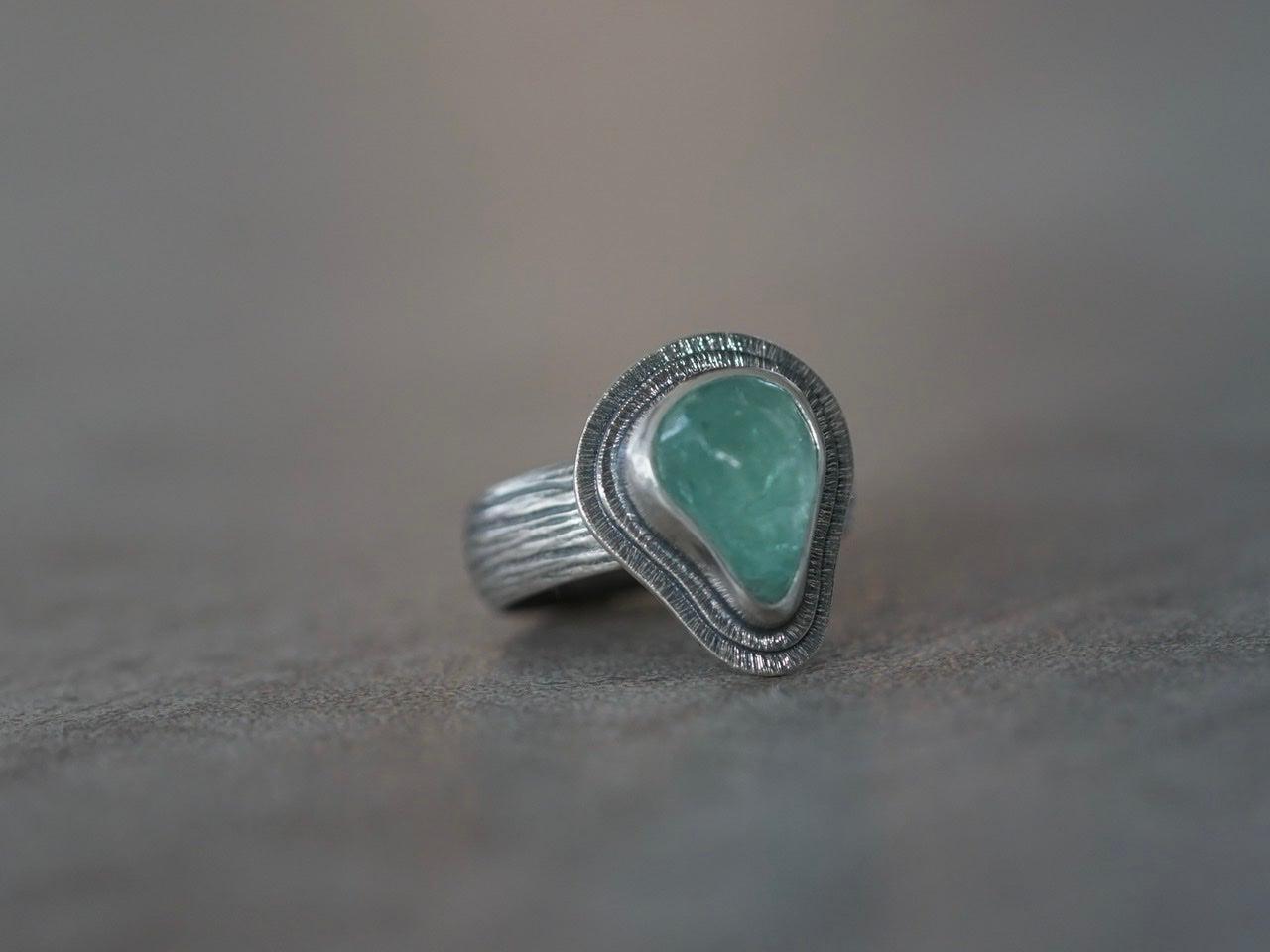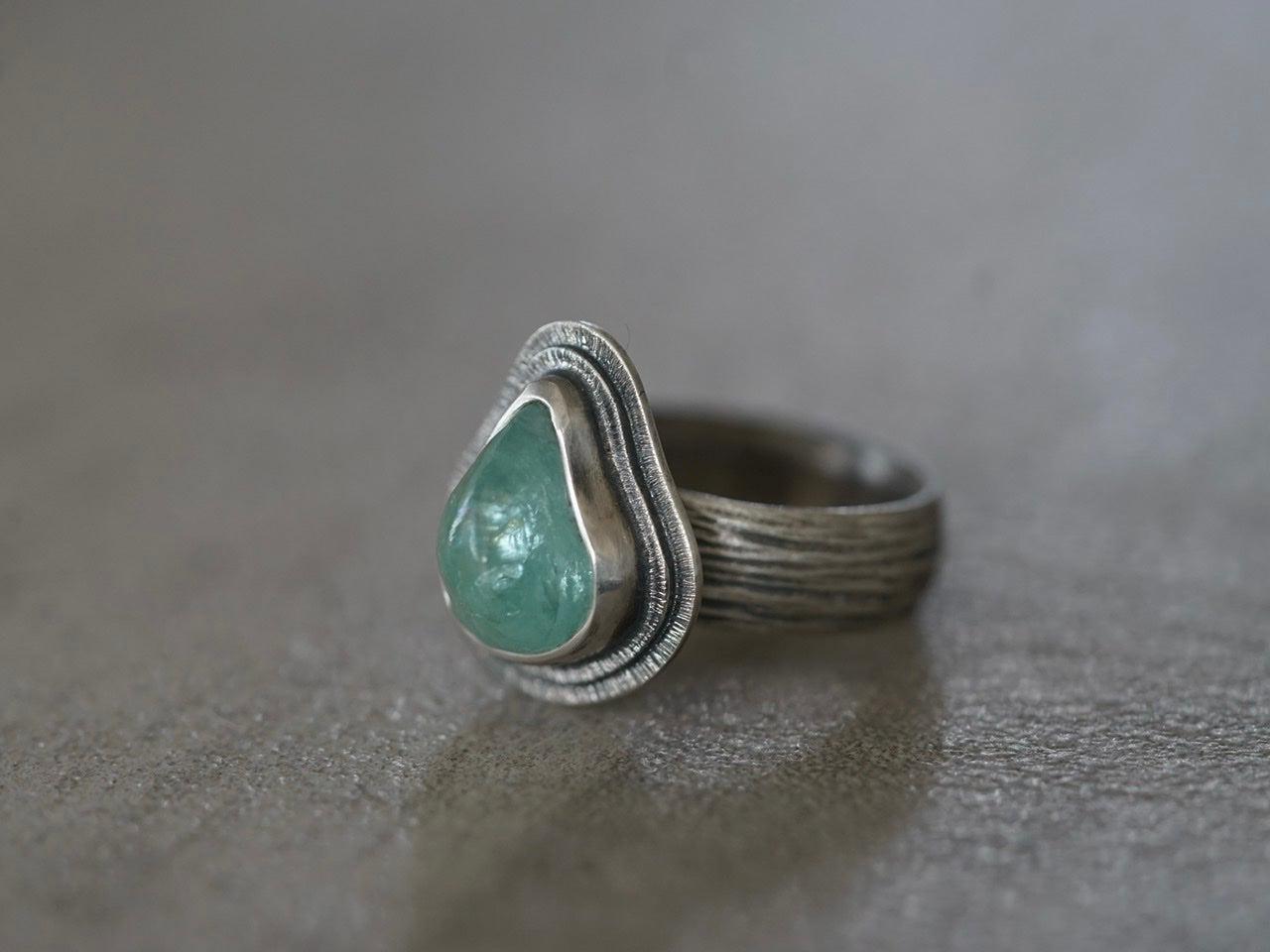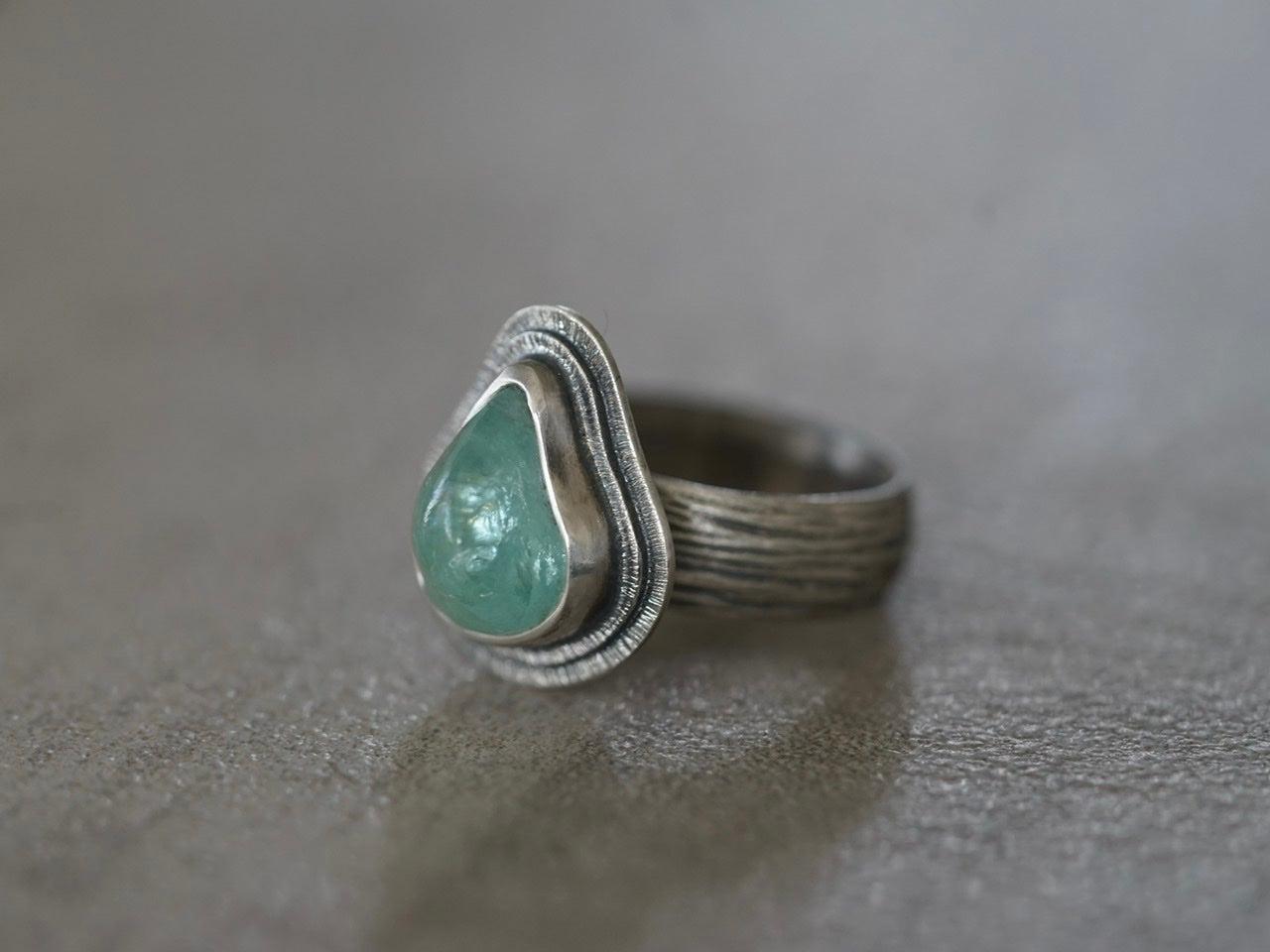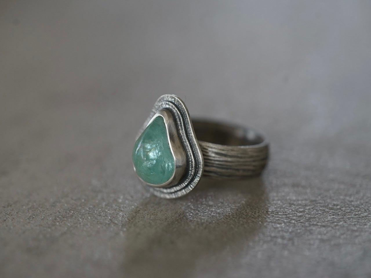 A hand-carved aqua blue tourmaline, shaped from a rough crystal, is the focal element of this ring. Set in fine silver, it sits on a layered and textured sterling silver backplate. The substantial, carved sterling silver band completes the look. The setting is slightly raised to allow for easy stacking. As most mazulou items this ring is one of a kind.