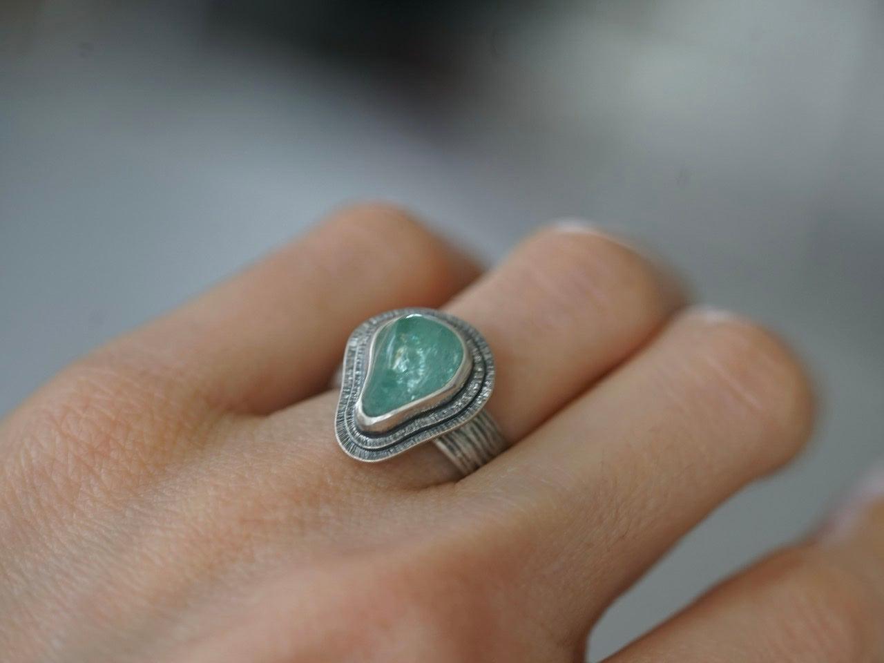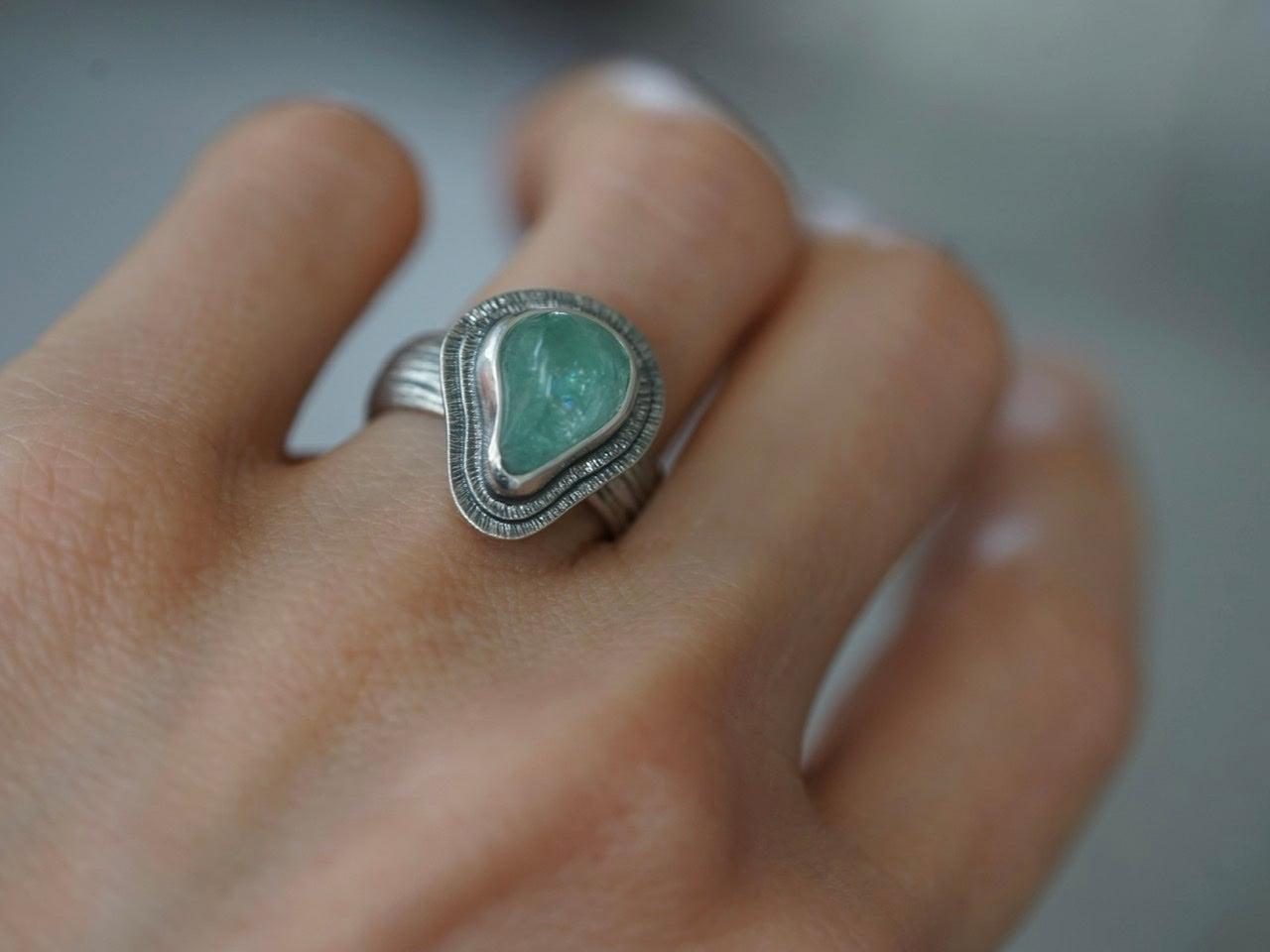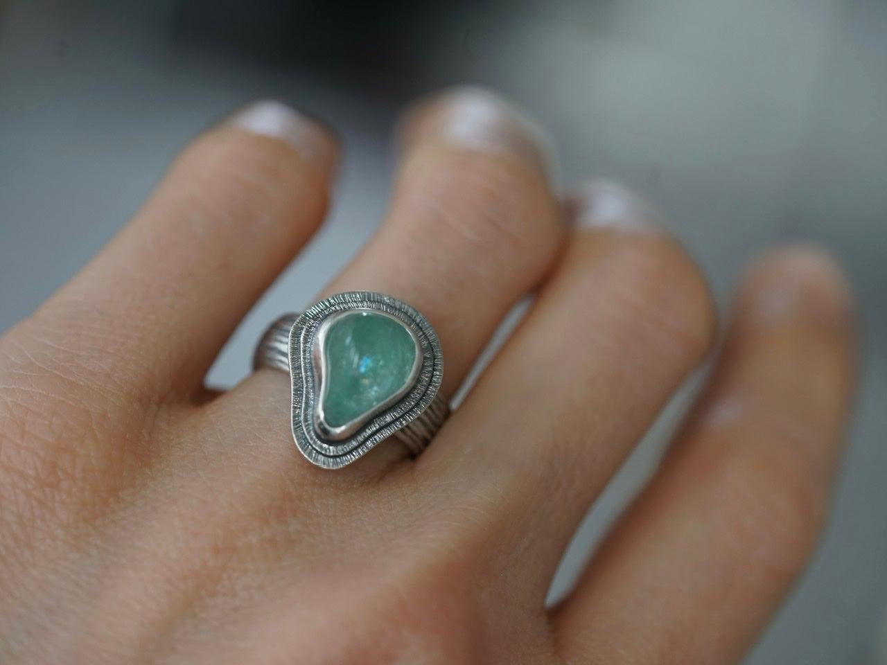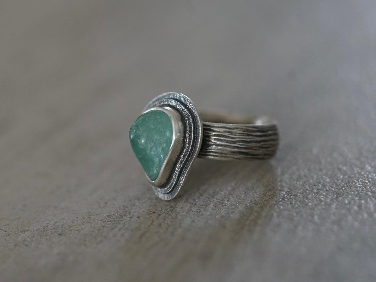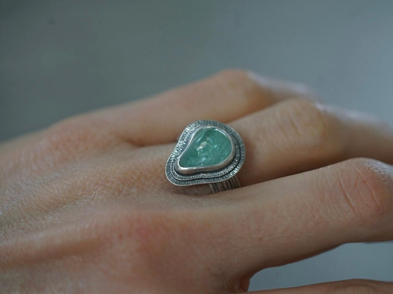 A hand-carved aqua blue tourmaline, shaped from a rough crystal, is the focal element of this ring. Set in fine silver, it sits on a layered and textured sterling silver backplate. The substantial, carved sterling silver band completes the look. The setting is slightly raised to allow for easy stacking. As most mazulou items this ring is one of a kind.