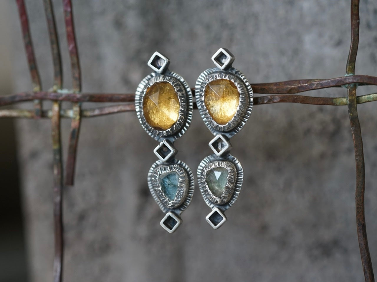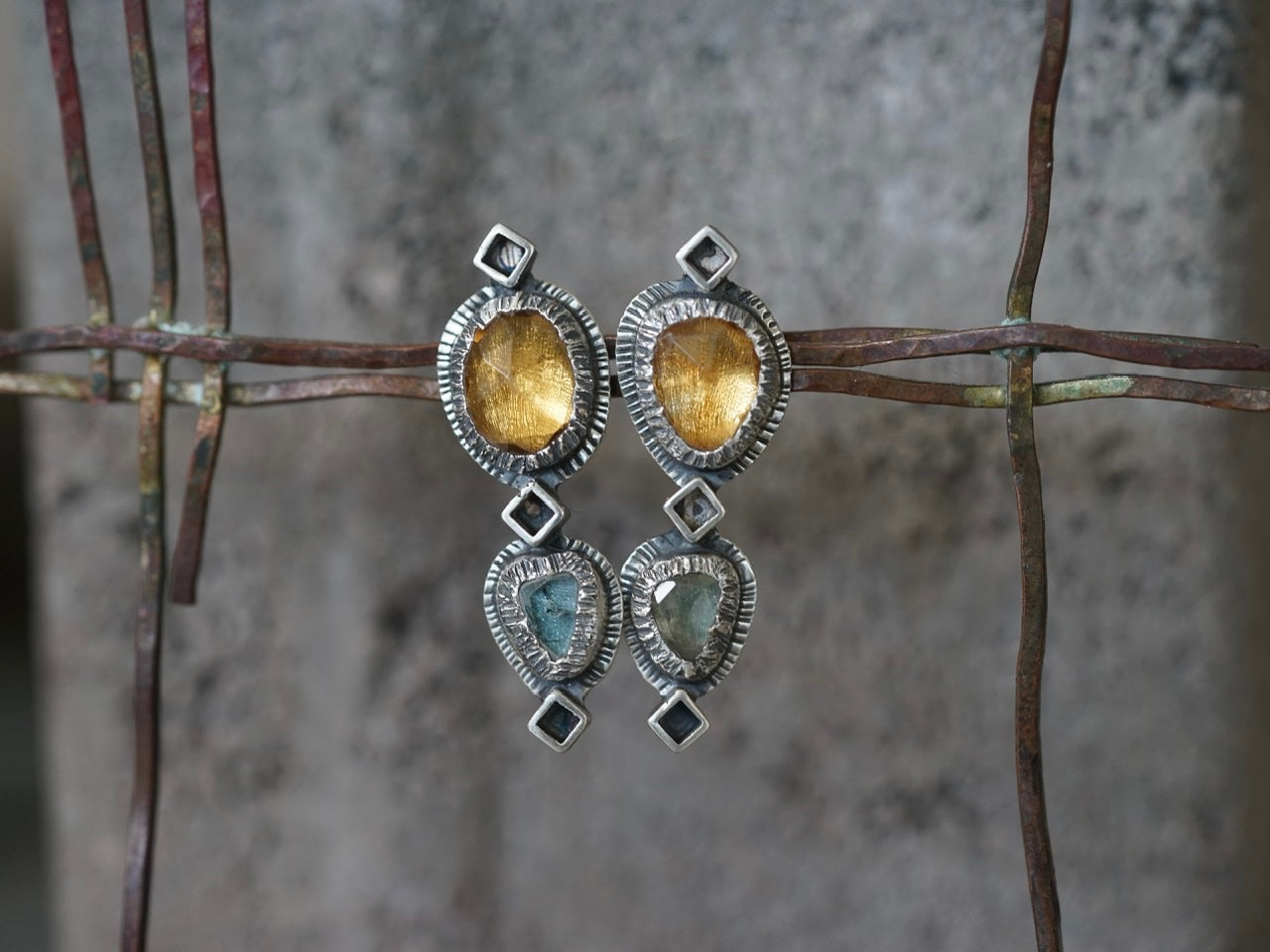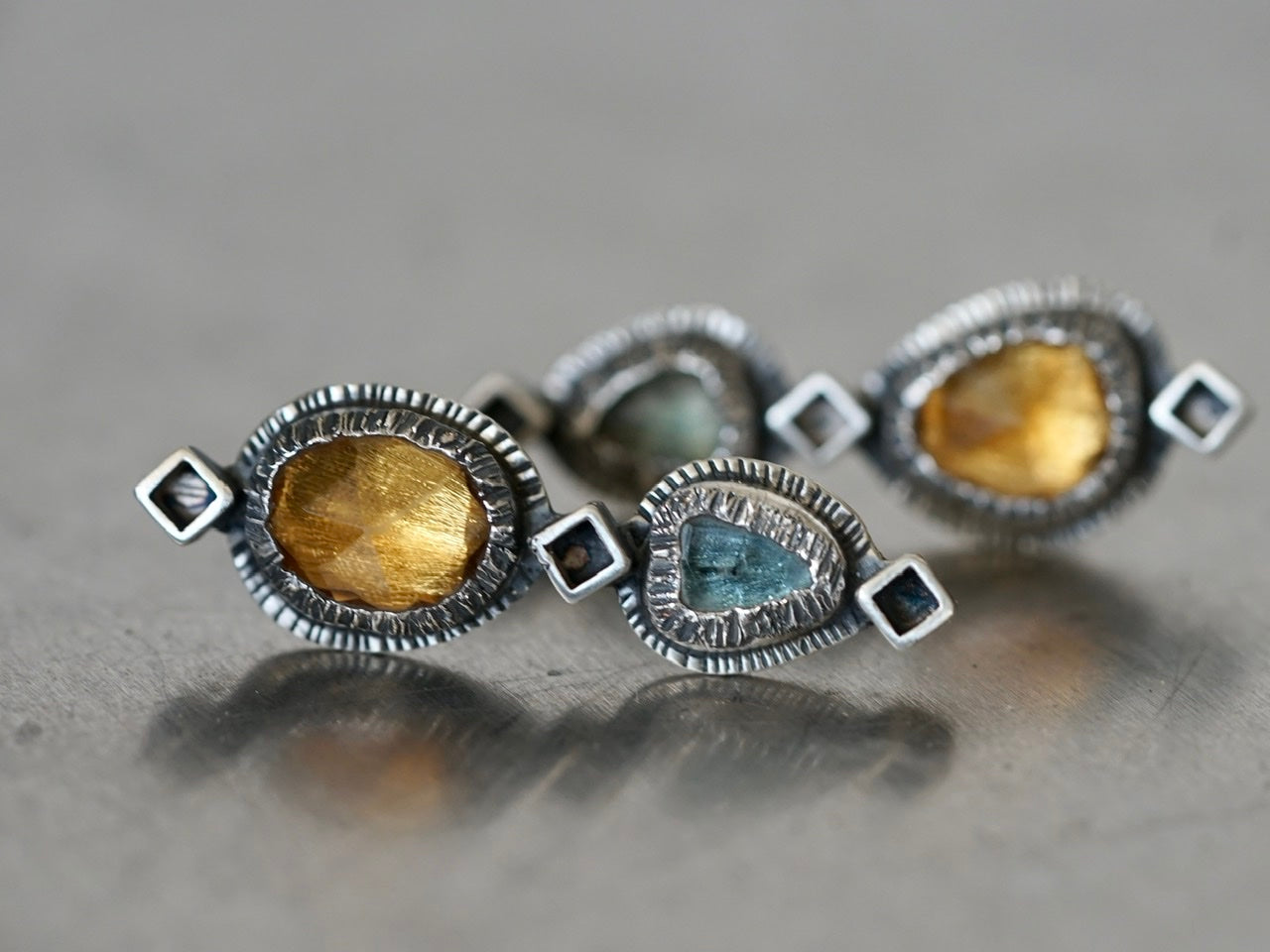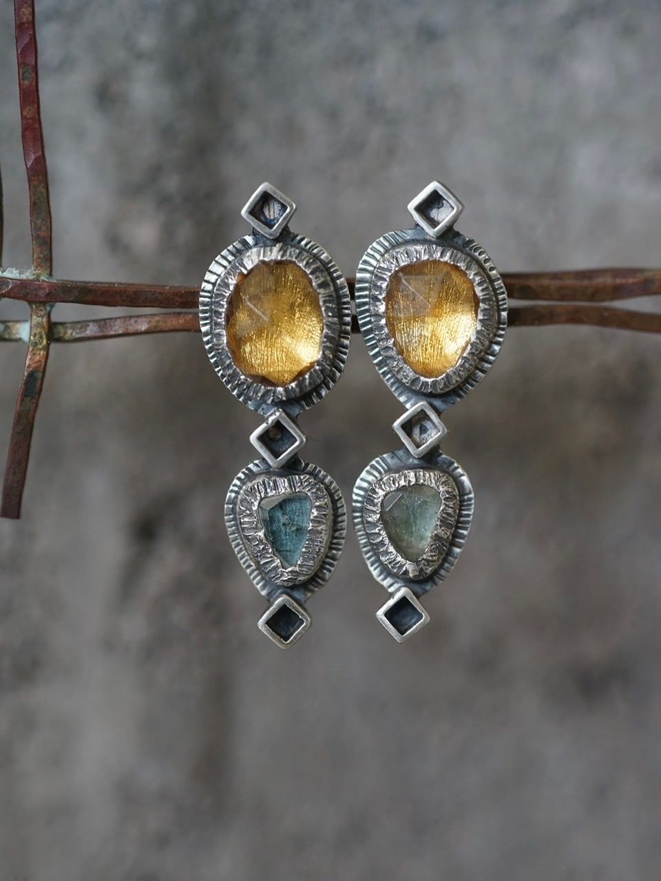 These earrings feature golden coloured, rose cut citrines and blue-green tourmalines, set in richly textured fine silver. The stones are not calibrated and slightly asymmetrical, the little sterling elements anchor the design, the hand textured sterling backplates complement the look.