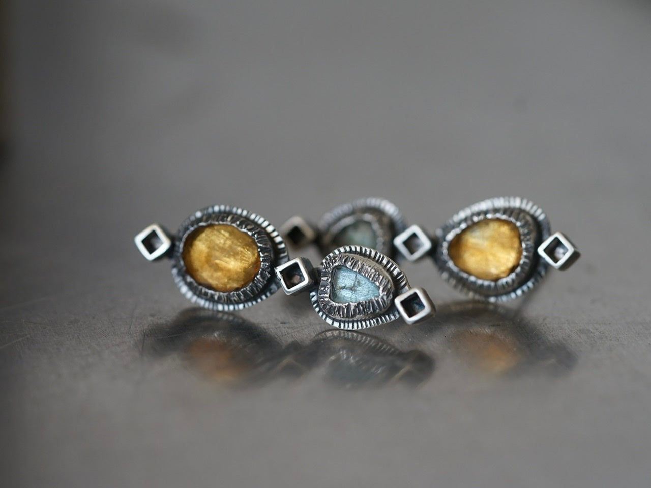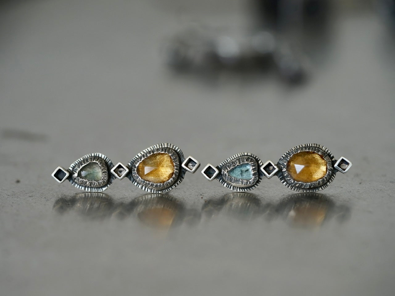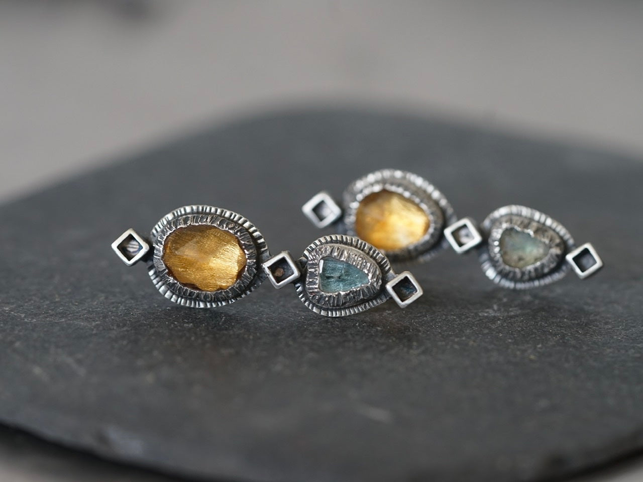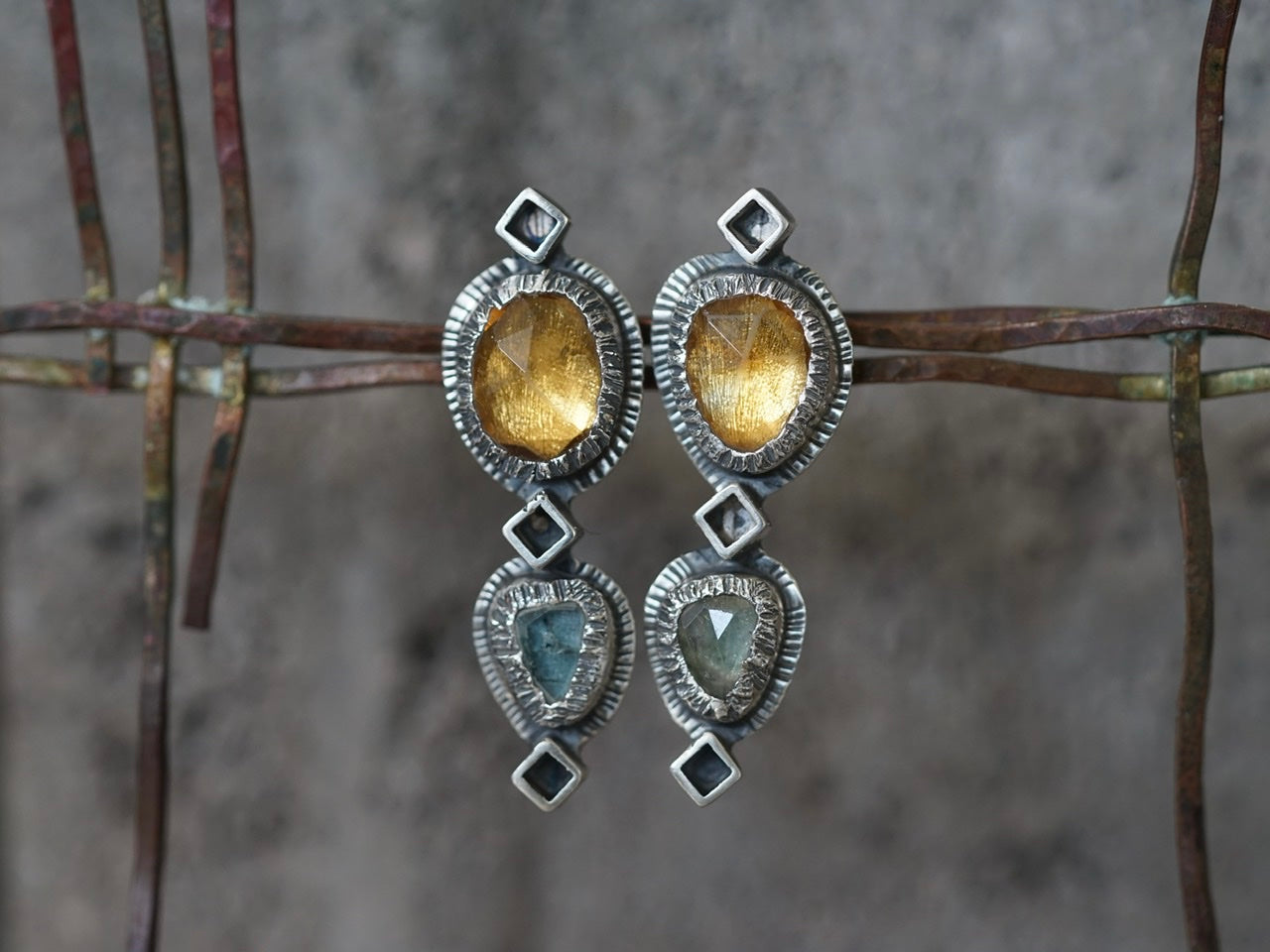 These earrings feature golden coloured, rose cut citrines and blue-green tourmalines, set in richly textured fine silver. The stones are not calibrated and slightly asymmetrical, the little sterling elements anchor the design, the hand textured sterling backplates complement the look.