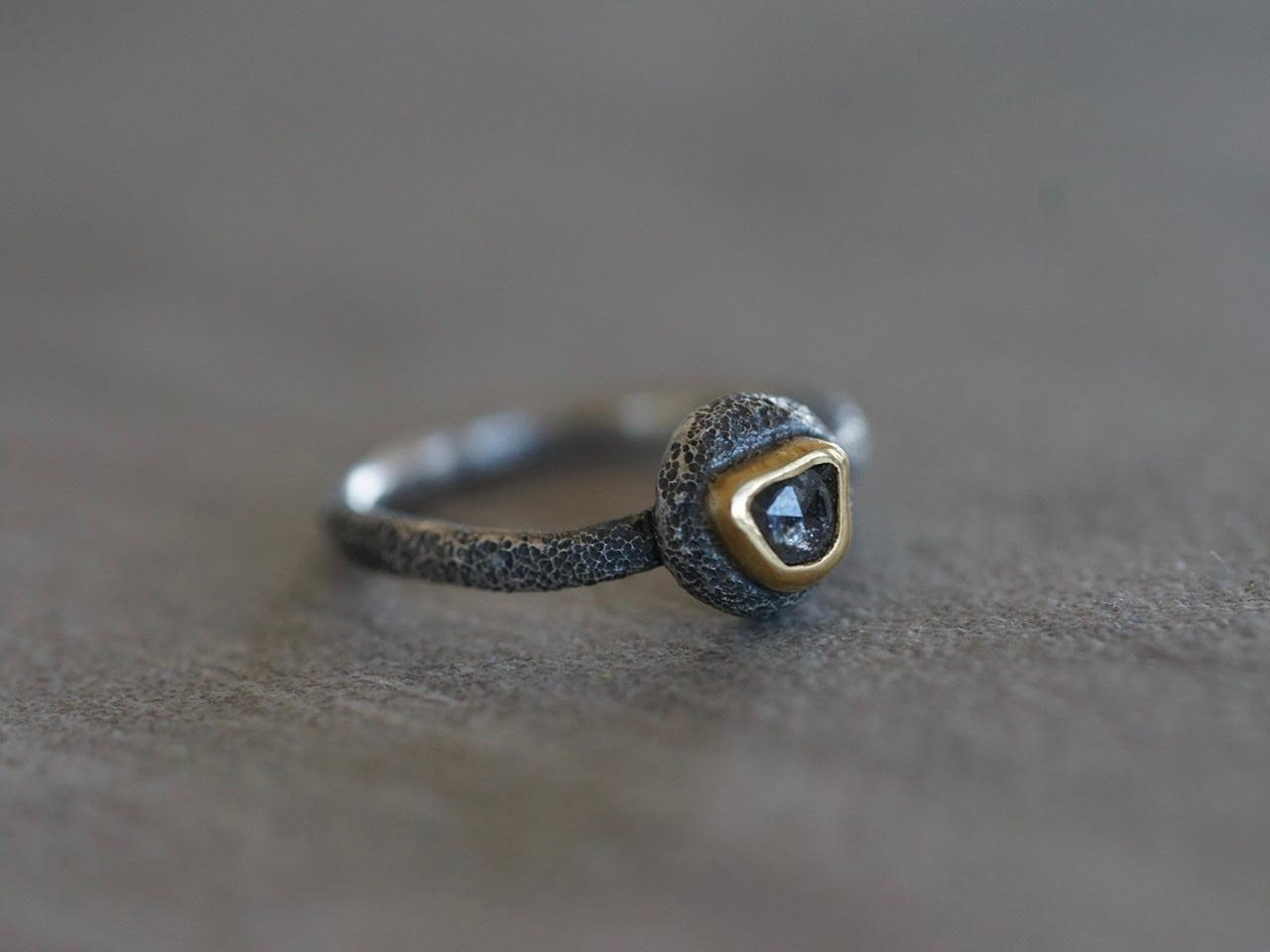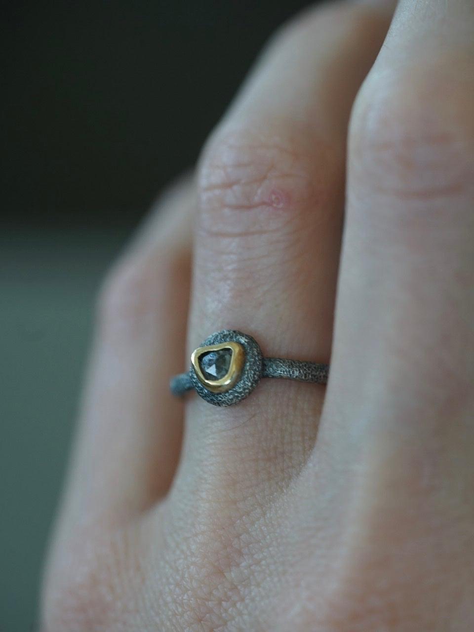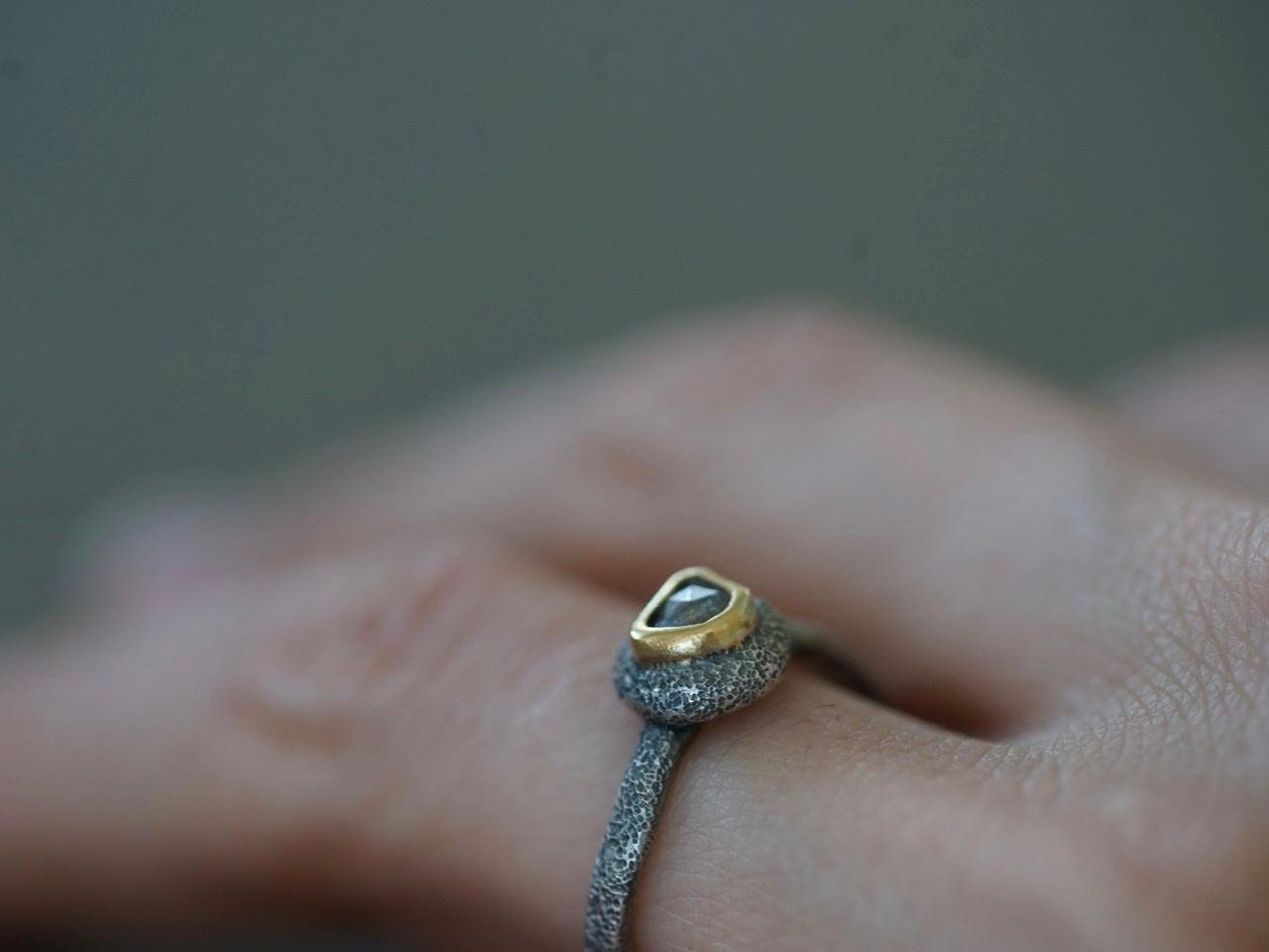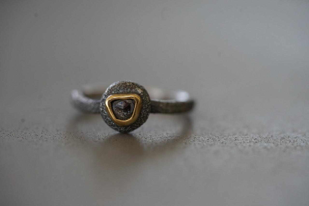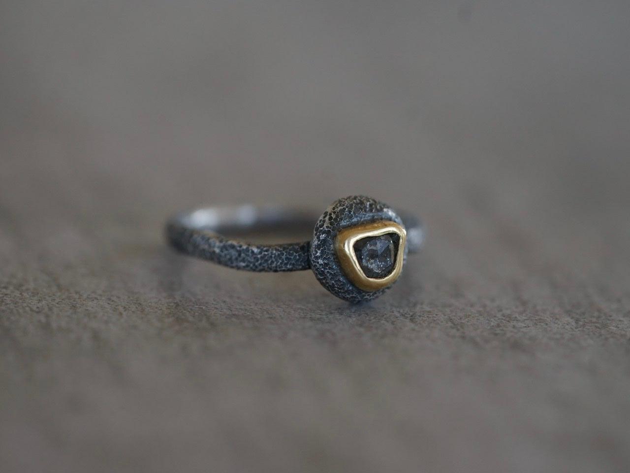 A small brown diamond, irregularly cut to an organic shape, was set in 22k gold on a textured pebble shaped sterling silver backing. The slim band gives this ring a delicate look, the rich gold bezel combines beautifully with the warm tones of the diamond. This is a minimalist piece that makes a statement, it can be worn solo or stacked with other rings.