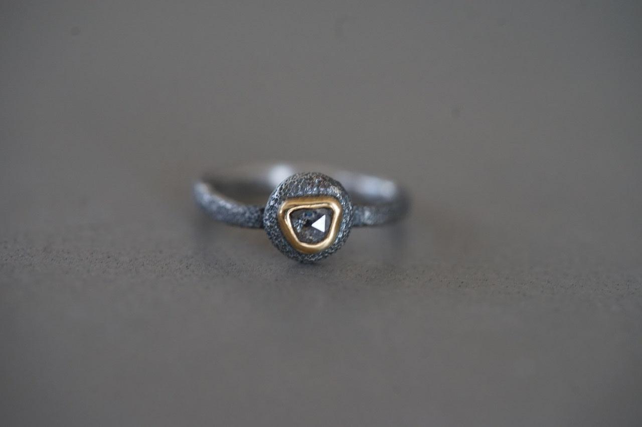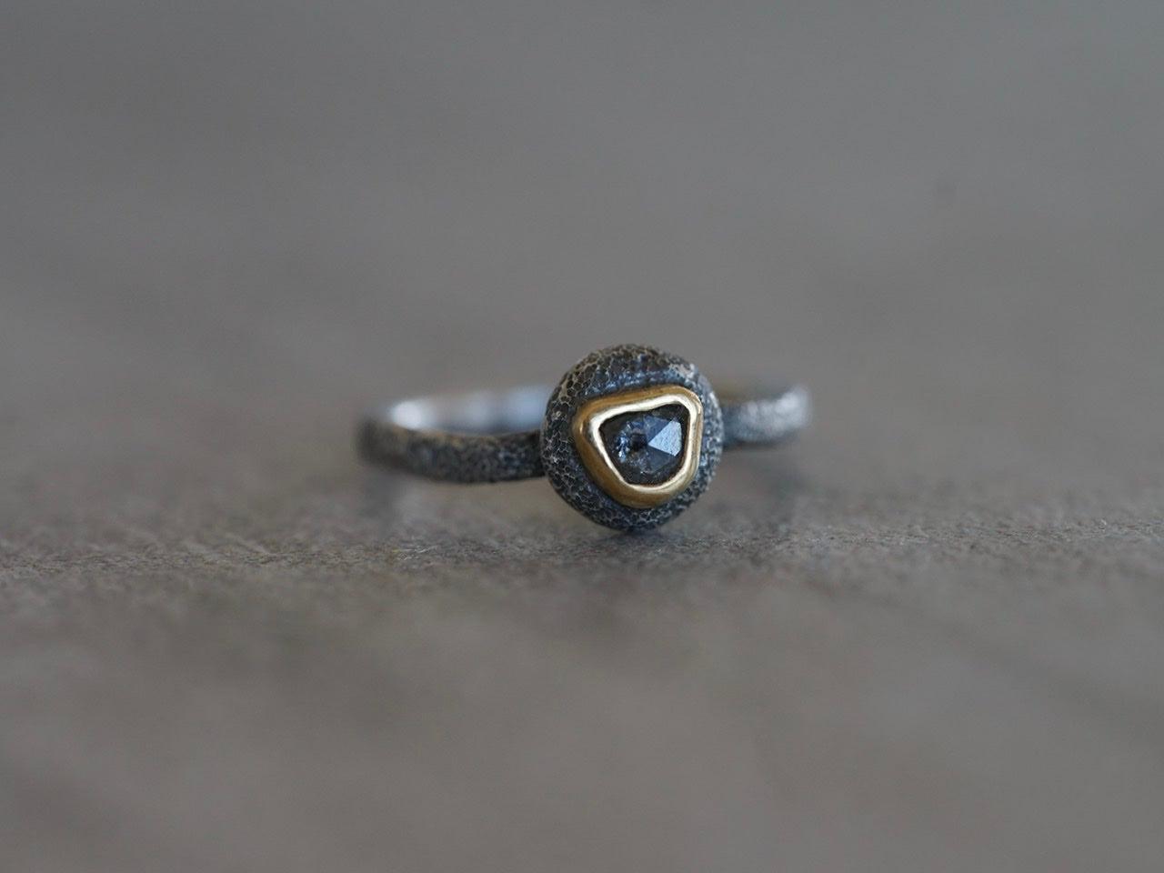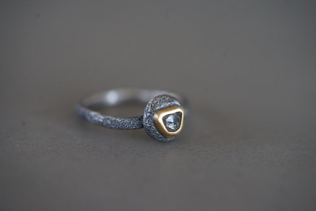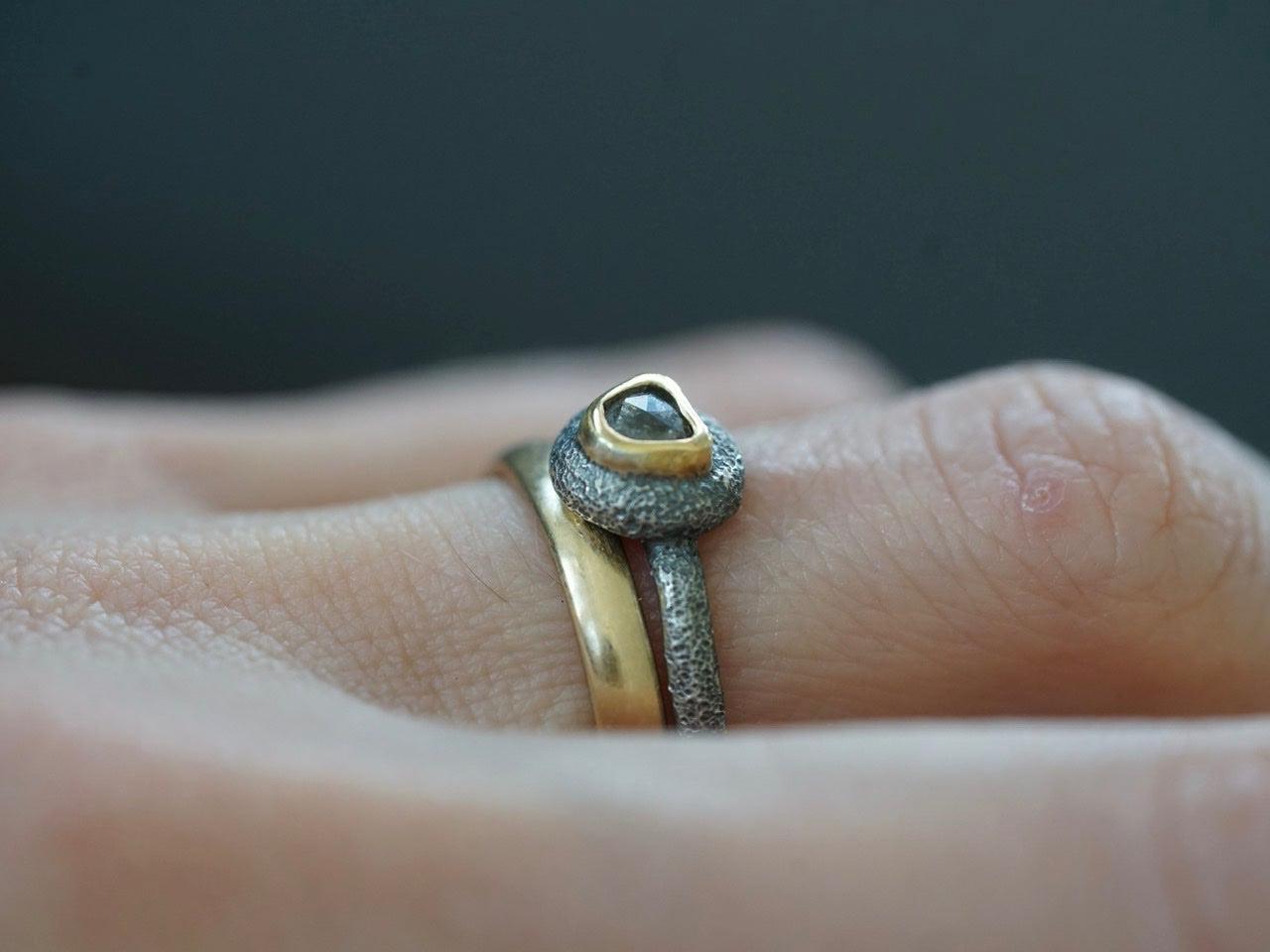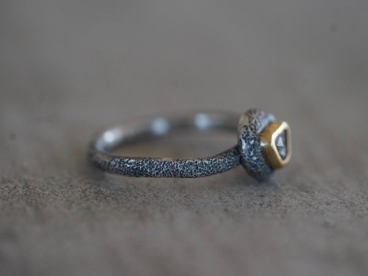A small brown diamond, irregularly cut to an organic shape, was set in 22k gold on a textured pebble shaped sterling silver backing. The slim band gives this ring a delicate look, the rich gold bezel combines beautifully with the warm tones of the diamond. This is a minimalist piece that makes a statement, it can be worn solo or stacked with other rings.