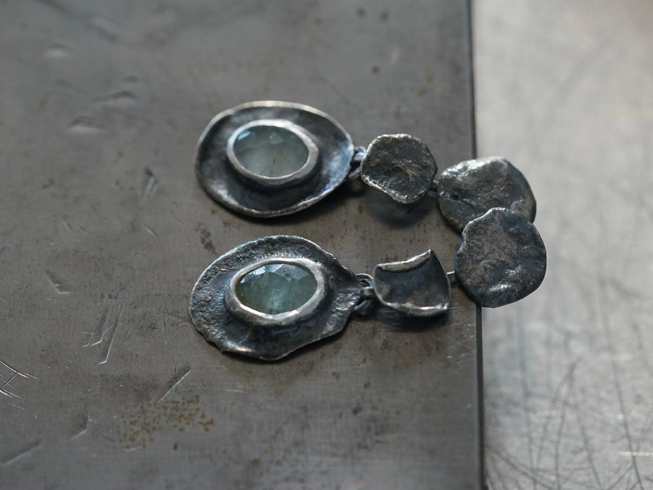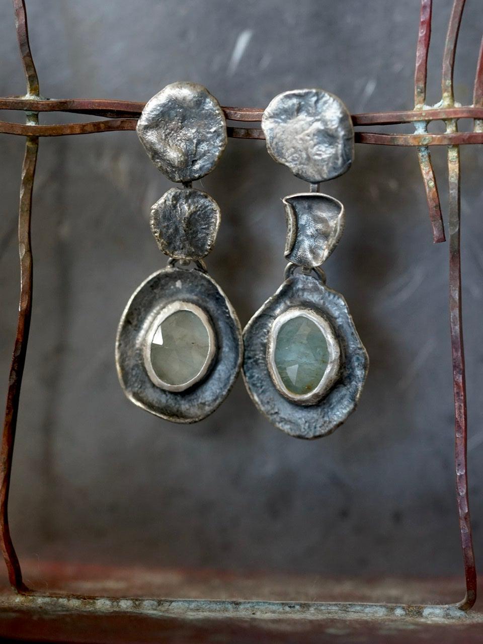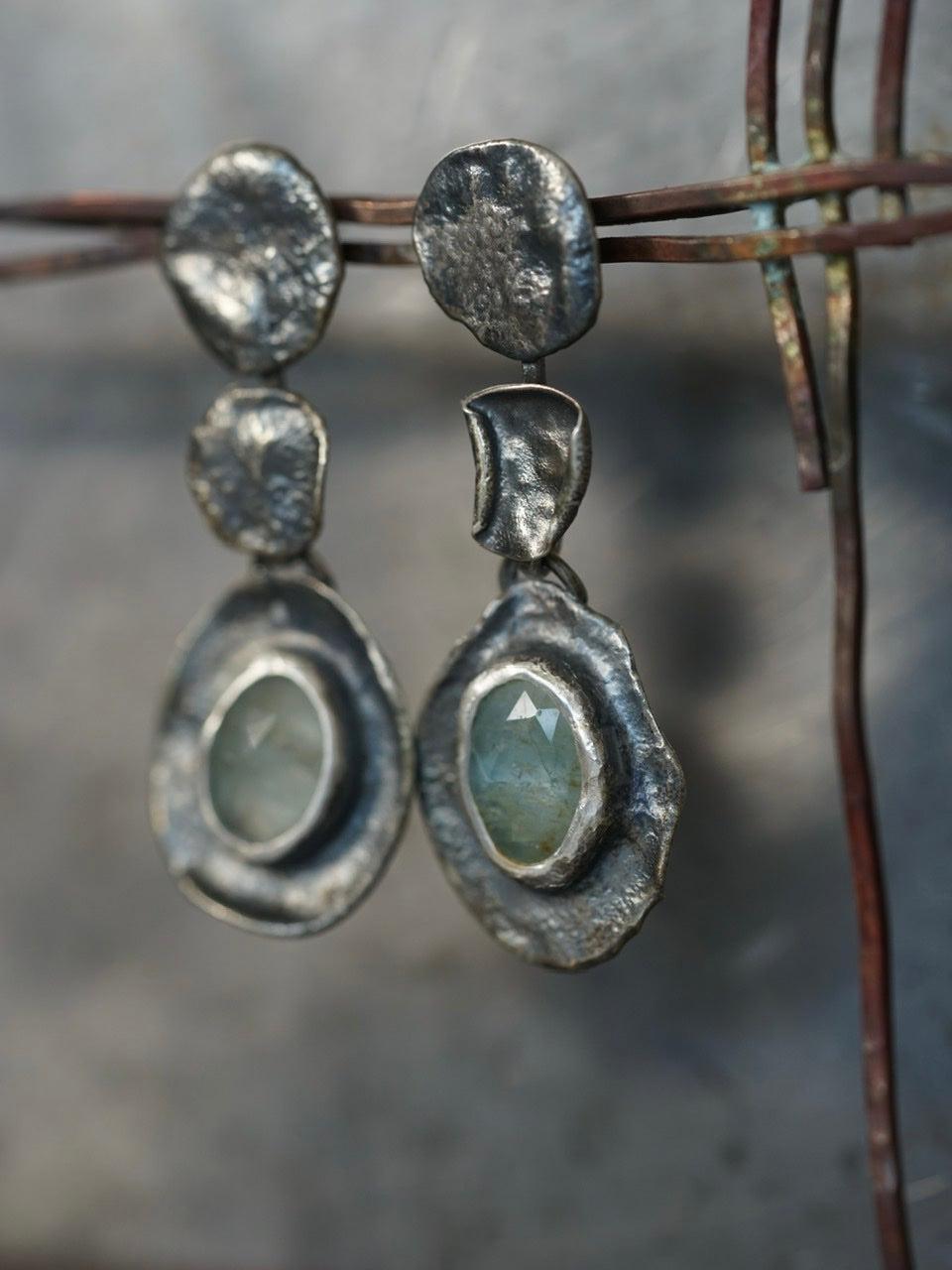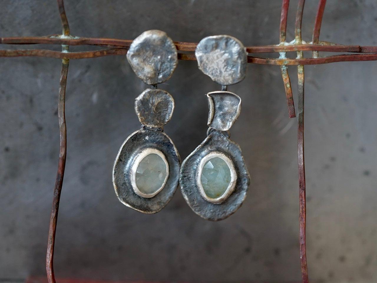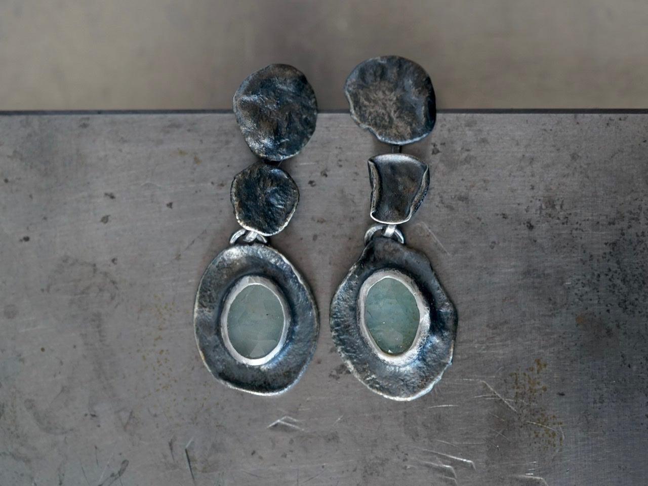 Melted silver earrings, embellished with stones, linked with creativity, waiting to be enjoyed.