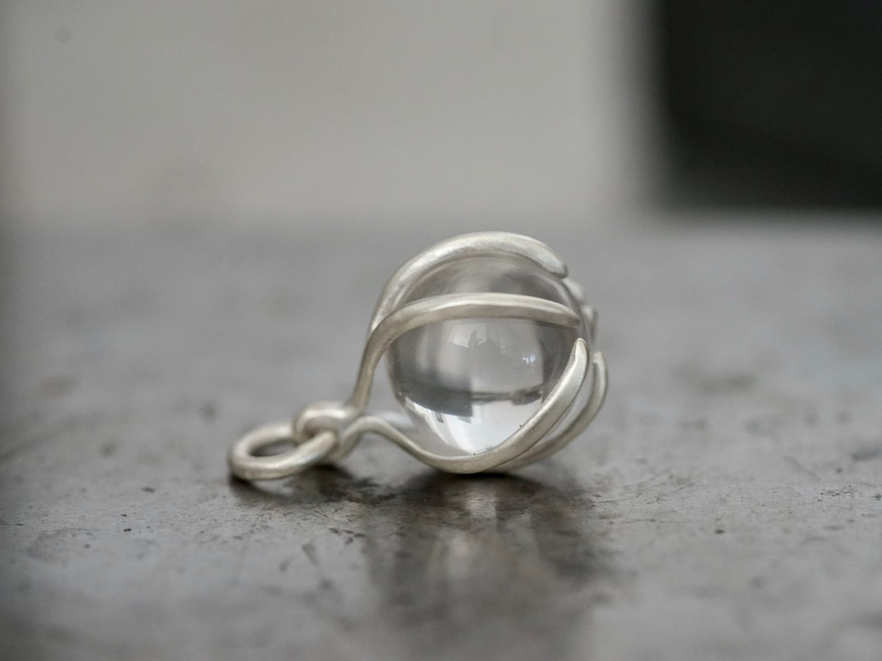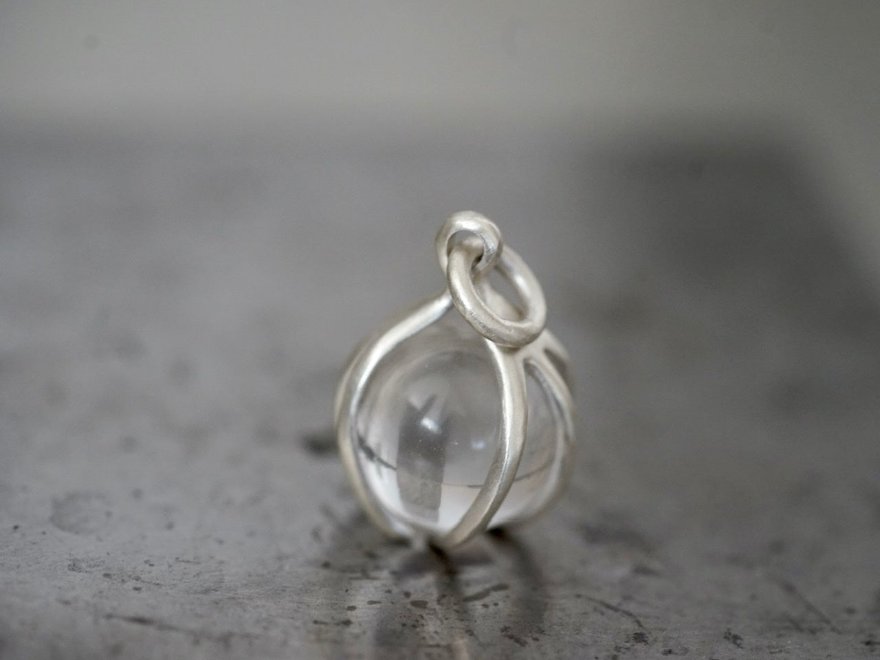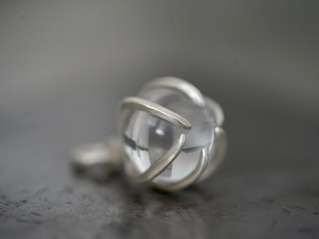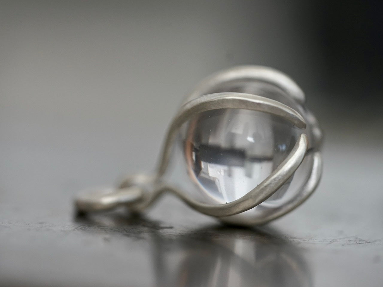 A clear Quarz sphere is gently held by hand-carved sterling silver prongs, allowing the little globe to be spinned if you feel fidgety.