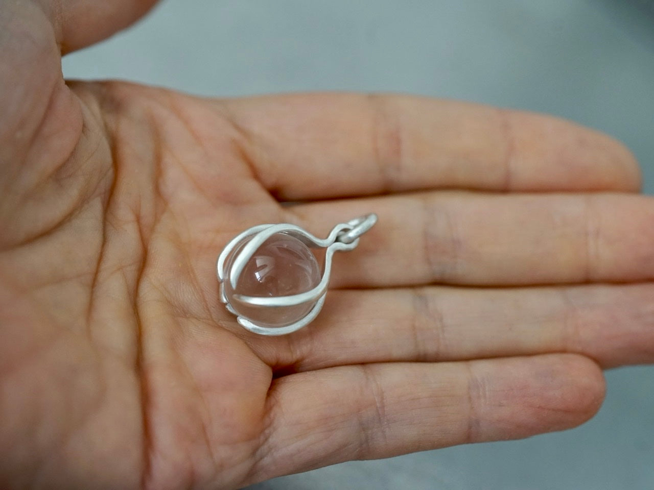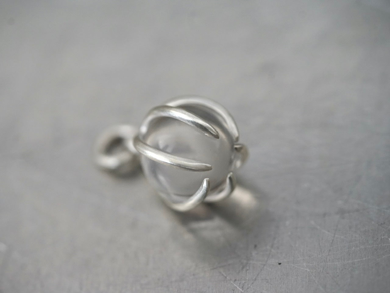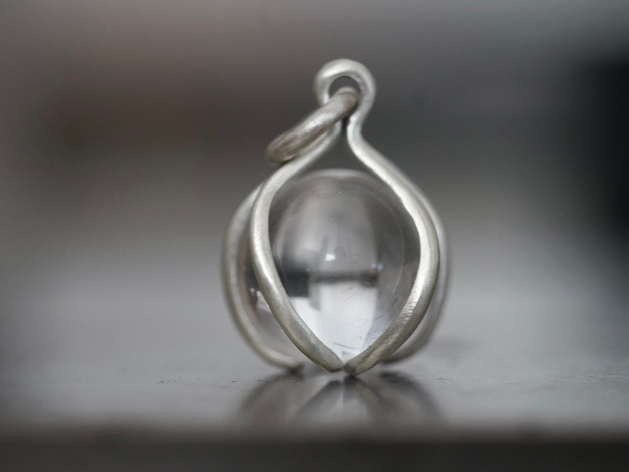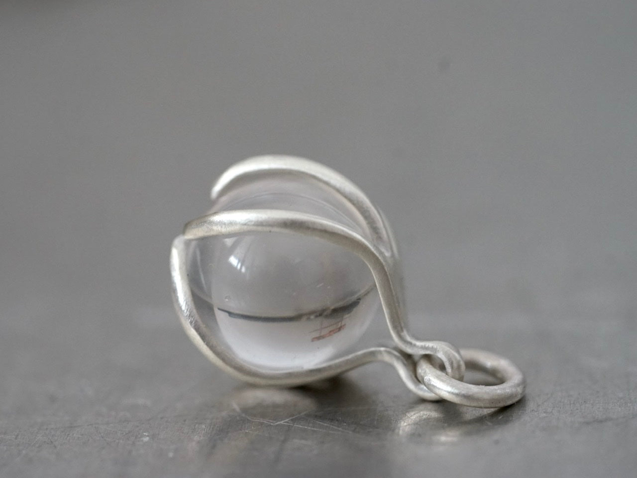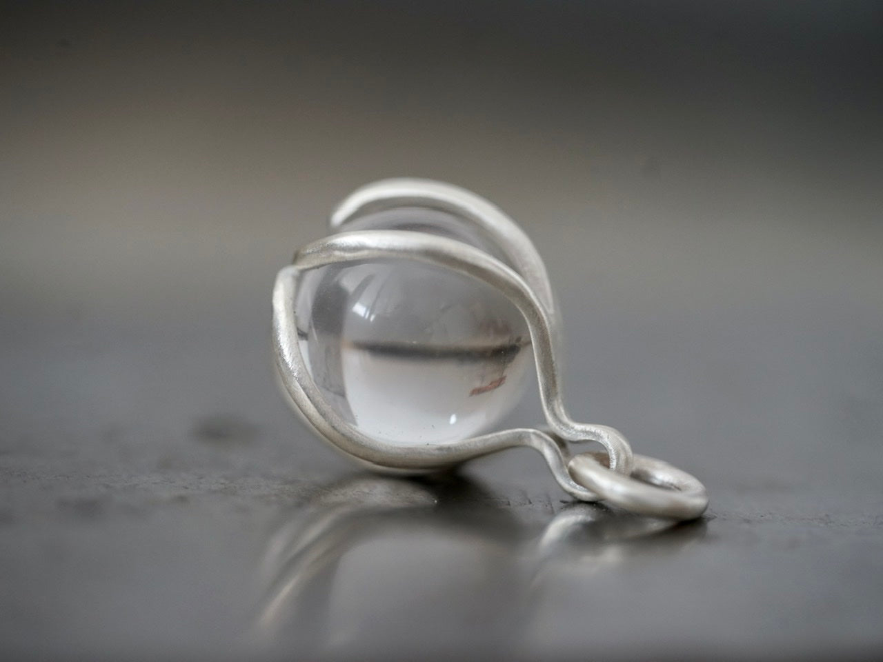 A clear Quarz sphere is gently held by hand-carved sterling silver prongs, allowing the little globe to be spinned if you feel fidgety.