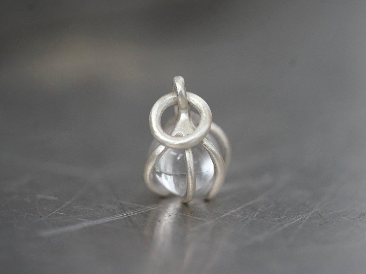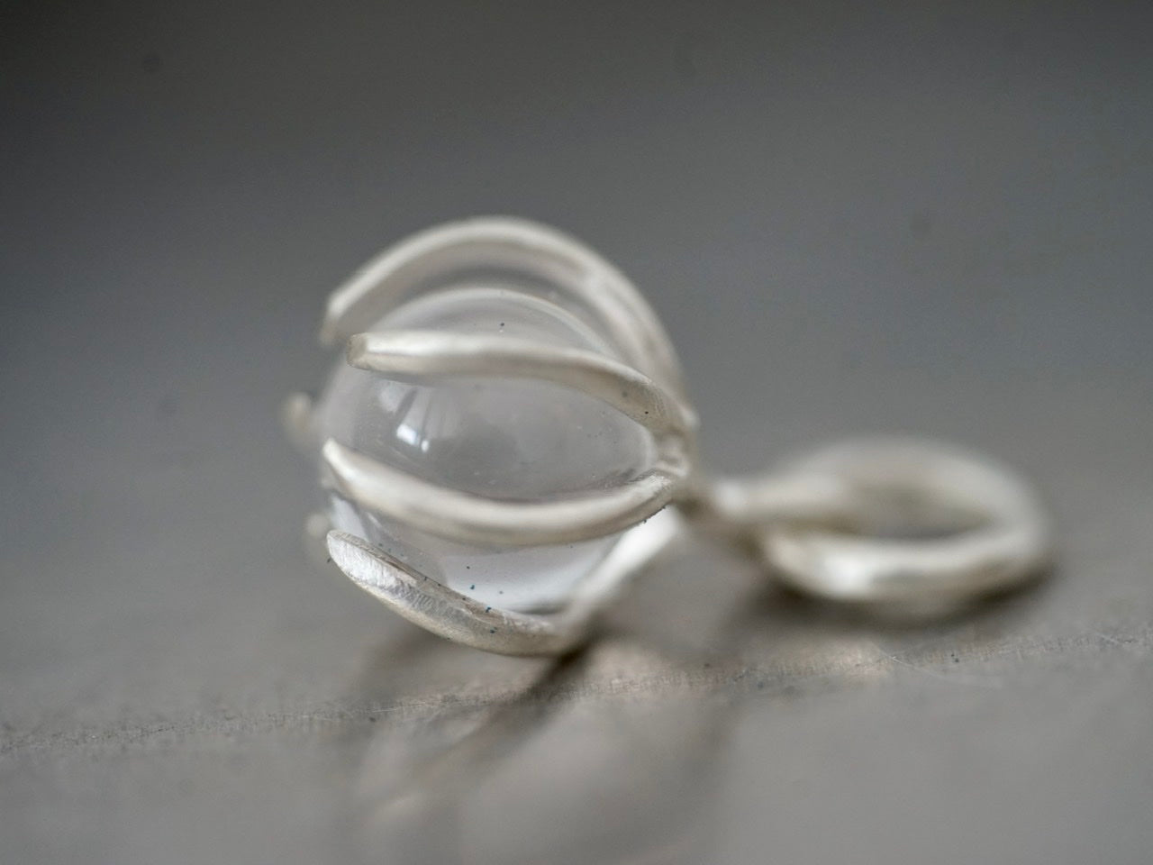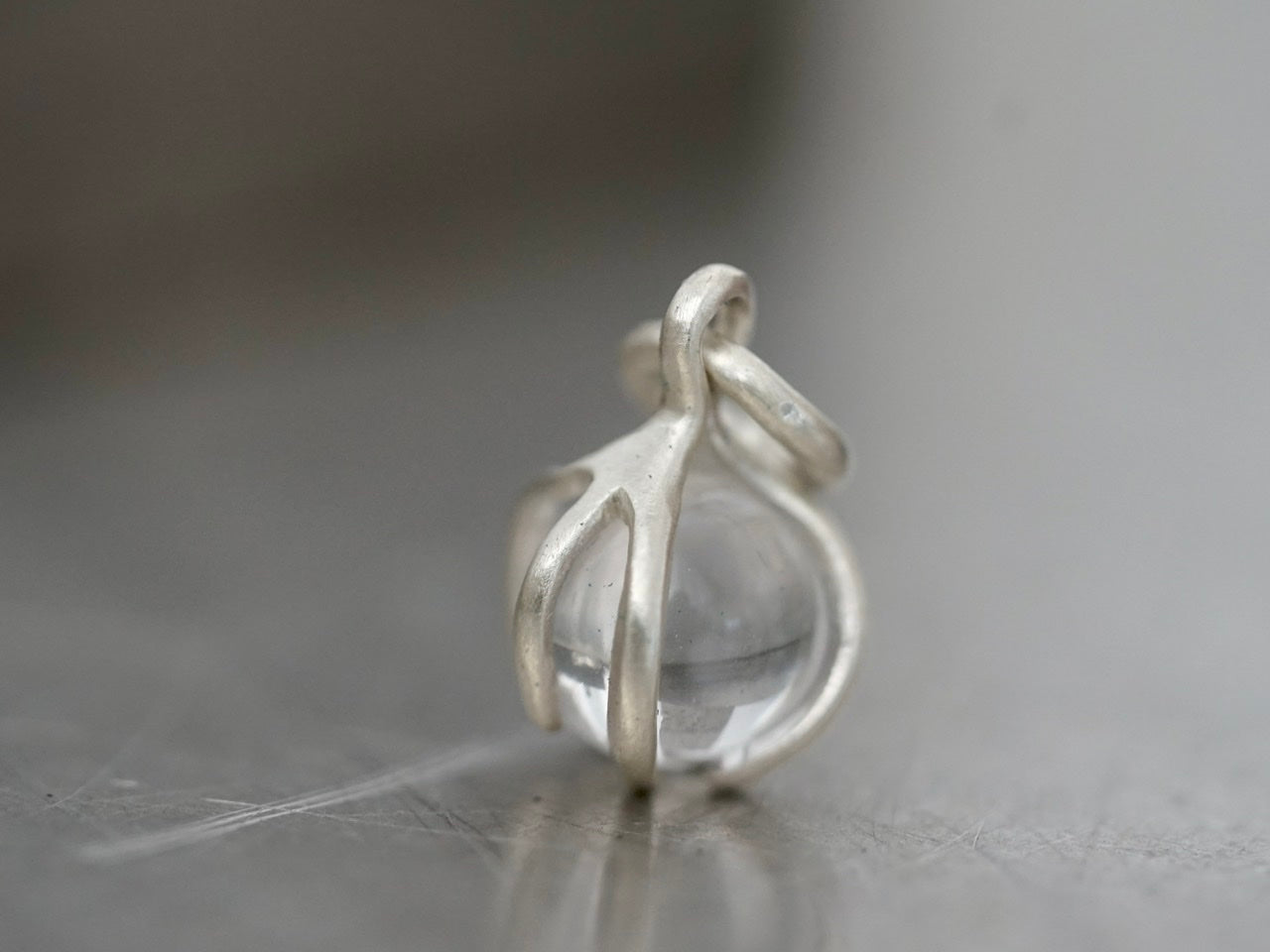A clear Quarz sphere is gently held by hand-carved sterling silver prongs, allowing the little globe to be spinned if you feel fidgety.
