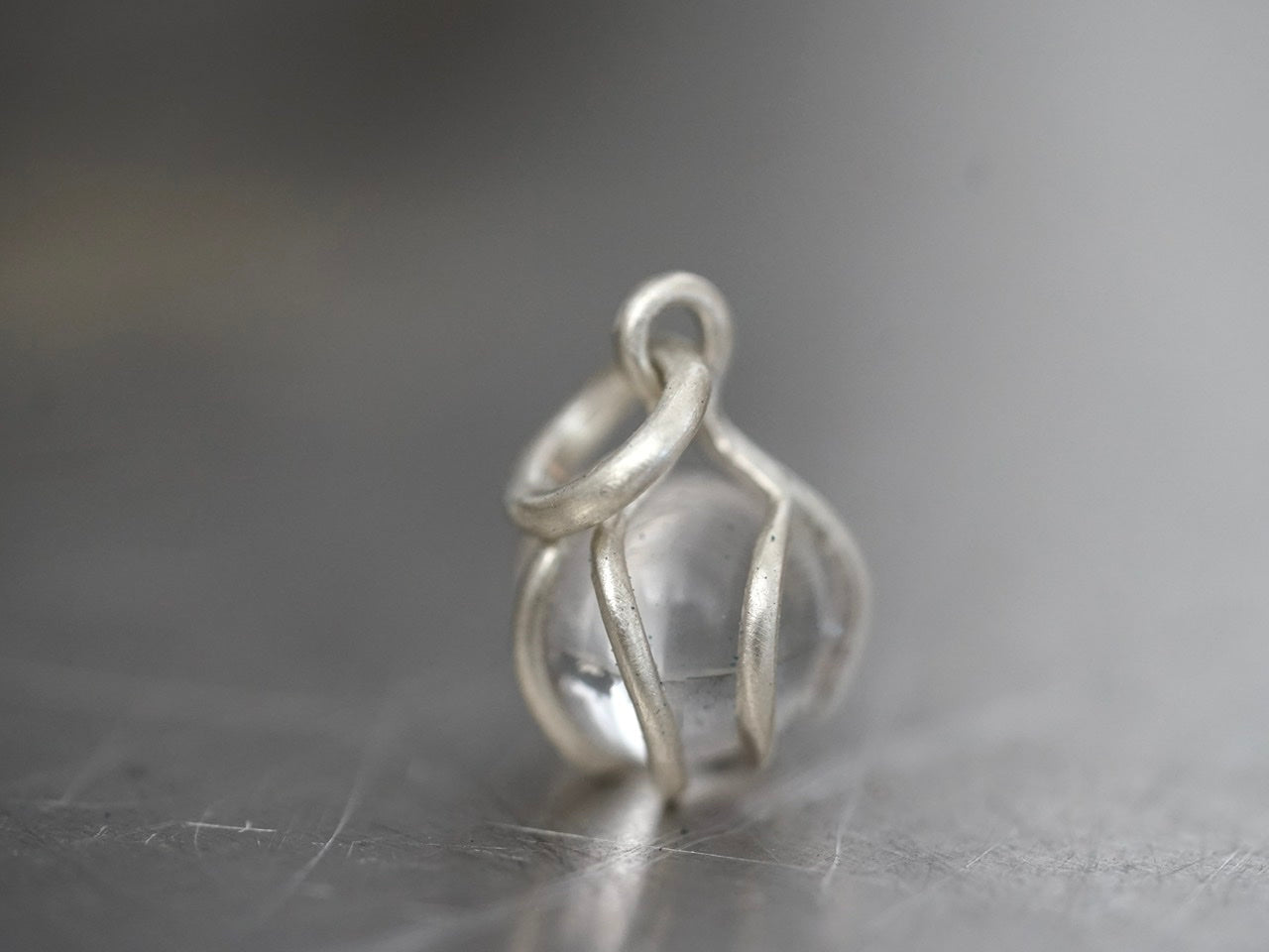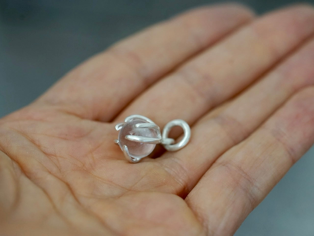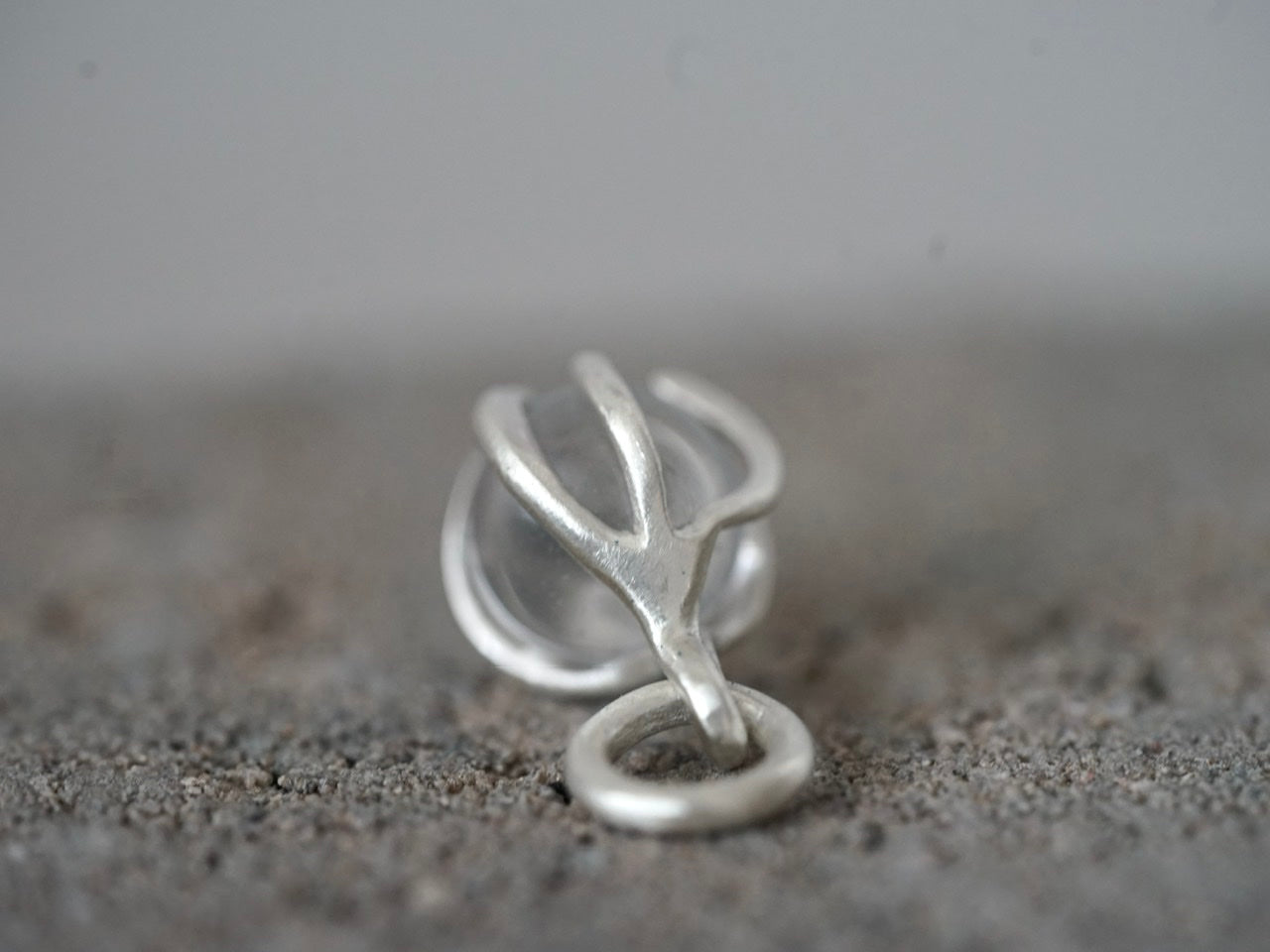A clear Quarz sphere is gently held by hand-carved sterling silver prongs, allowing the little globe to be spinned if you feel fidgety.