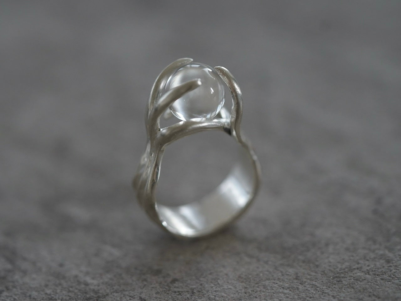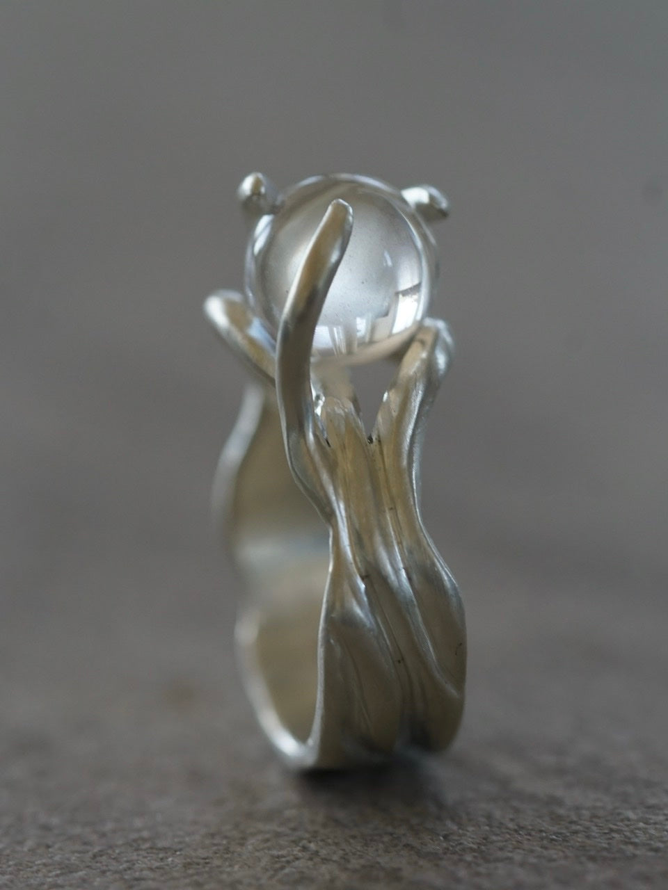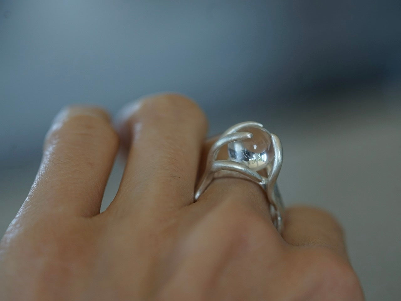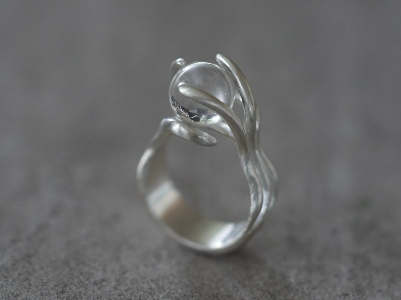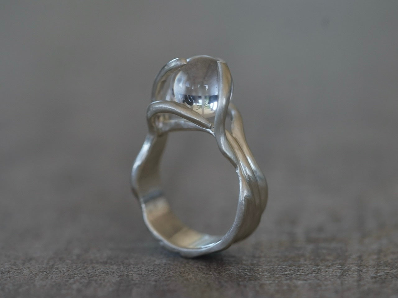 A clear quartz crystal globe is focal element of this ring, it is held in place by sterling silver prongs on a hand-carved sterling silver band.