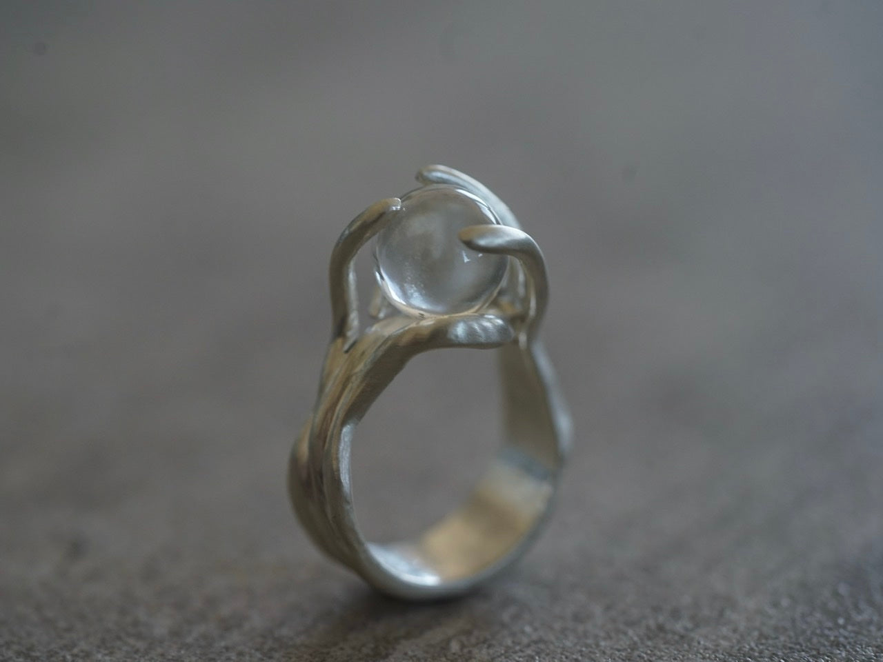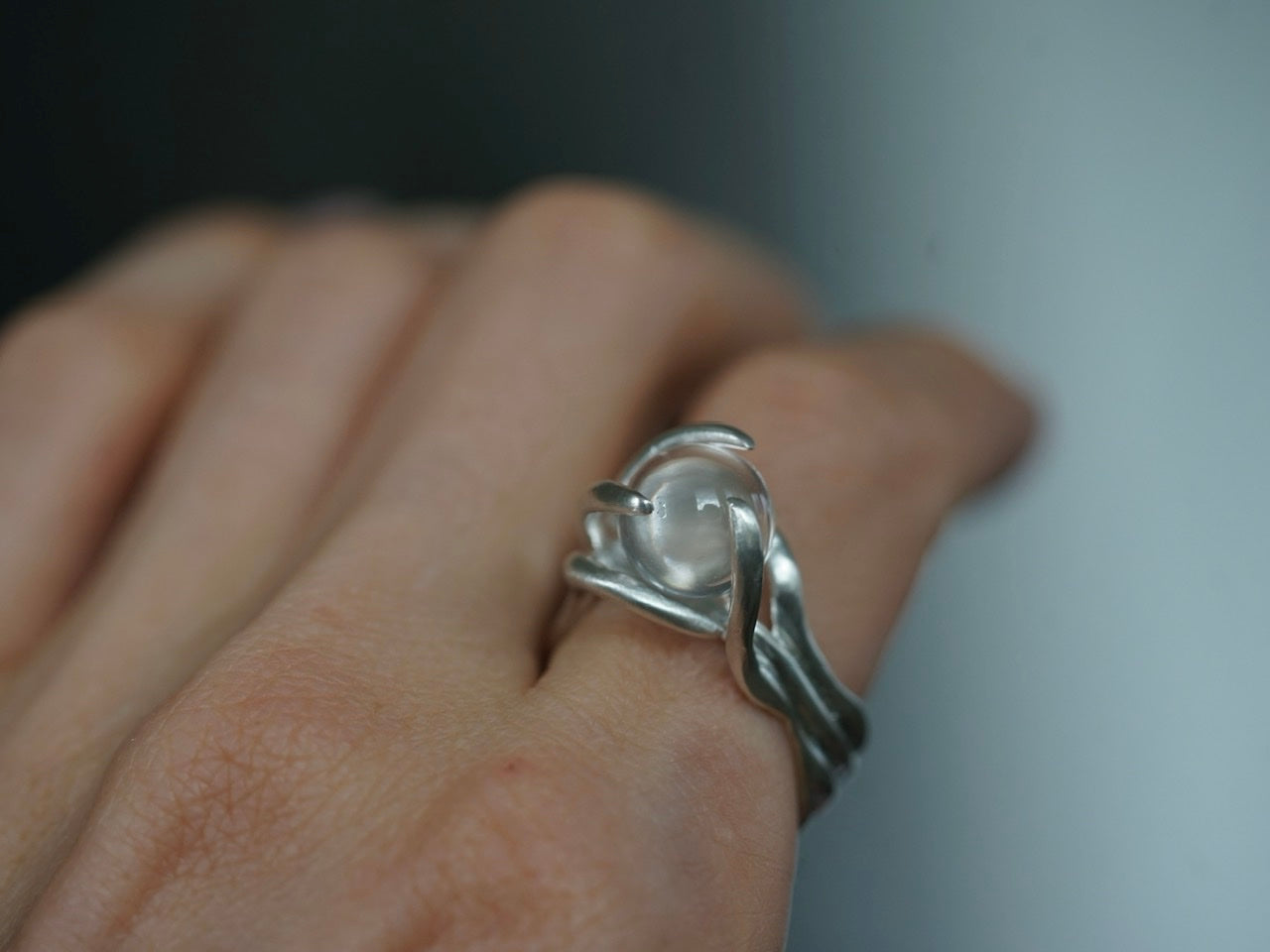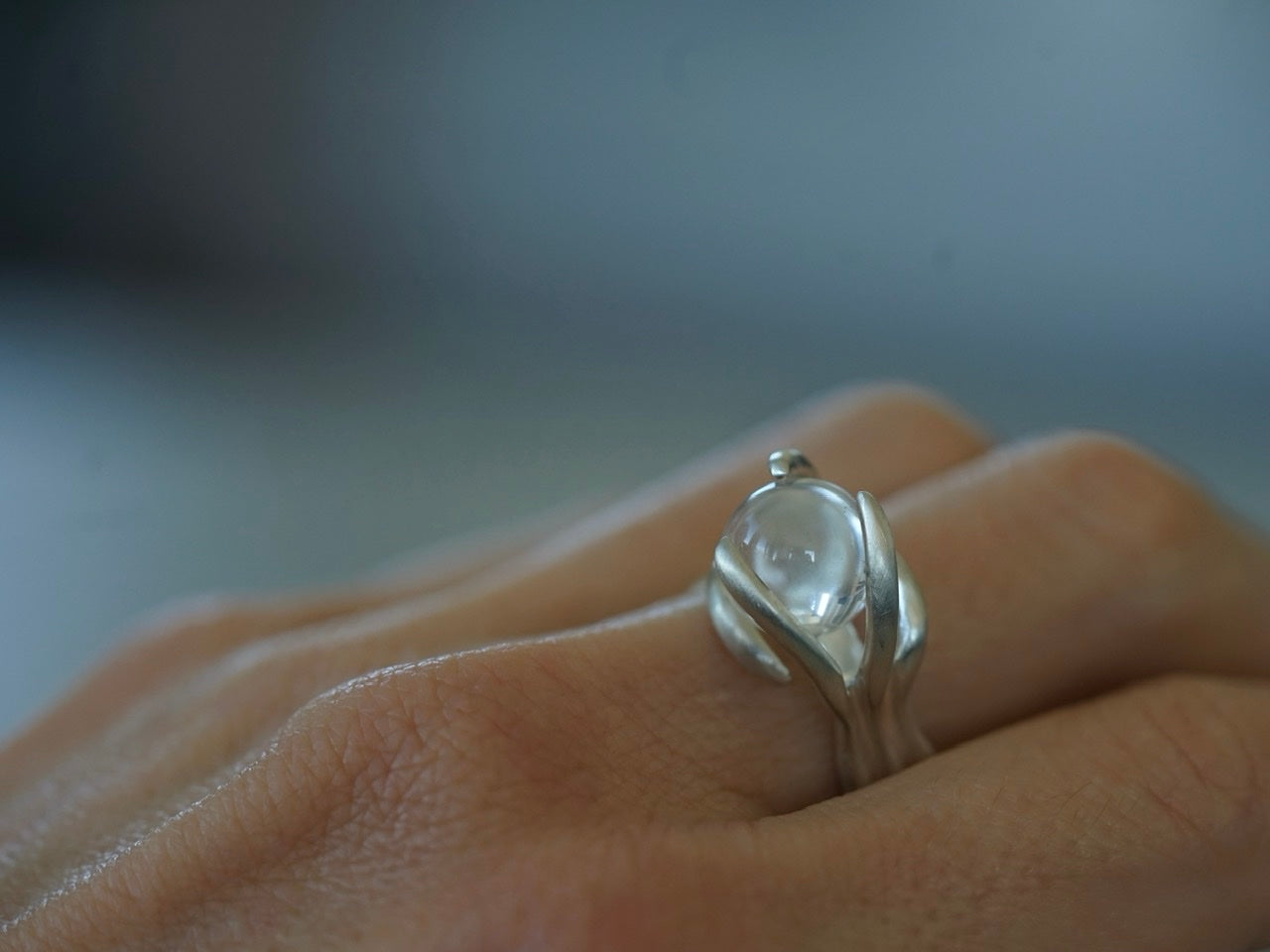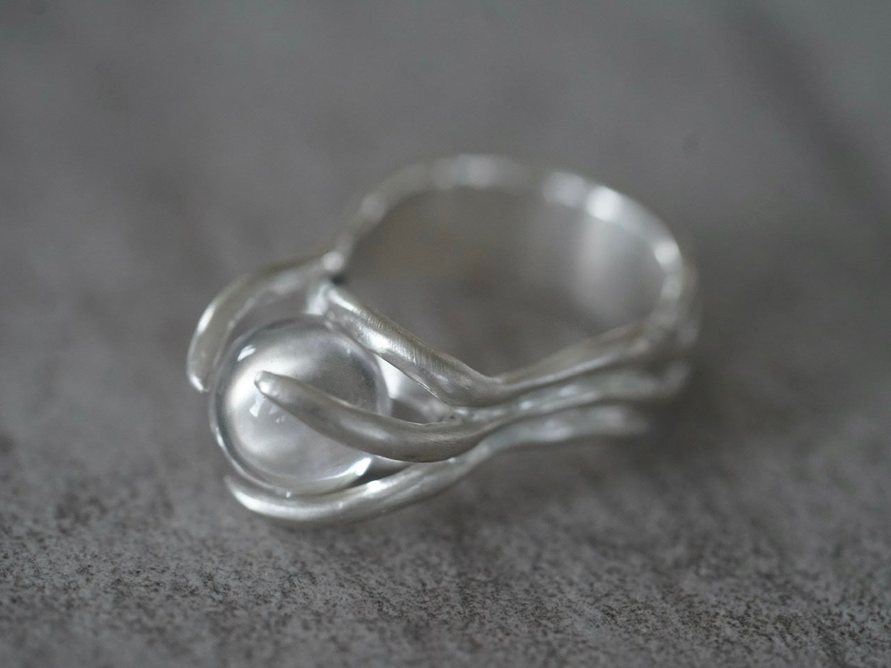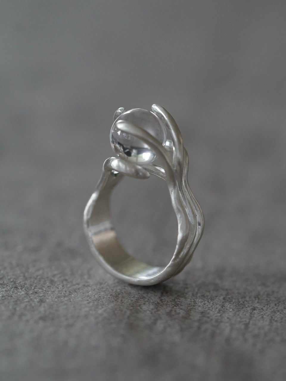 A clear quartz crystal globe is focal element of this ring, it is held in place by sterling silver prongs on a hand-carved sterling silver band.