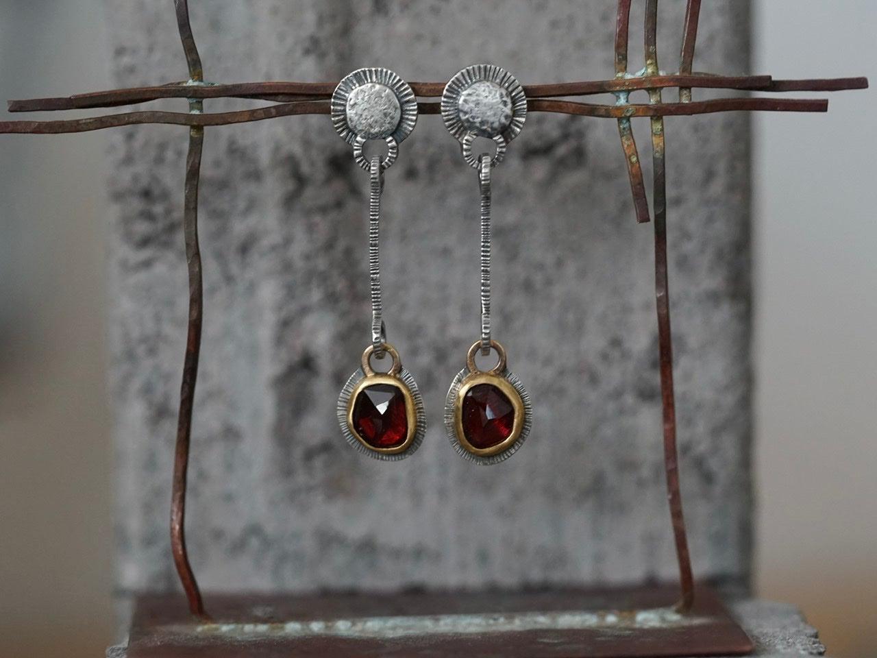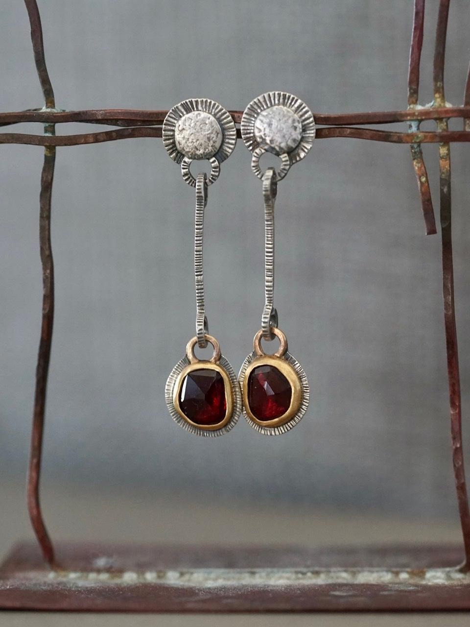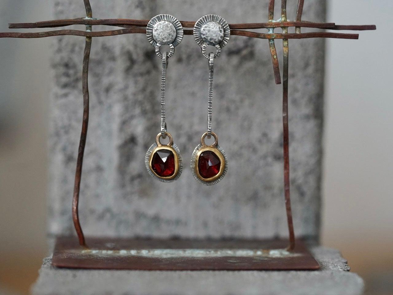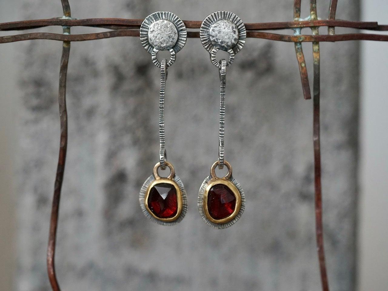 Two beautiful, deep red, rosecut garnets with slightly irregular shapes were set in 22k gold and mounted on a textured backplate to create these exquisite, elegant earrings. Elongated, textured connections link the stones to sterling silver posts with a layered and textured surface.