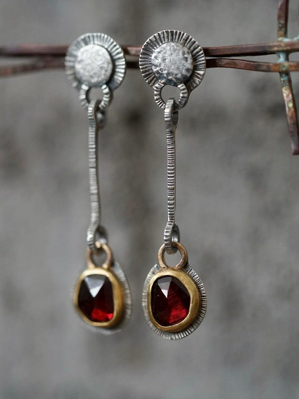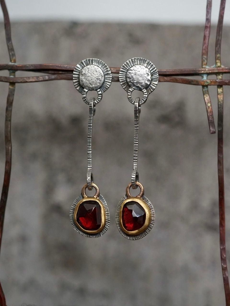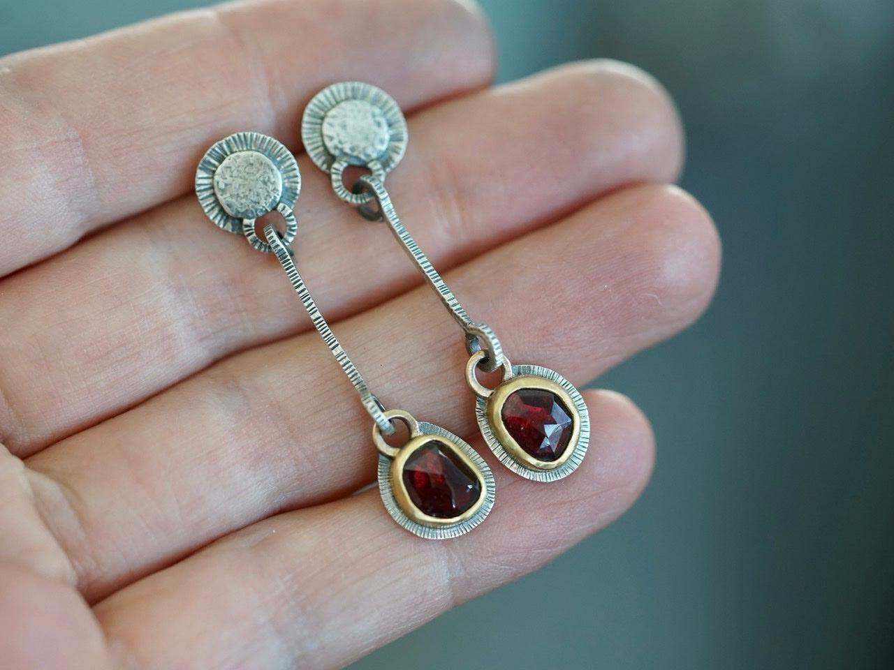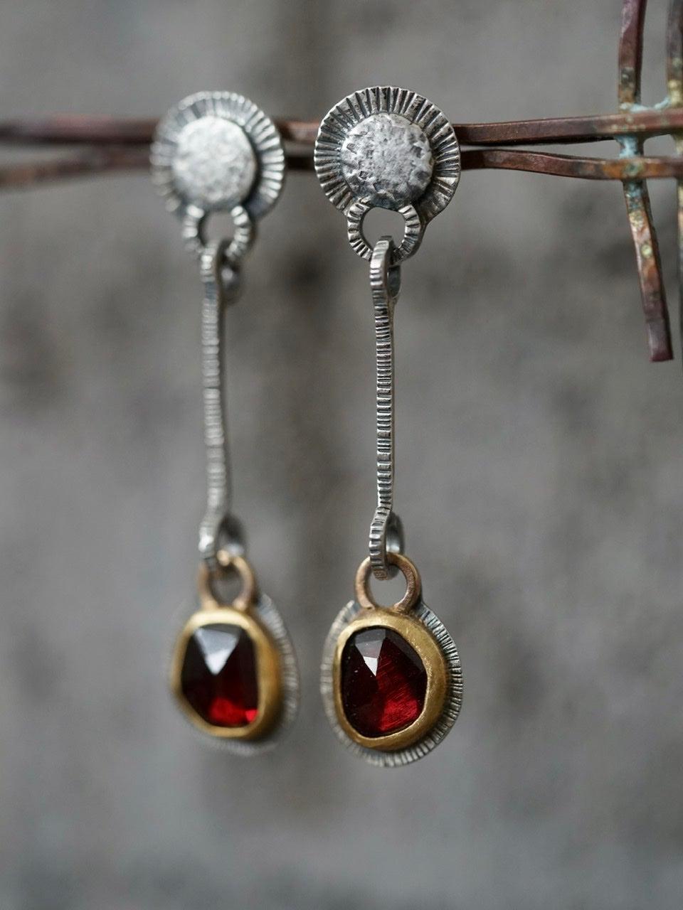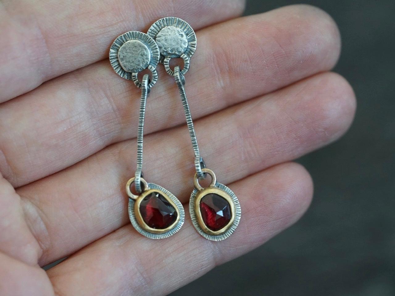 Two beautiful, deep red, rosecut garnets with slightly irregular shapes were set in 22k gold and mounted on a textured backplate to create these exquisite, elegant earrings. Elongated, textured connections link the stones to sterling silver posts with a layered and textured surface.