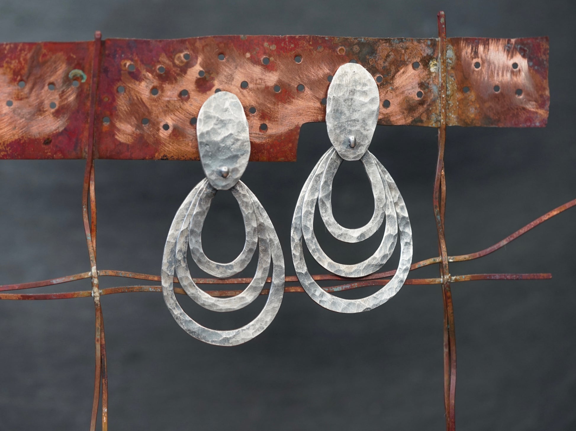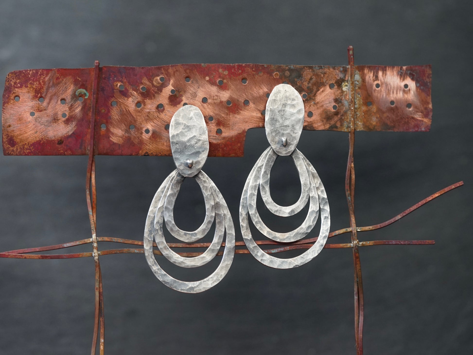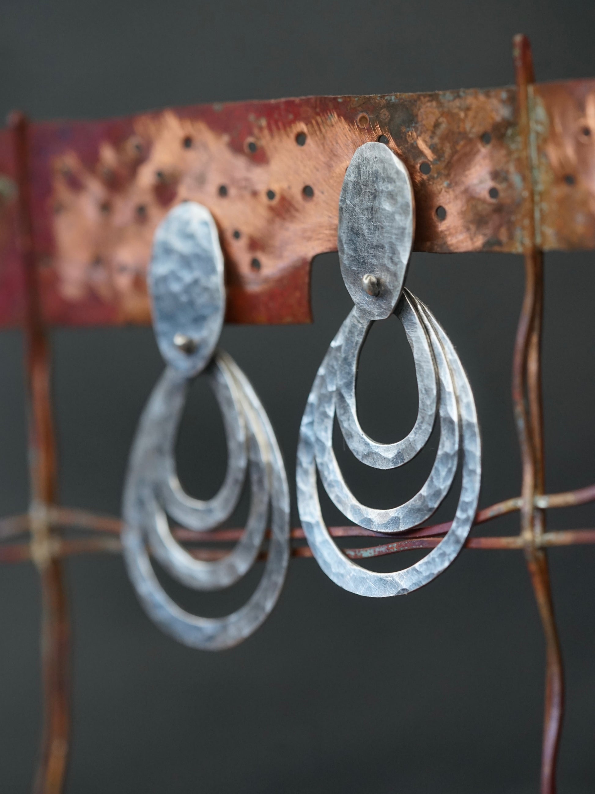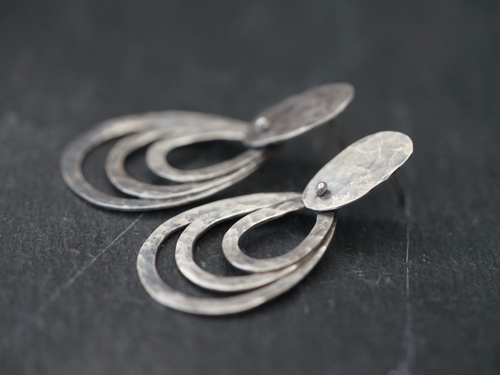 Concentric oval shapes were cut from sterling silver sheet, filed, textured and pierced to dangle from matching earpieces fitted with sterling posts, fastened with friction ear nut closures to ensure a comfortable wear.