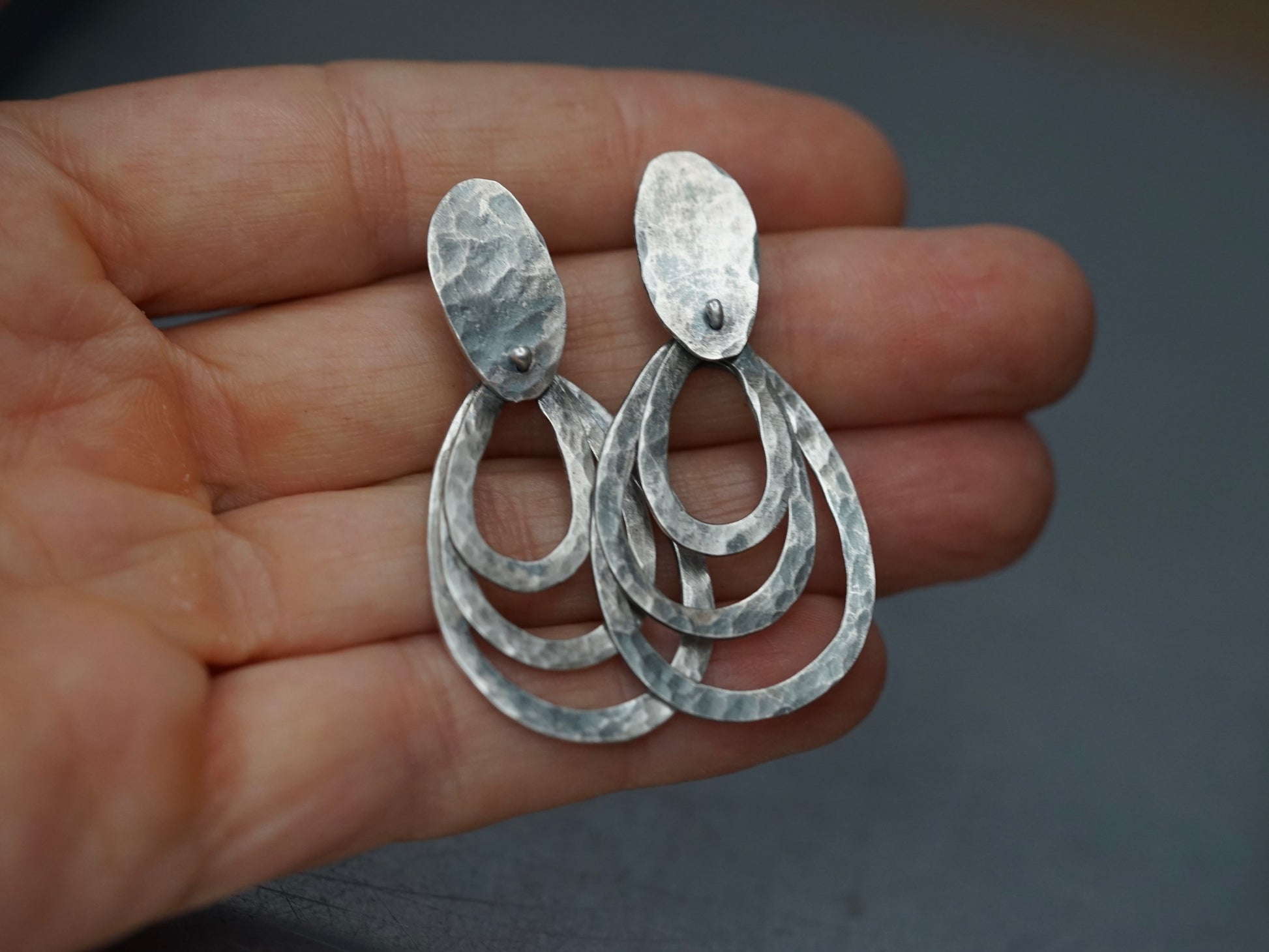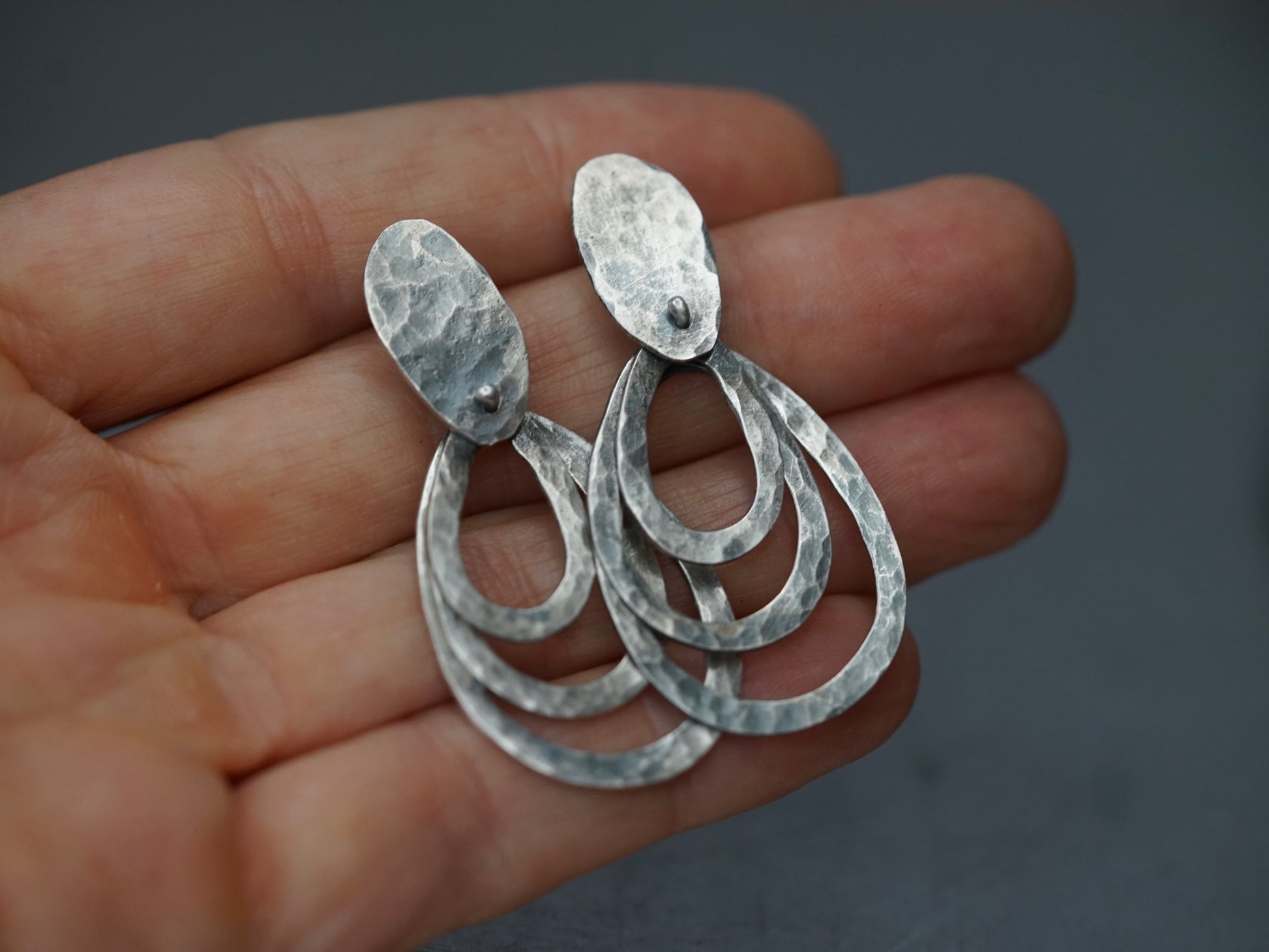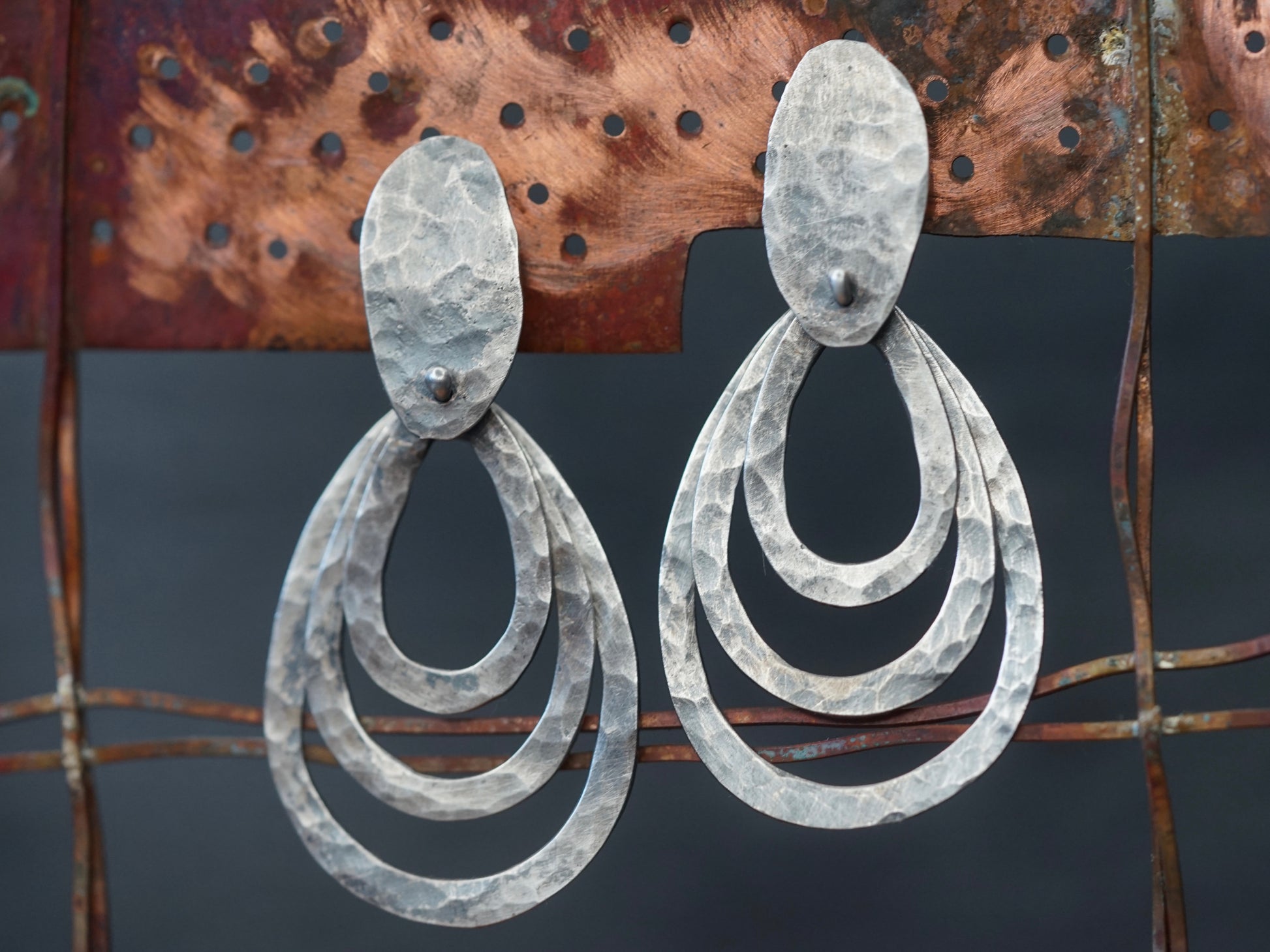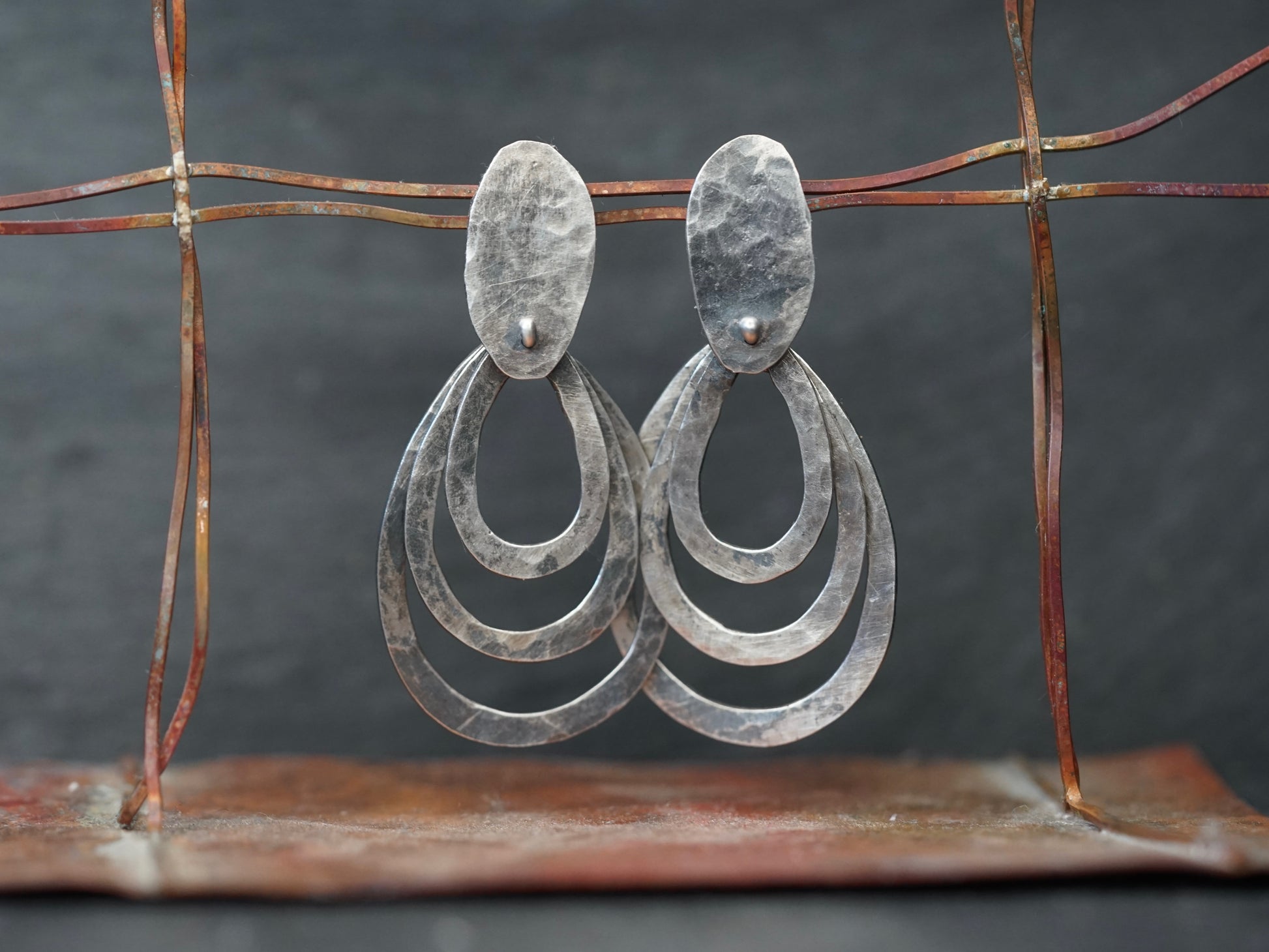 Concentric oval shapes were cut from sterling silver sheet, filed, textured and pierced to dangle from matching earpieces fitted with sterling posts, fastened with friction ear nut closures to ensure a comfortable wear.