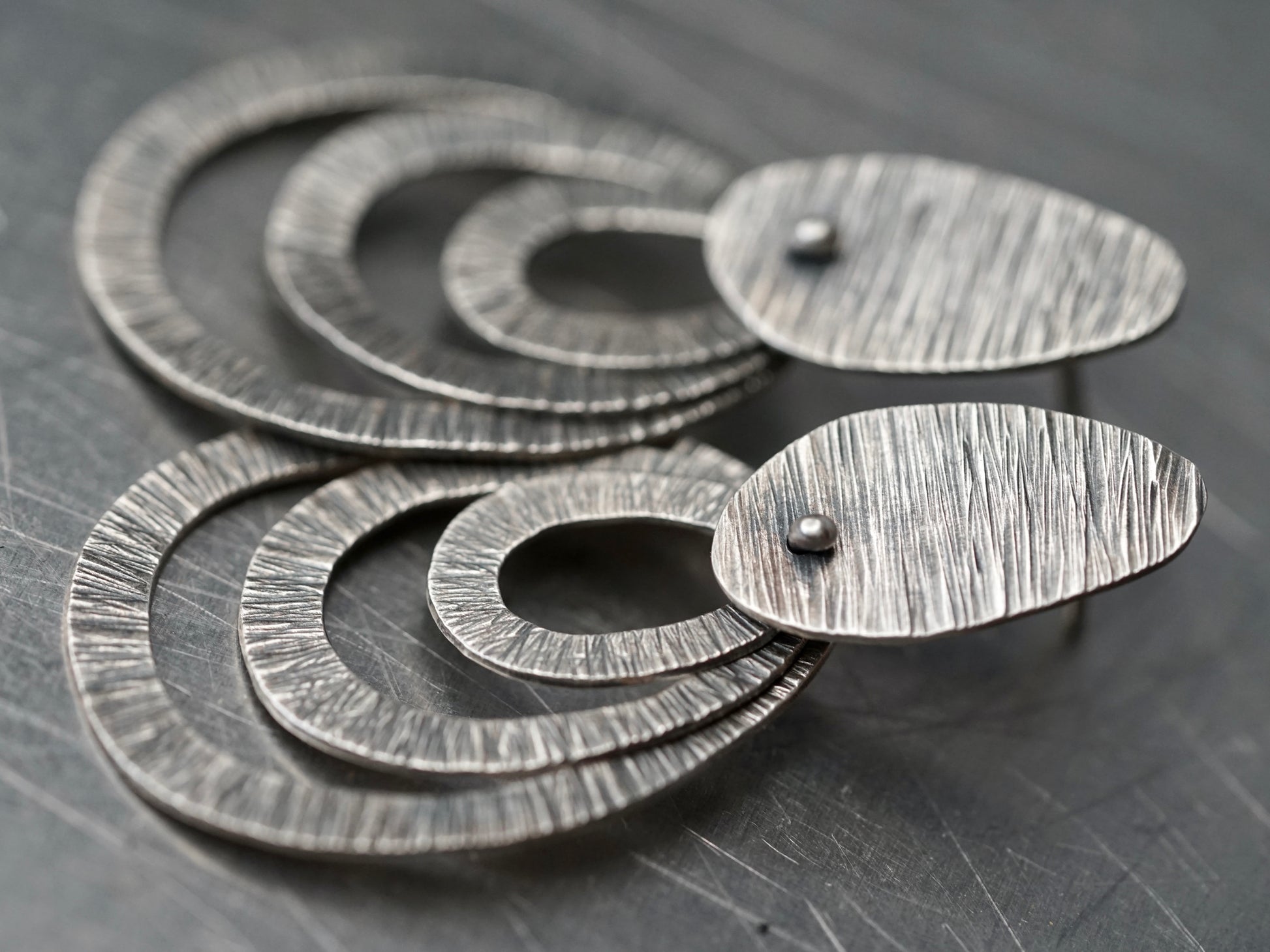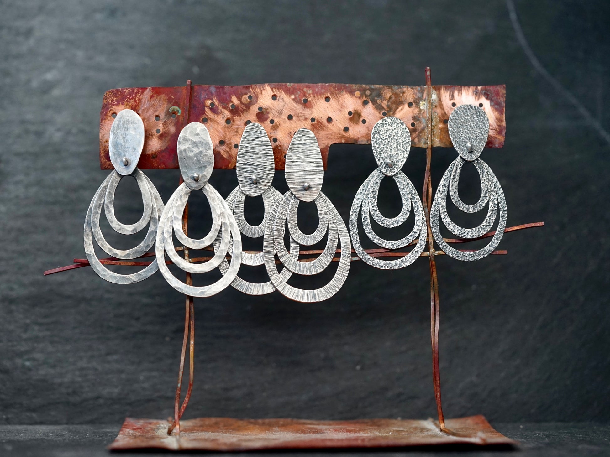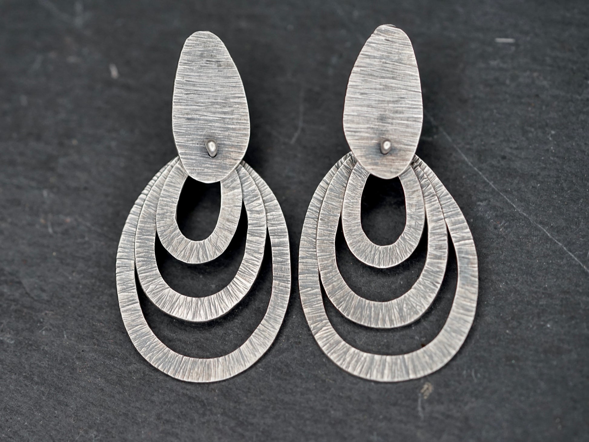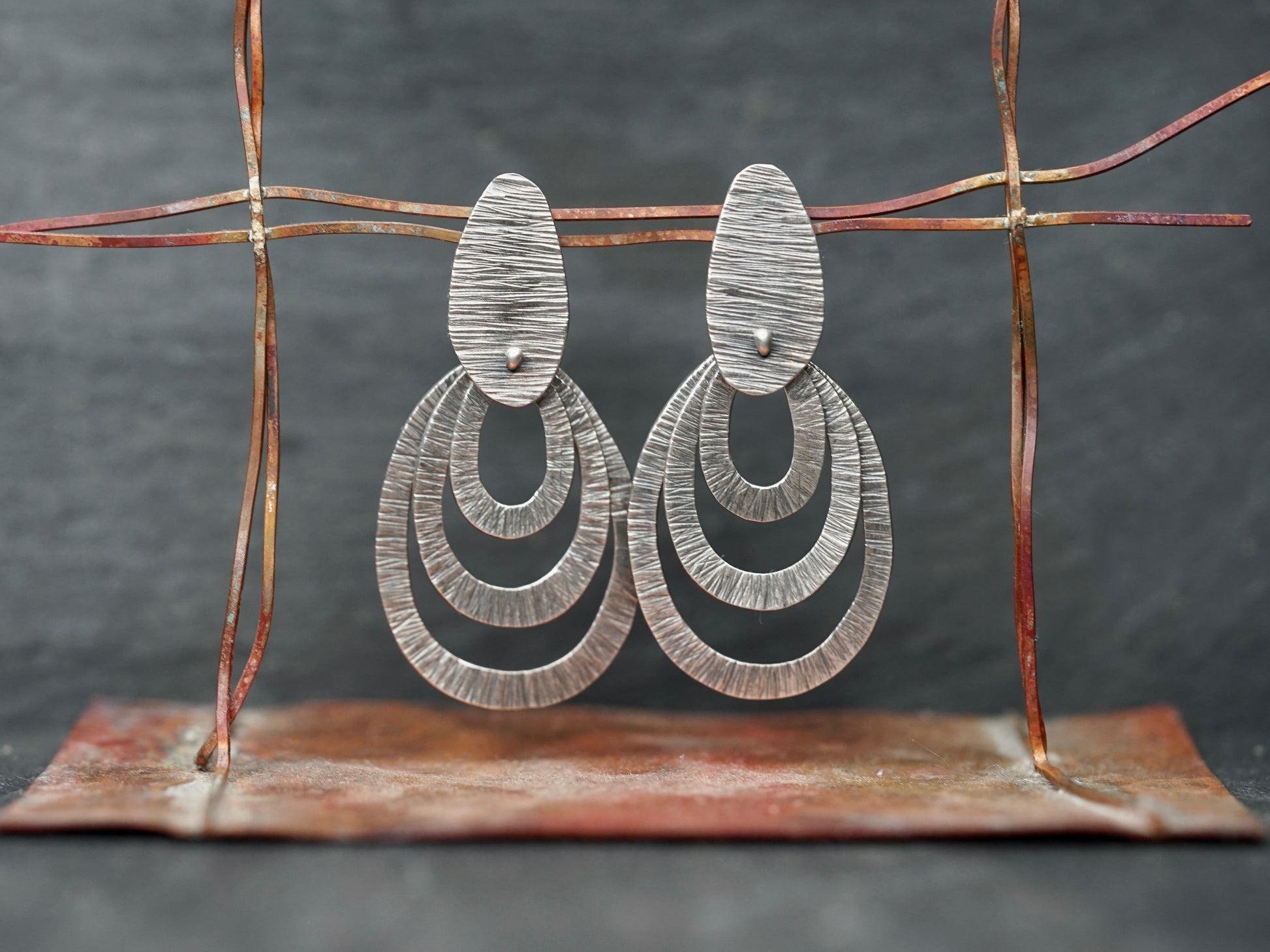 Concentric oval shapes were cut from sterling silver sheet, filed, textured and pierced to dangle from matching earpieces fitted with sterling posts, fastened with friction ear nut closures to ensure a comfortable wear.