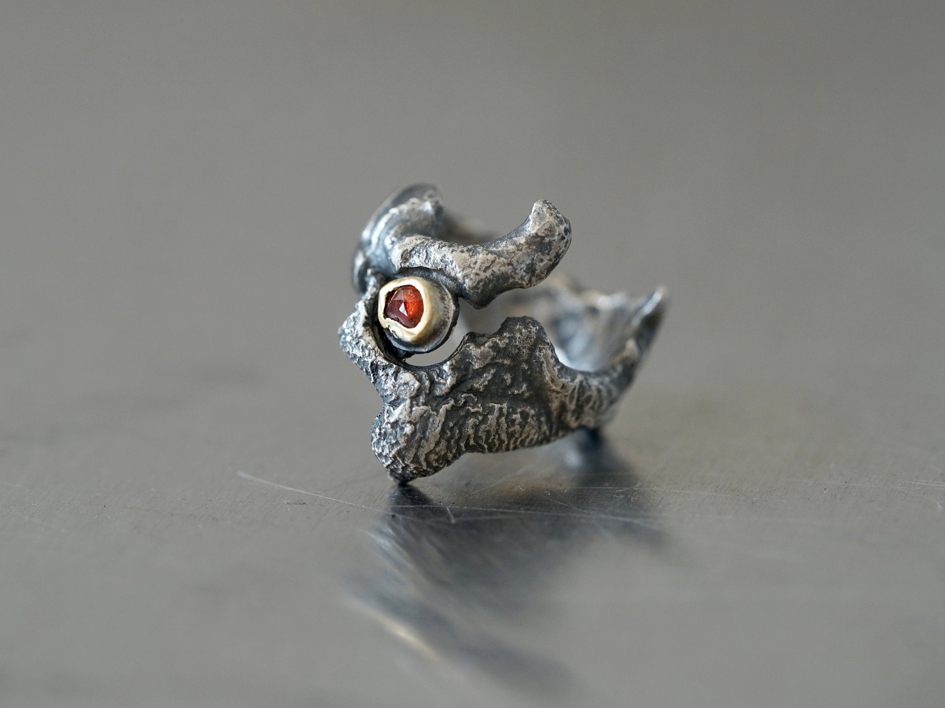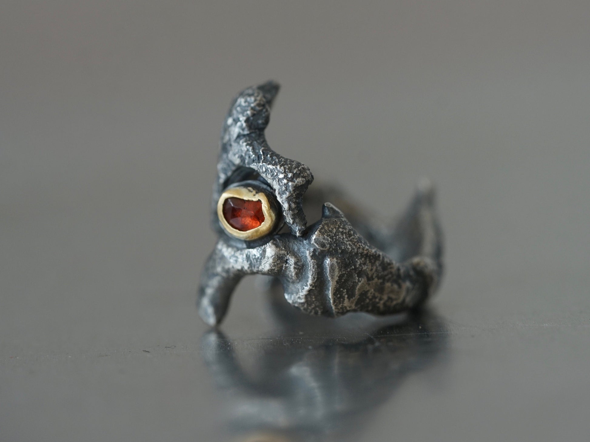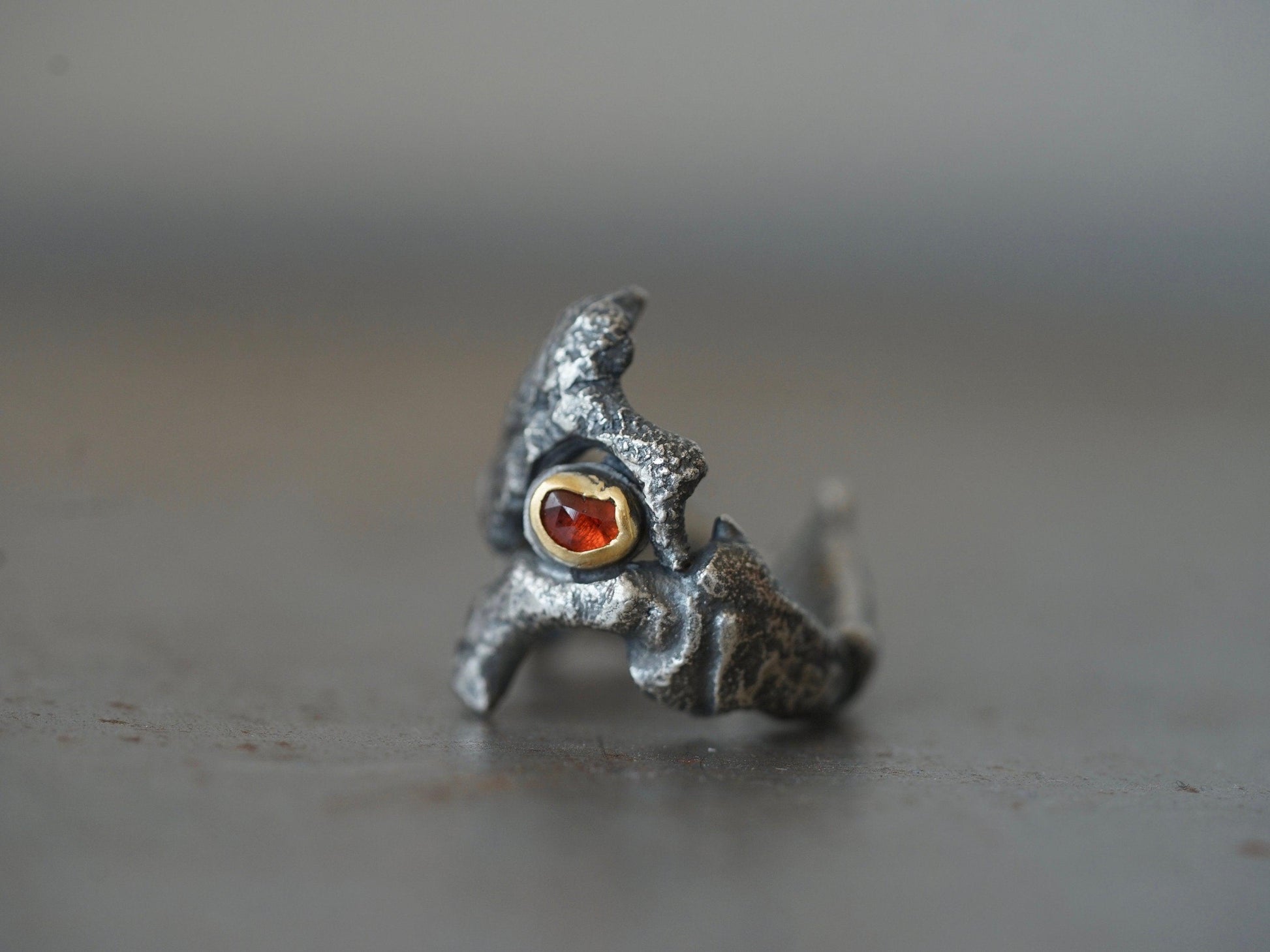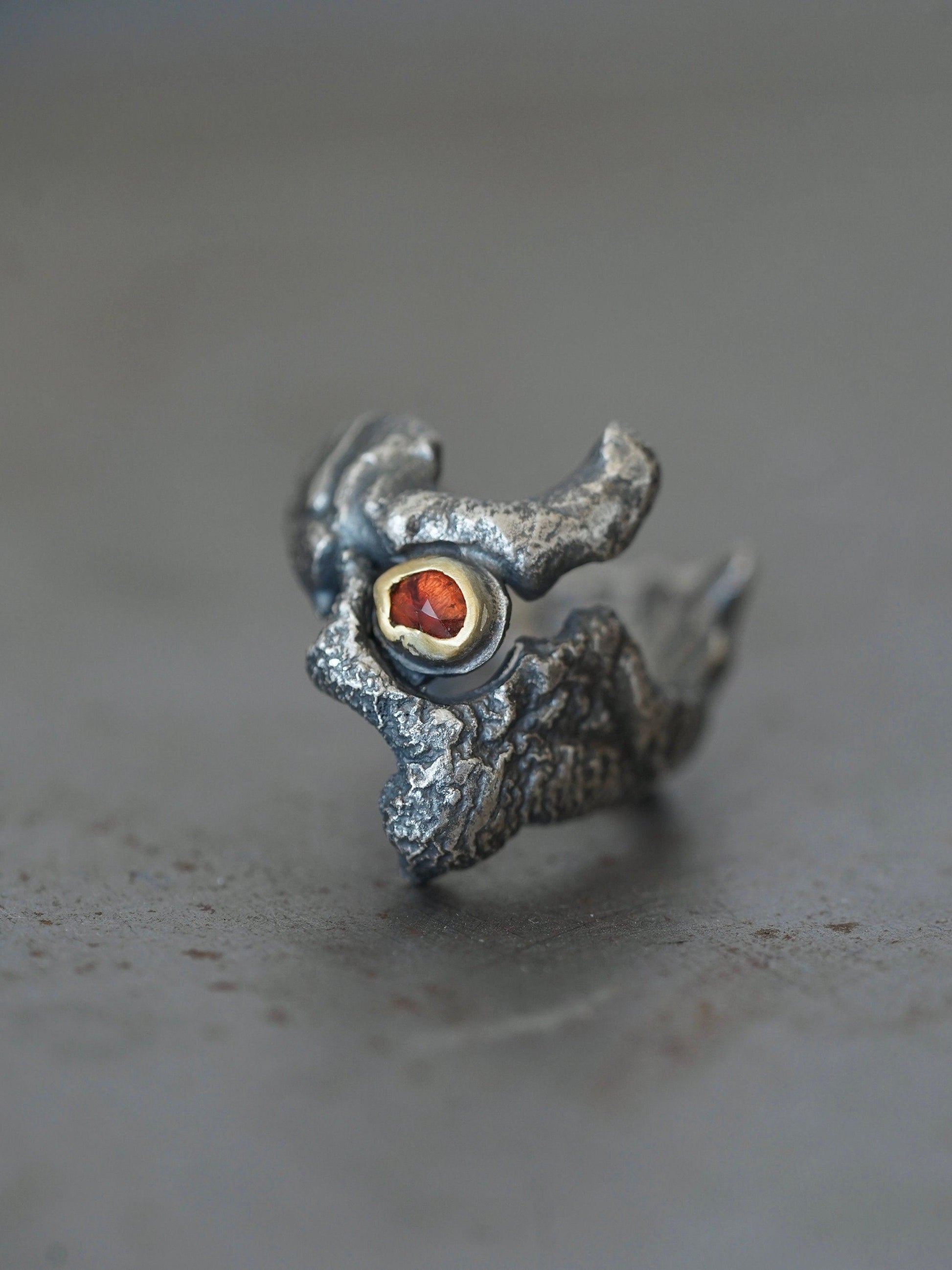 Dragon eye ring: This unique band was created by melting and shaping recycled sterling silver on a charcoal block, the fire created a rich texture and a gothic feel. A rose cut red spinel was selected for its colour and shape, it was set in 22k gold and fitted into the small slot at the front band. The ring was sanded and polished by hand and oxidised to accentuate the surface texture. This is a unique piece of art jewellery, once it is gone it is gone.