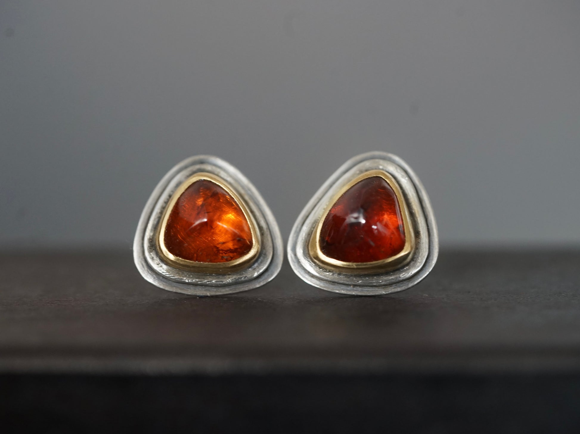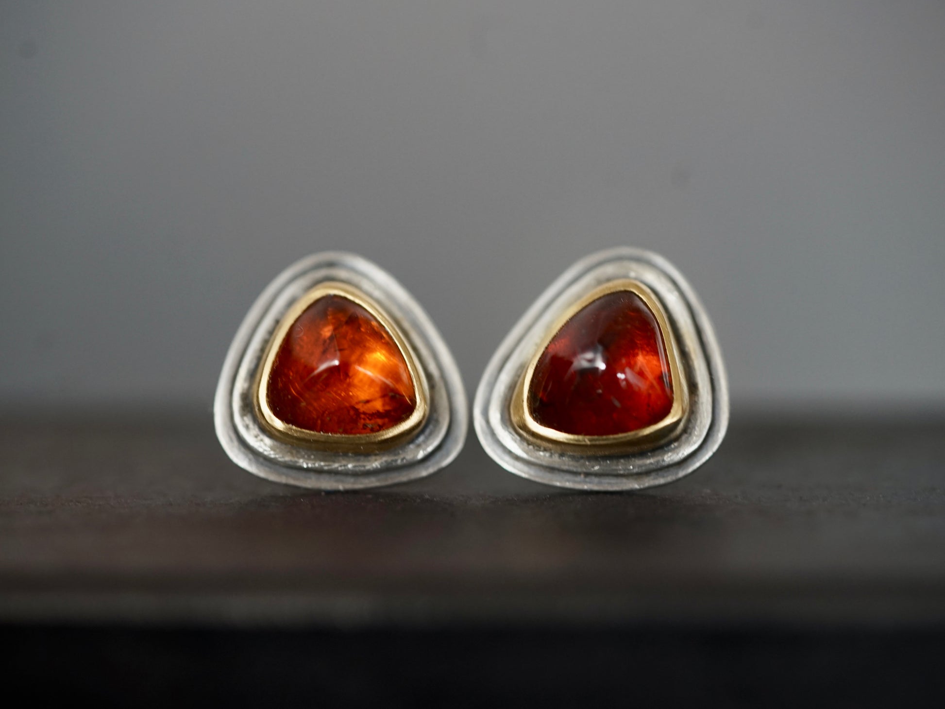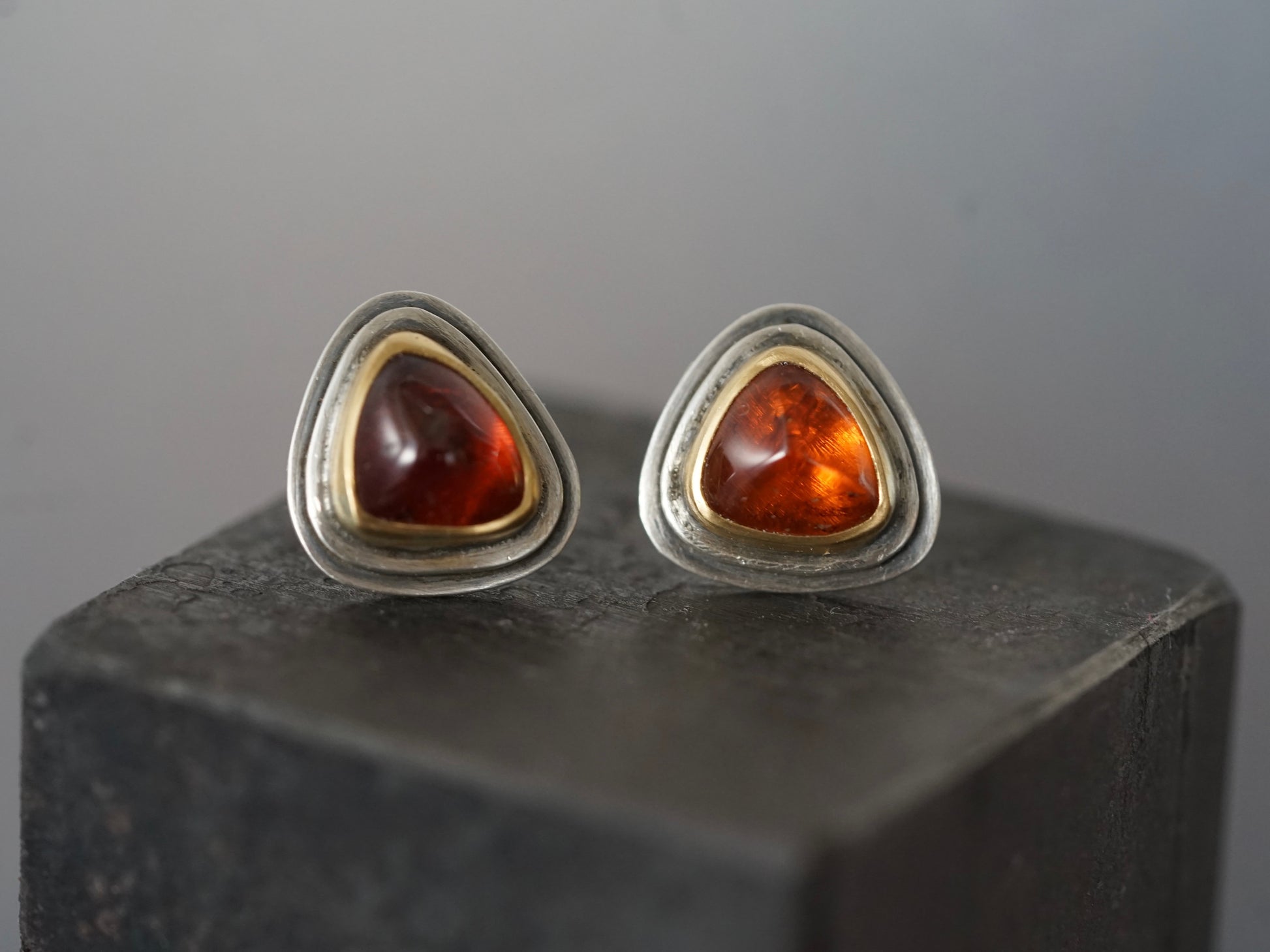 Two gorgeous, triangular hessonite garnets in deep orange tones were set in 22k gold on layered sterling silver backplates. The warm tones of the stones are beautifully complemented by the rich hues of the gold bezels, the clean and simple lines of the design give the gems center stage. These post earrings are fastened with butterfly friction closures to ensure a secure wear.