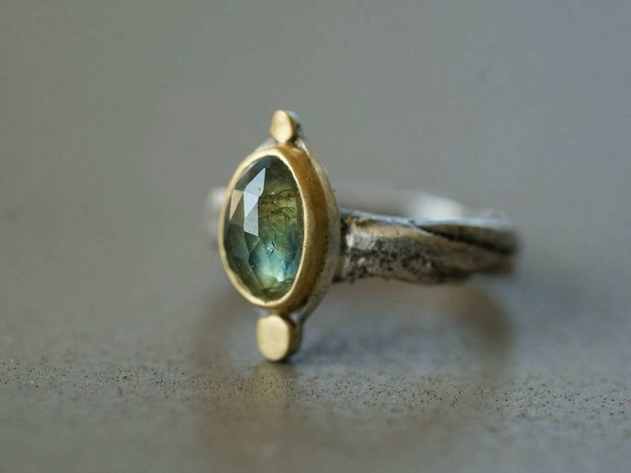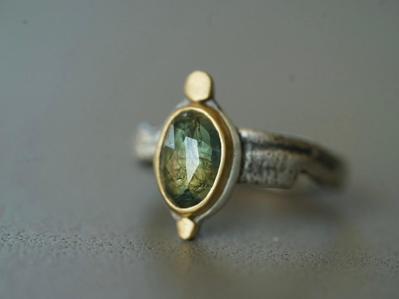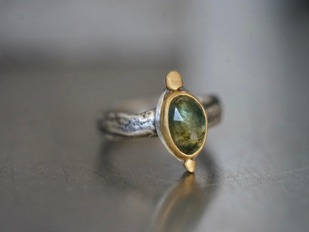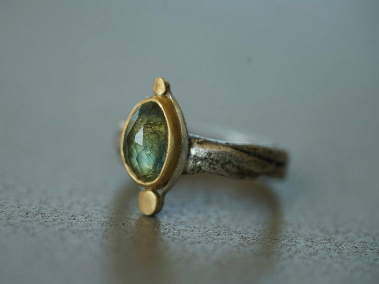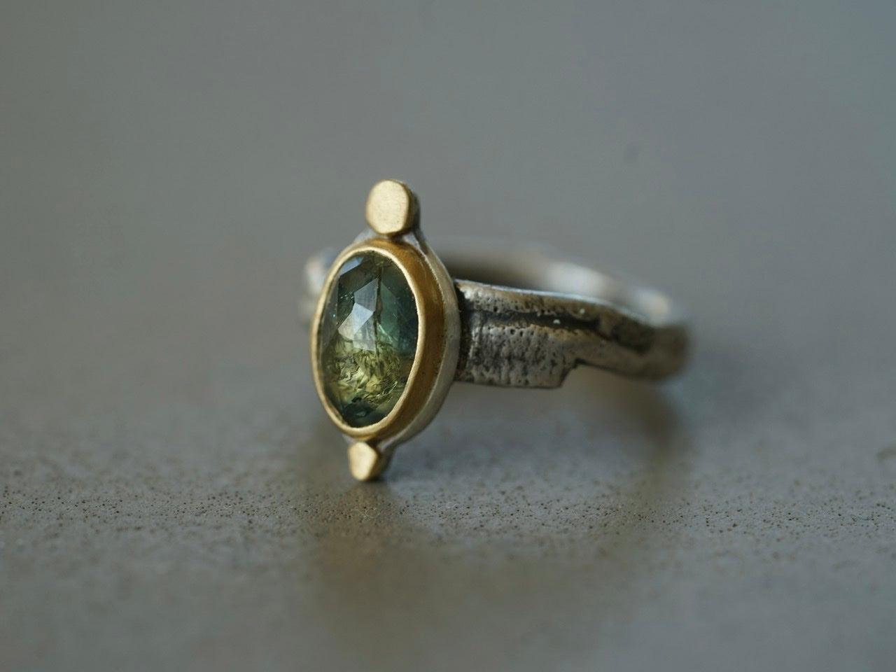 A wonderful semi-translucent sapphire is the focal element of this piece. The stone has the most amazing hues of blueish green with golden specks. It was set in 22 k gold on a simple and elegant sterling silver backing, anchored by two 22k gold disk. The organically shaped and textured sterling silver band completes the look and feel of this design beautifully.