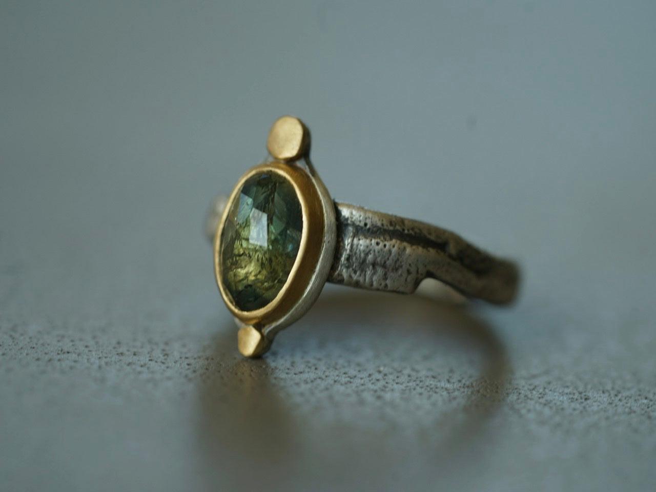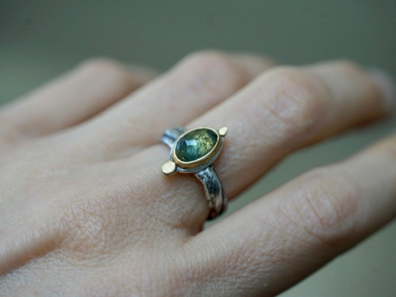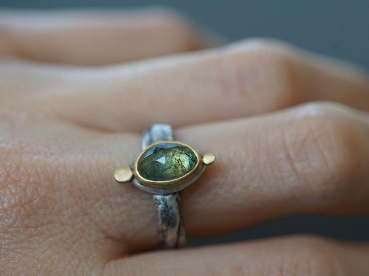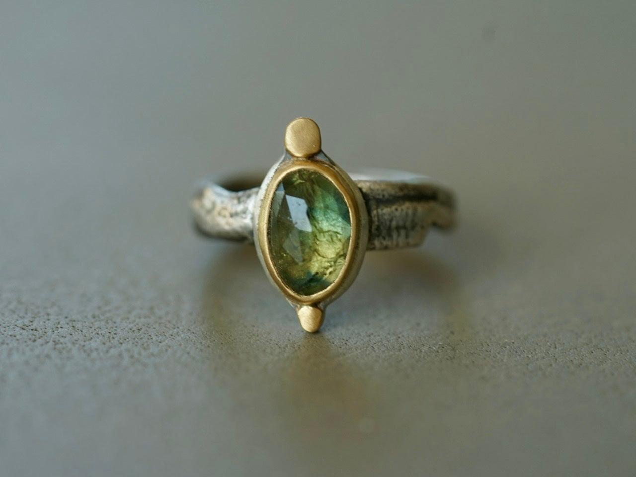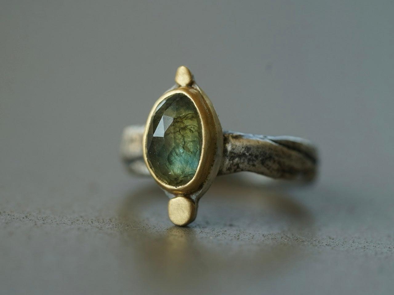 A wonderful semi-translucent sapphire is the focal element of this piece. The stone has the most amazing hues of blueish green with golden specks. It was set in 22 k gold on a simple and elegant sterling silver backing, anchored by two 22k gold disk. The organically shaped and textured sterling silver band completes the look and feel of this design beautifully.