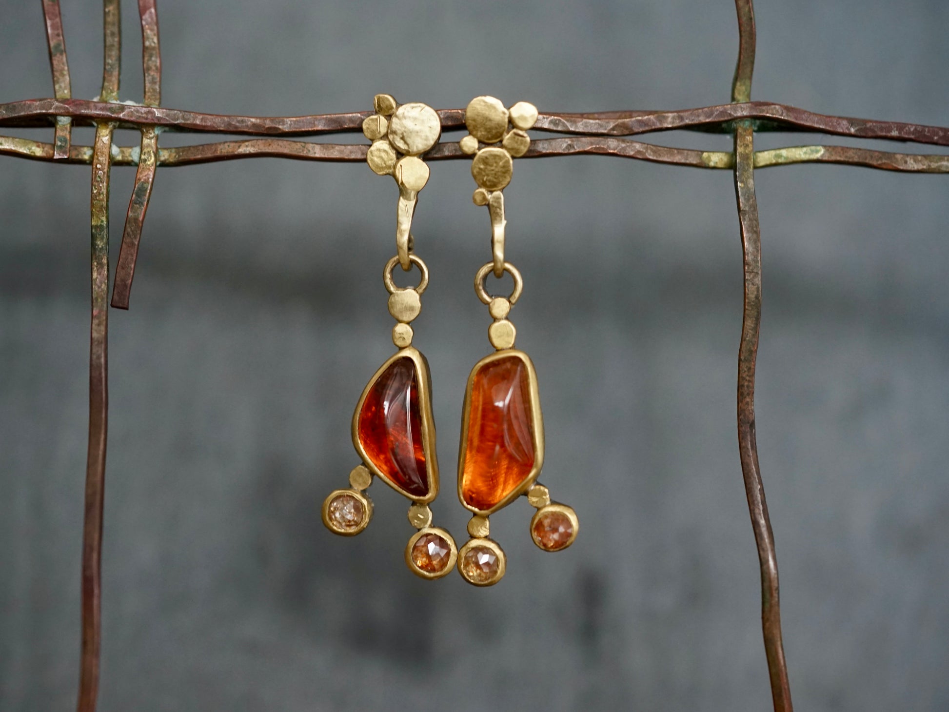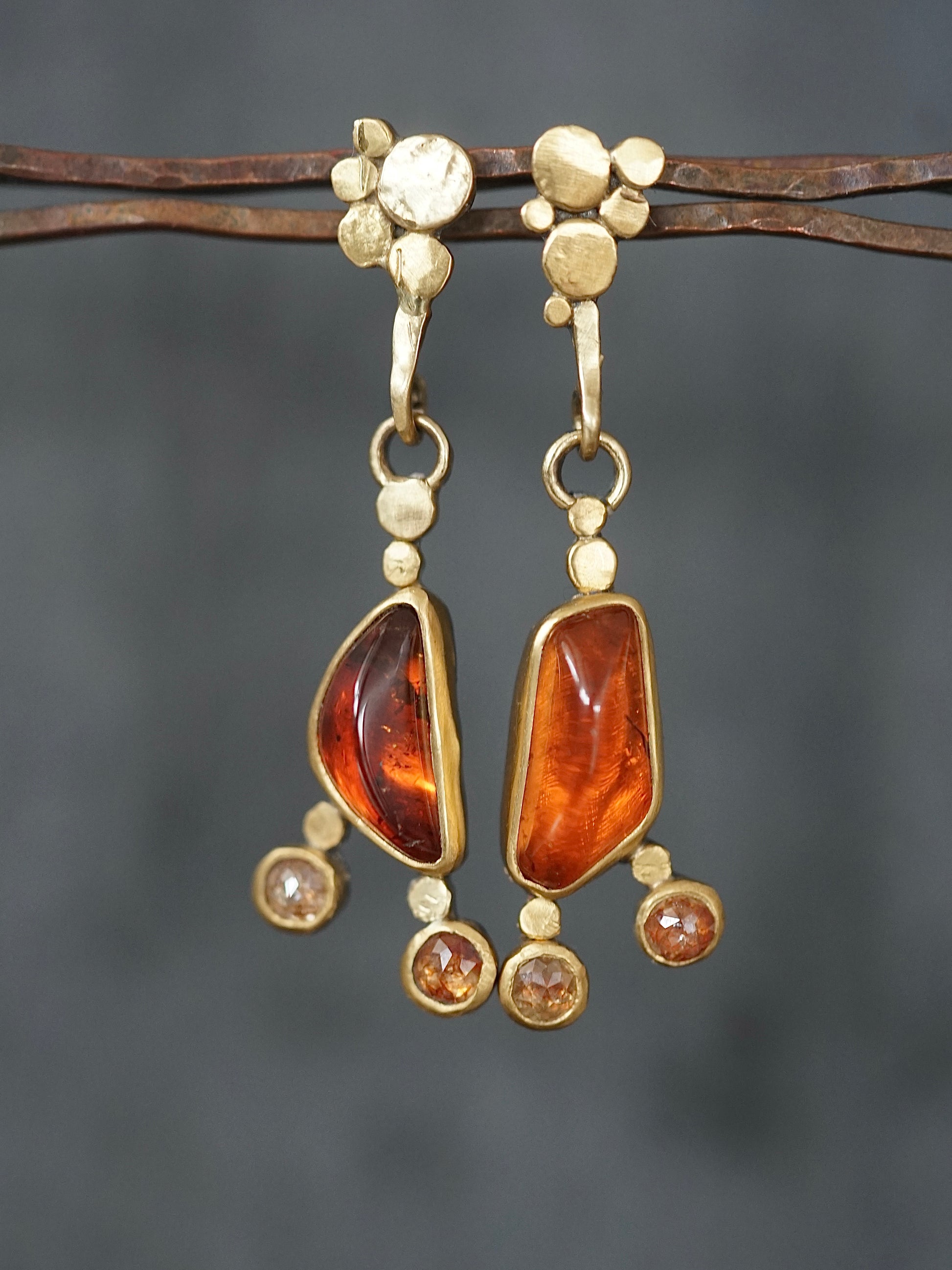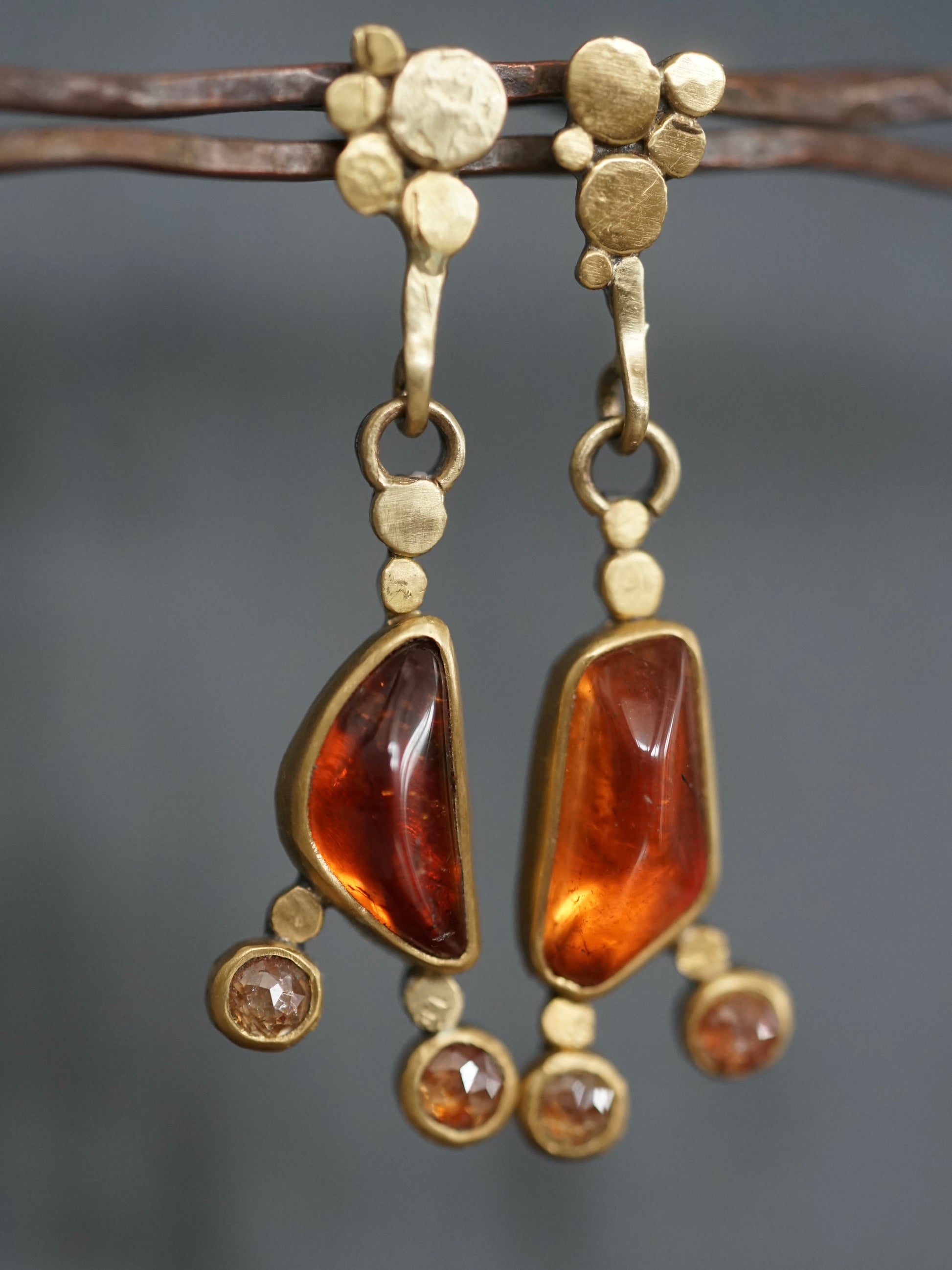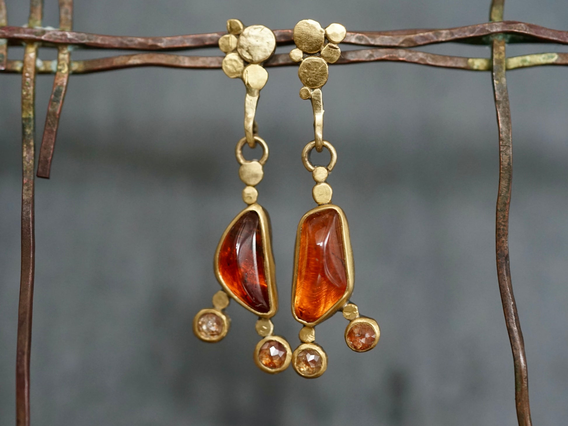 Asymmetrically shaped hessonite garnets with an organic, smooth cut were set in 22k gold and combined with reddish-brown, rose-cut diamonds to create this exquisite set. Little gold embellishments were added and gold cluster posts were created to allow these beauties to dangle and move.