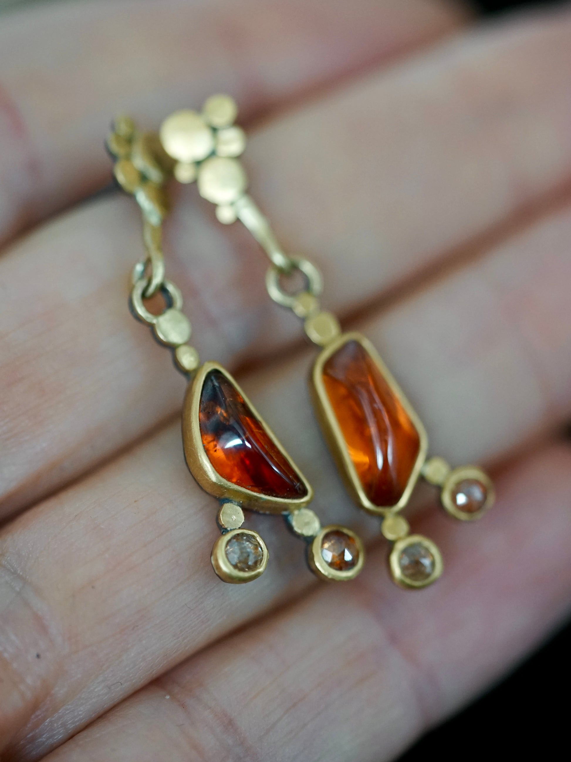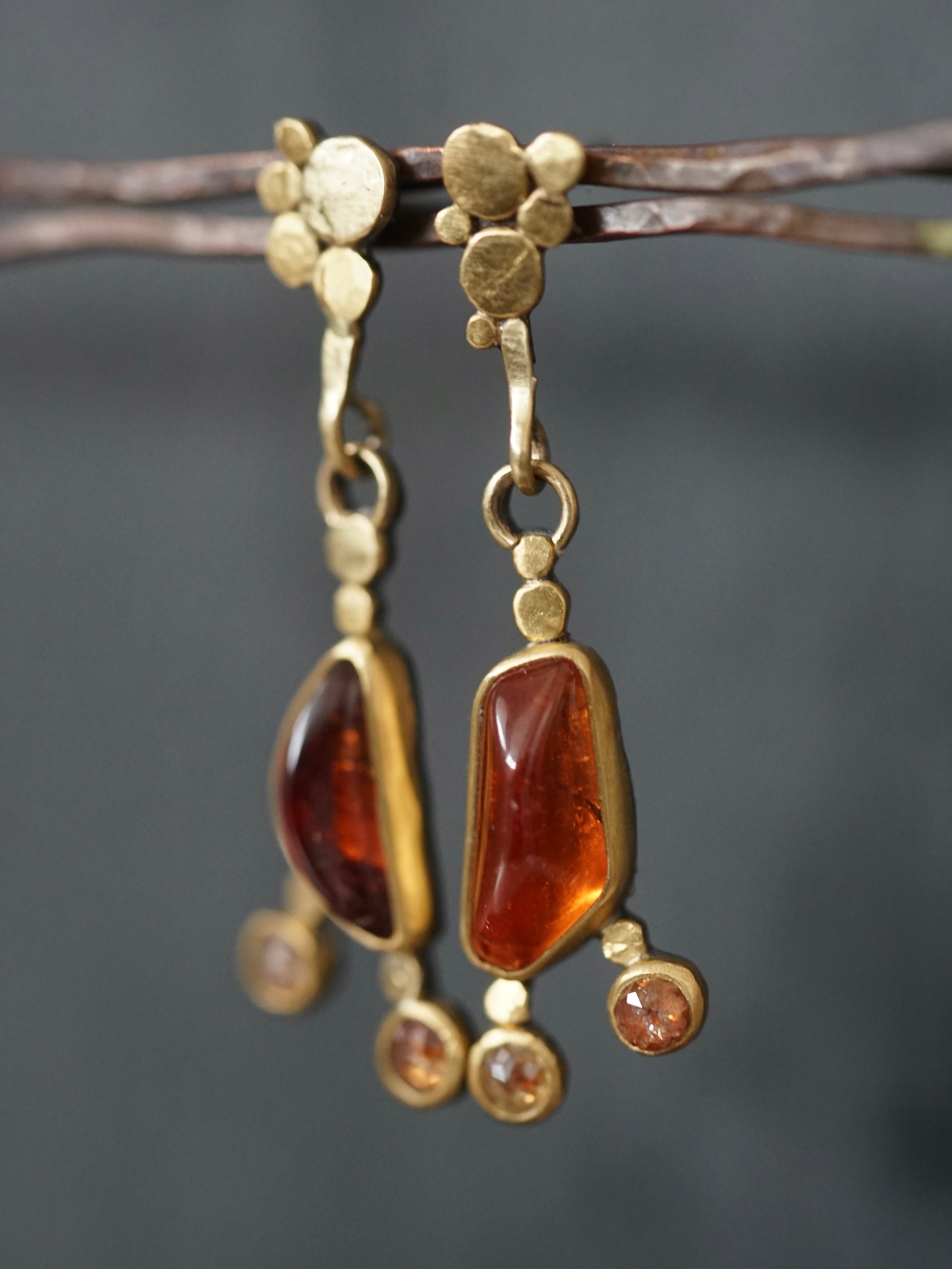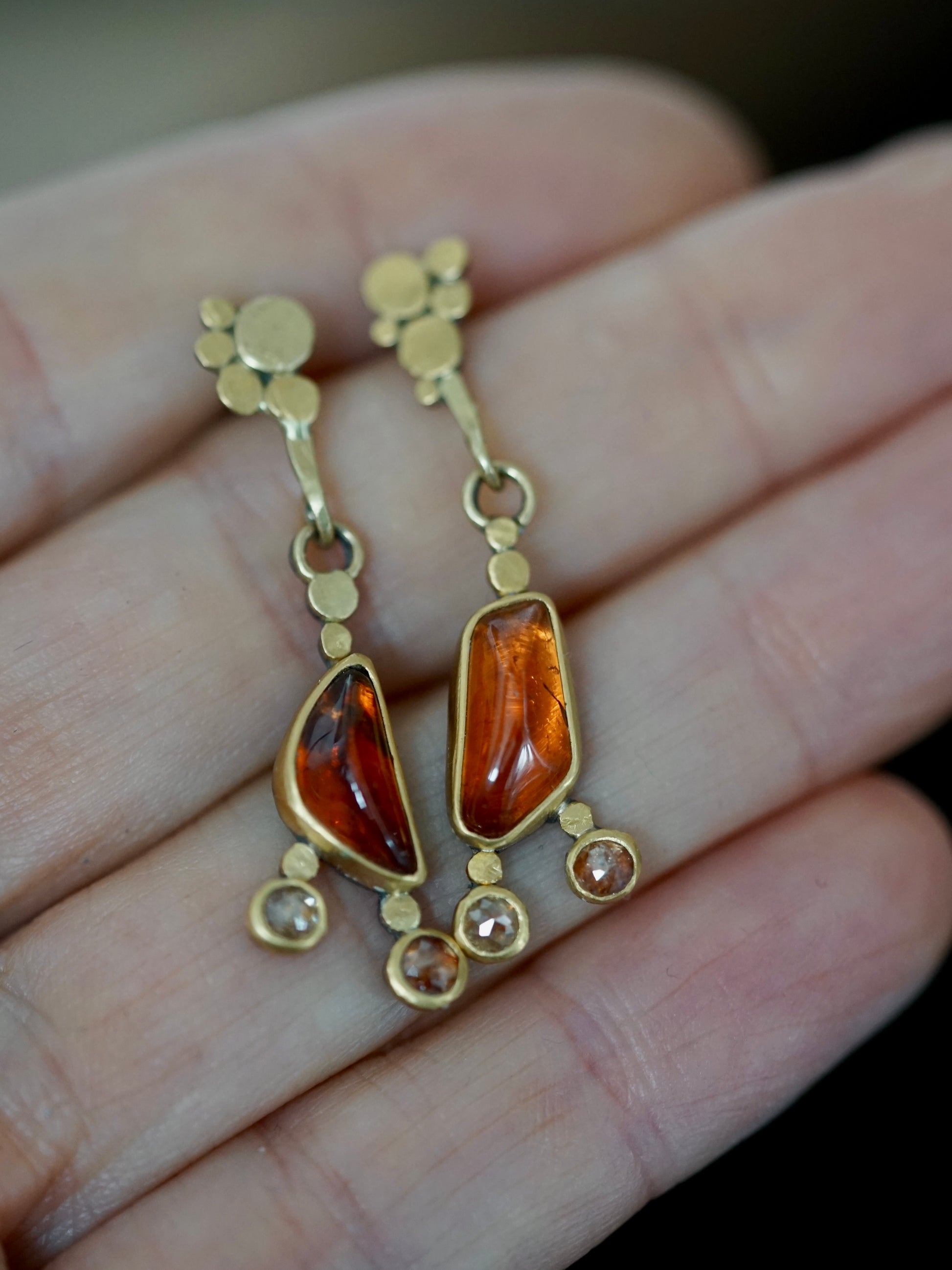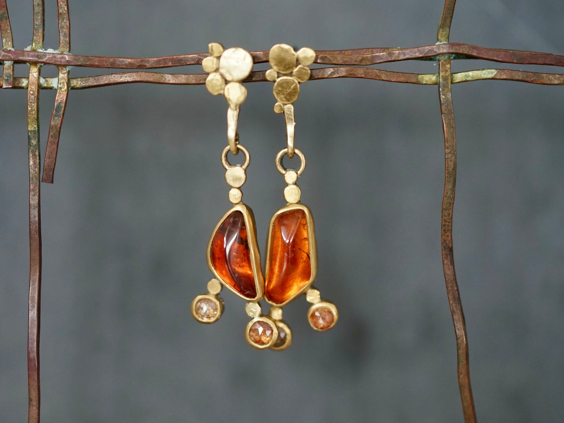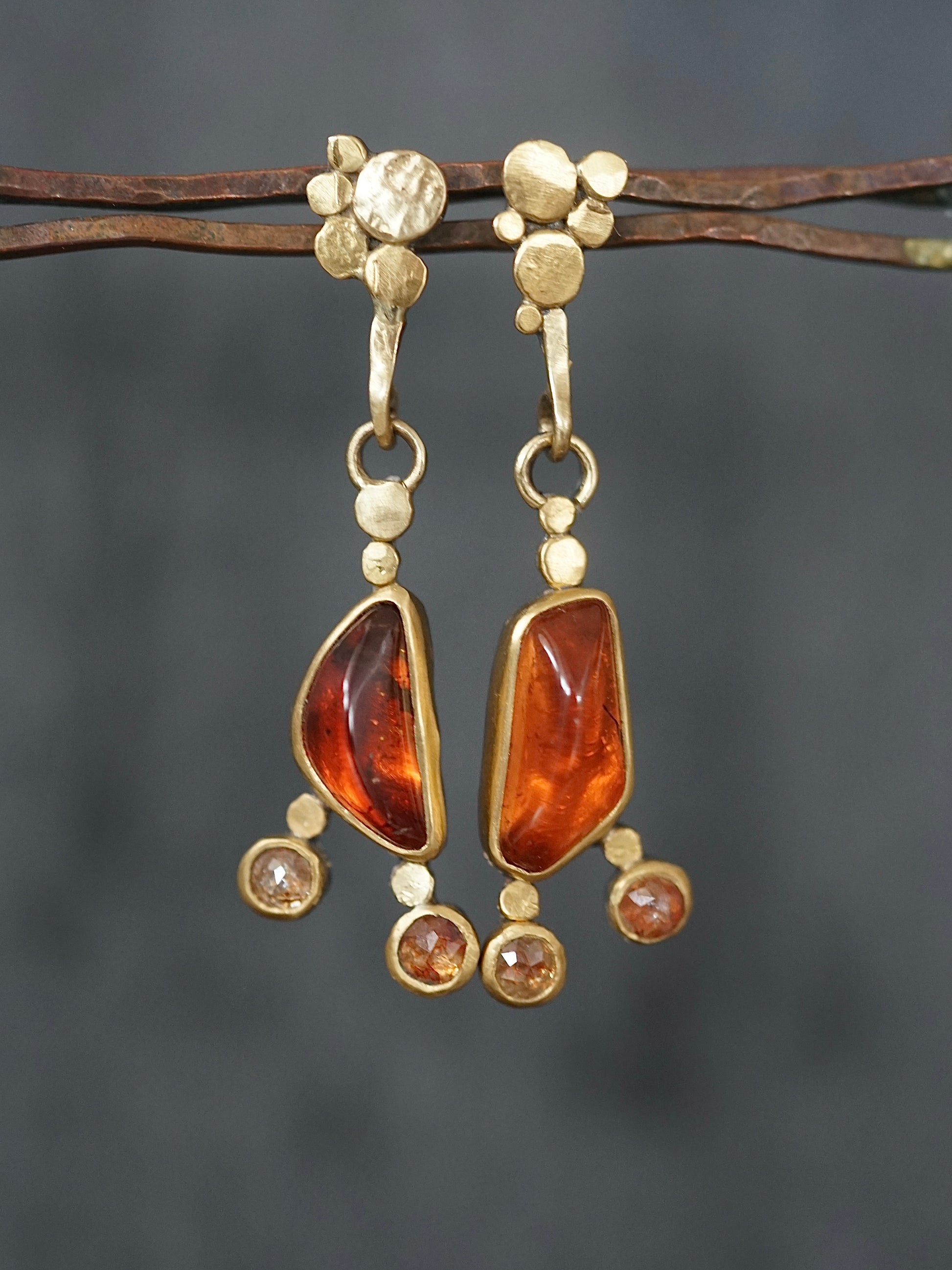 Asymmetrically shaped hessonite garnets with an organic, smooth cut were set in 22k gold and combined with reddish-brown, rose-cut diamonds to create this exquisite set. Little gold embellishments were added and gold cluster posts were created to allow these beauties to dangle and move.