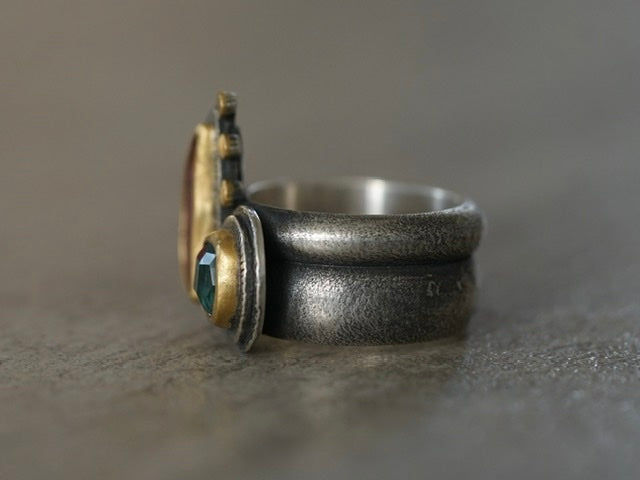Two boldly colored tourmalines, one in hot pink with darker inclusions and one in a deep aqua blue, are the central elements of this ring. The stones are placed on a layered and textured sterling backplate, accented by little gold discs. The textured sterling silver double band completes the look and gives this ring a stable and secure feel. As most mazulou items his ring is one of a kind.