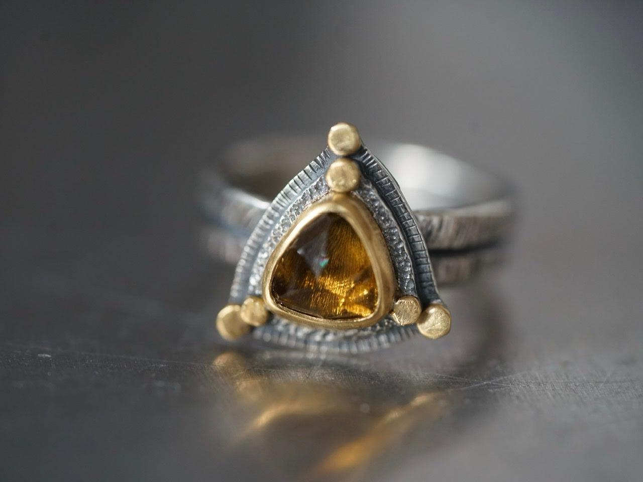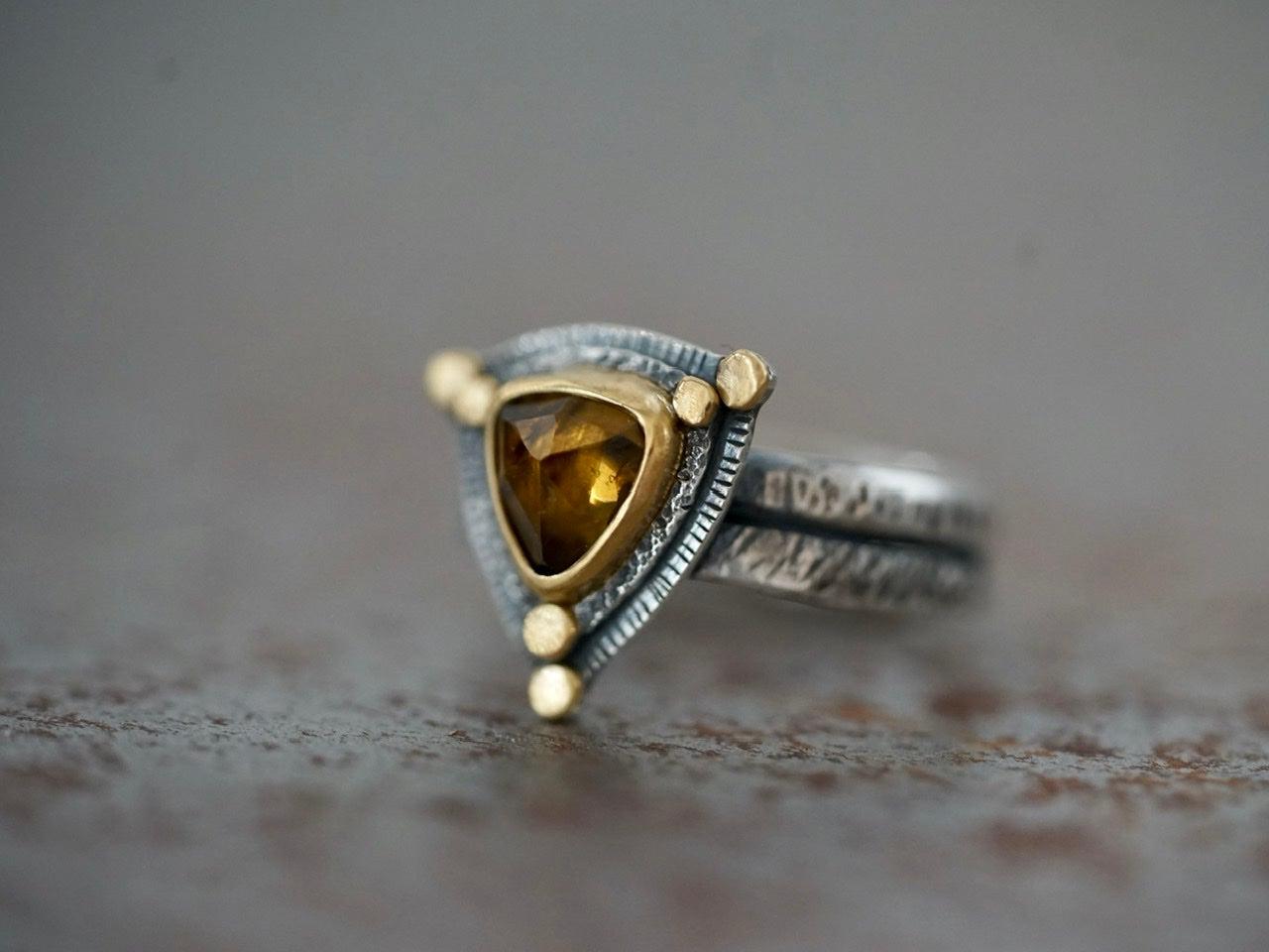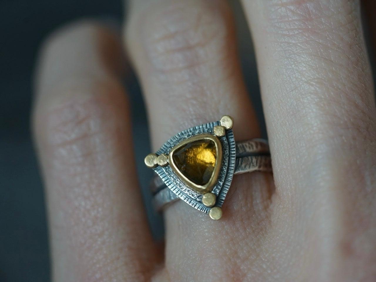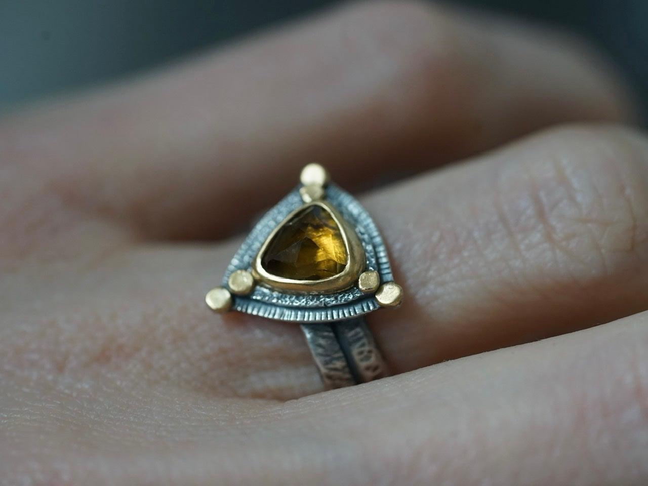 Stone: 8 x 8 mm faceted triangular golden brown sphene, set in 22k gold