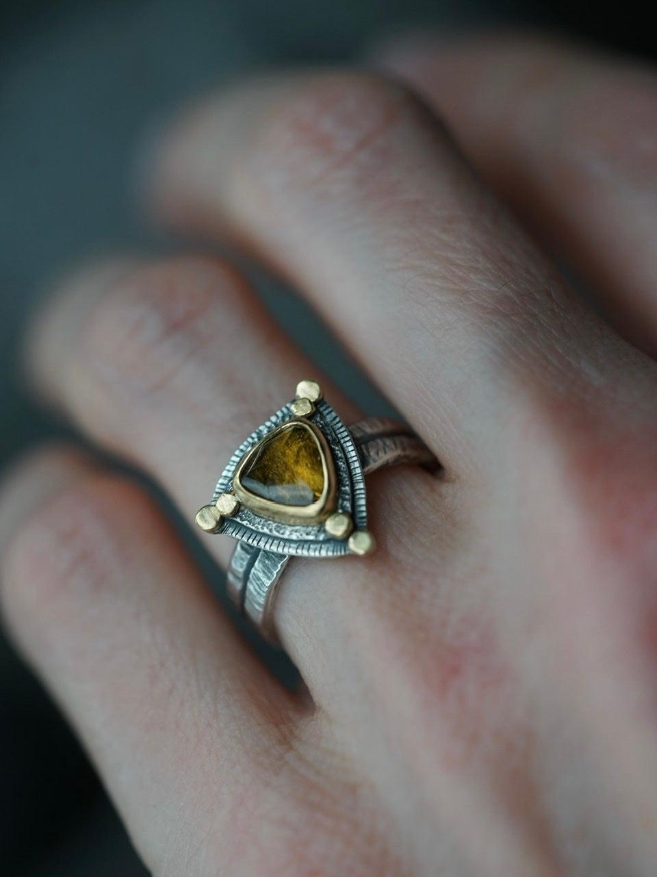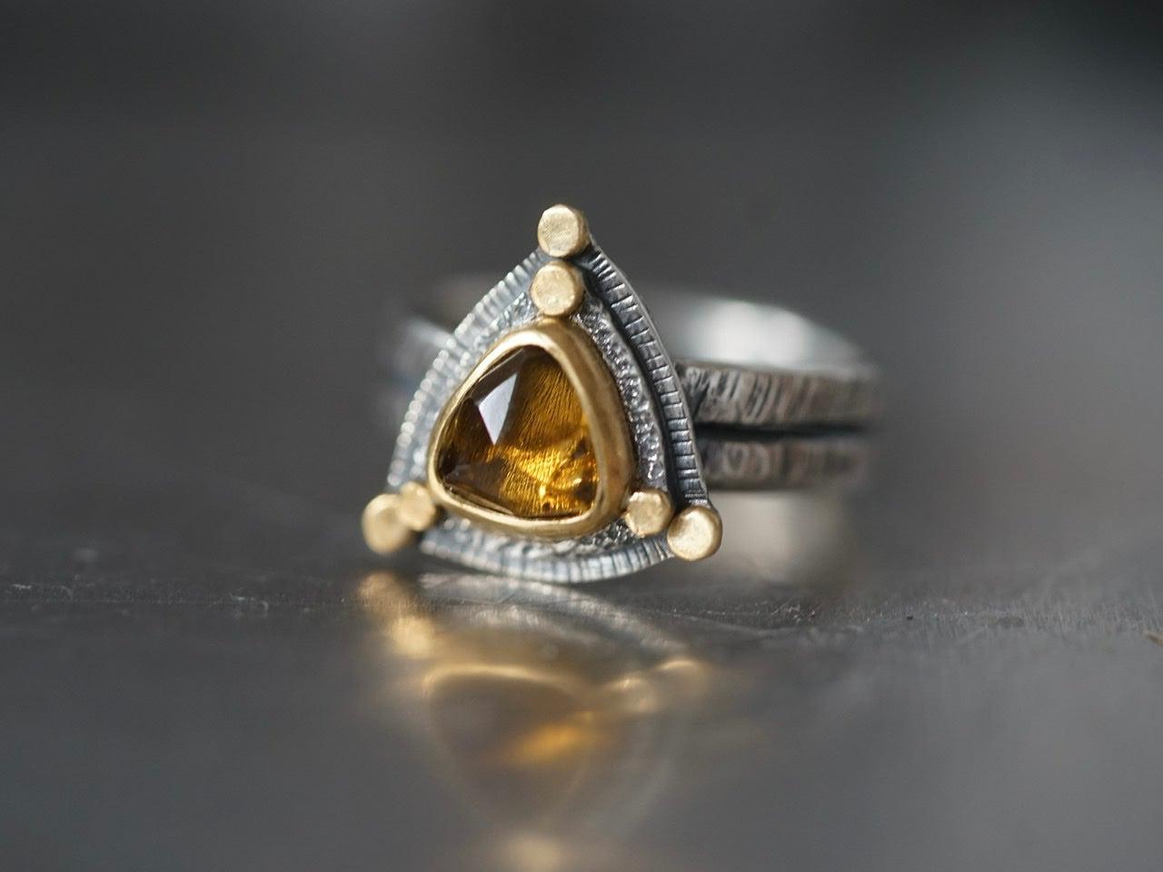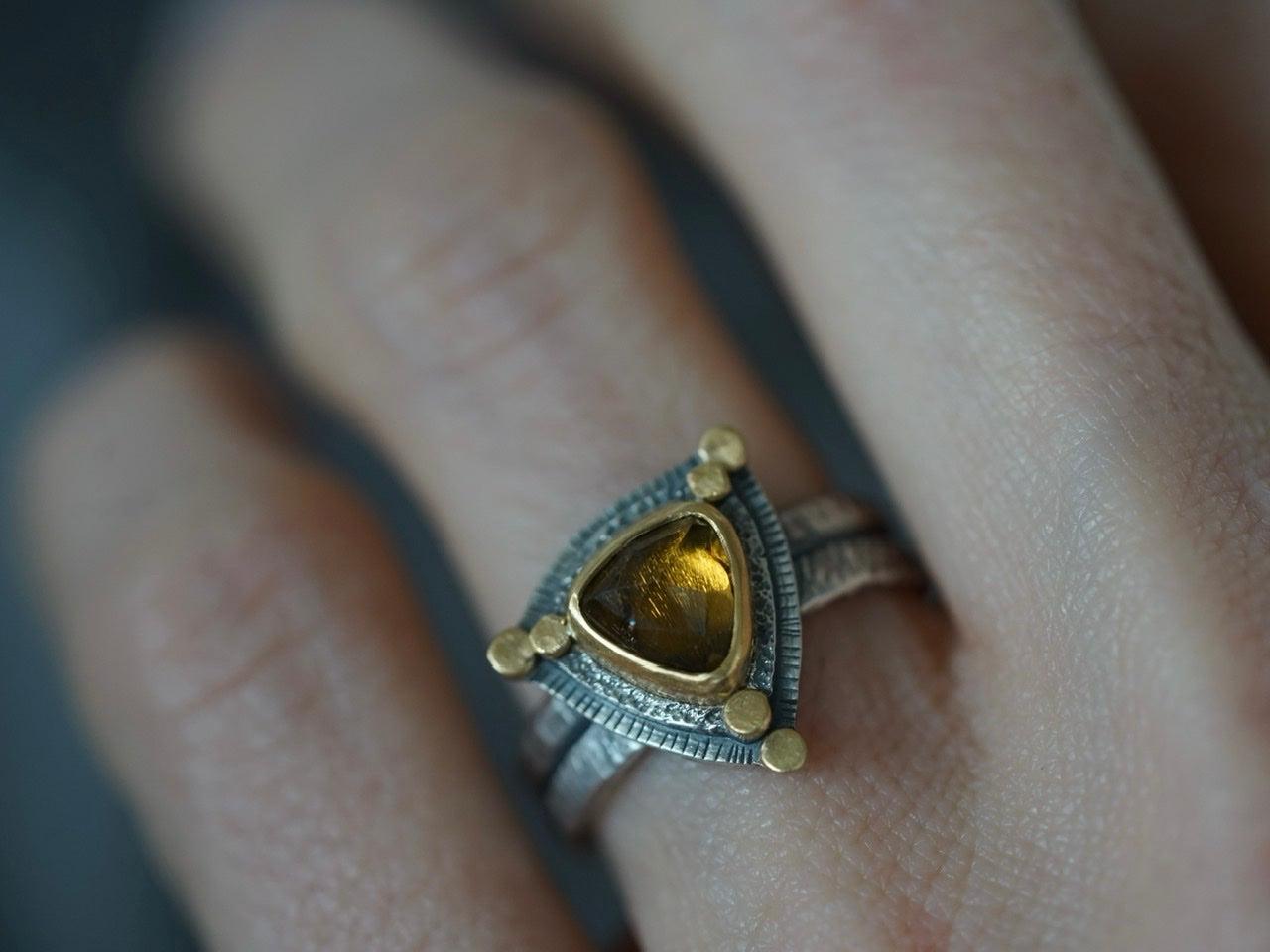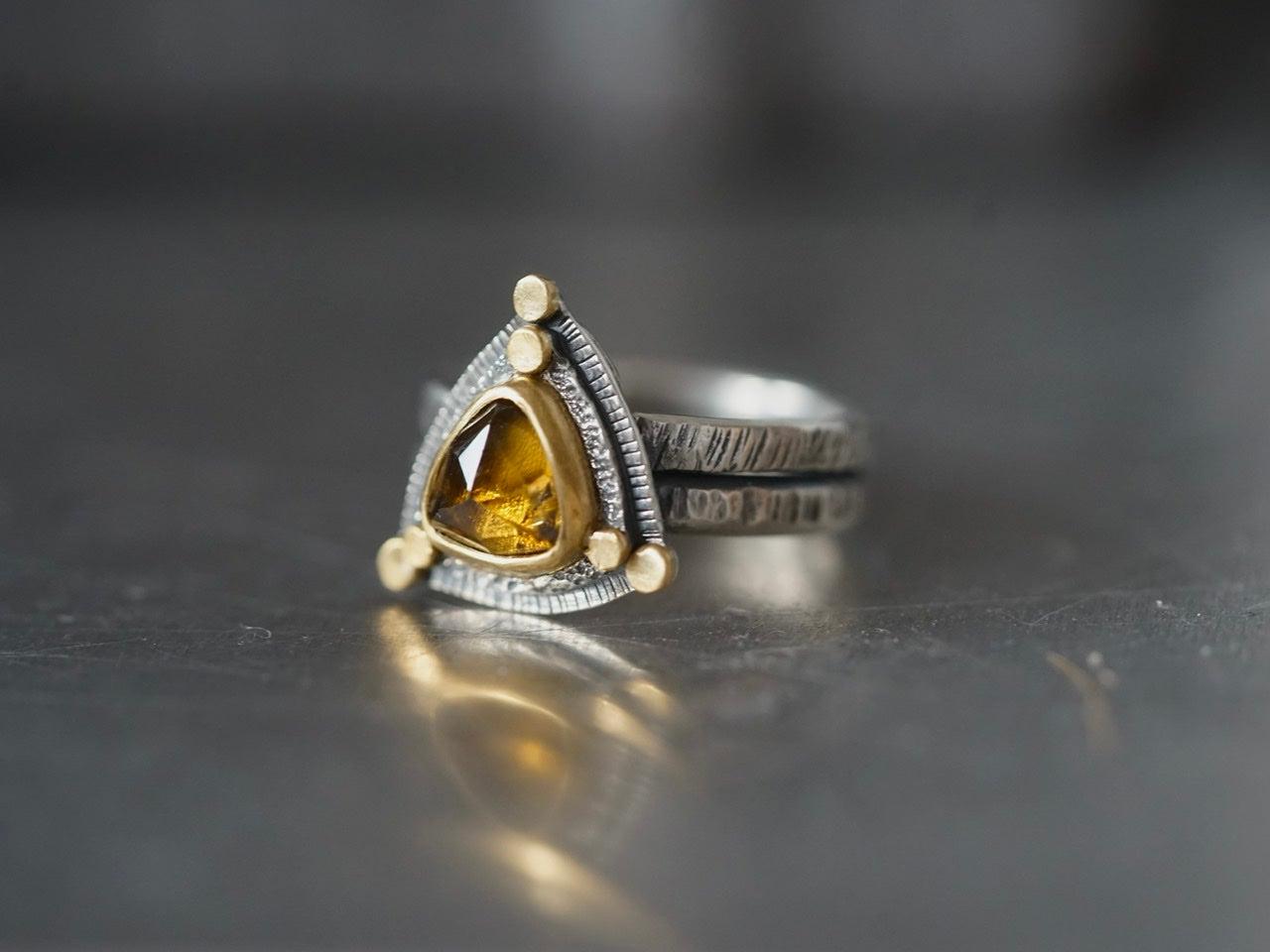 Stone: 8 x 8 mm faceted triangular golden brown sphene, set in 22k gold