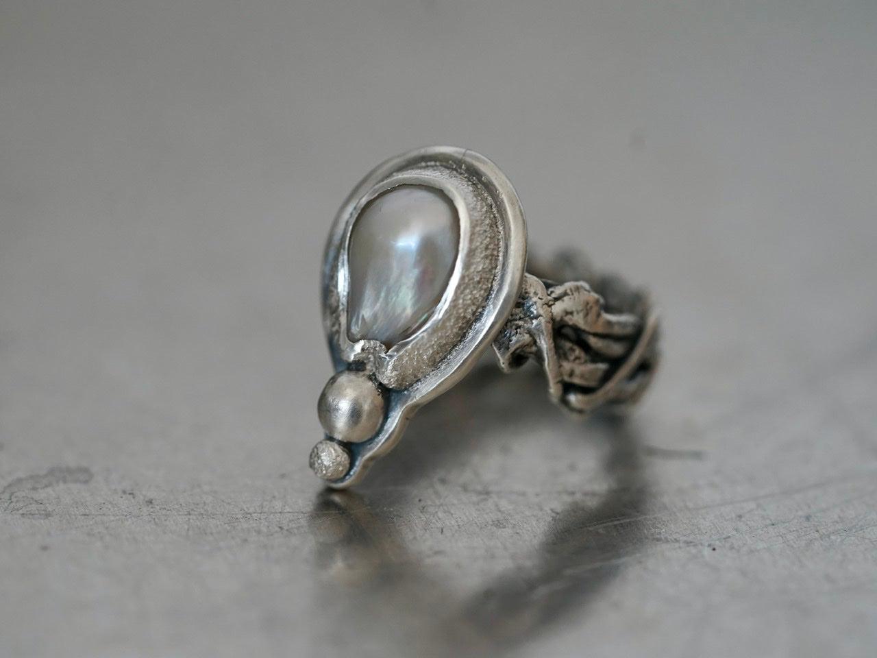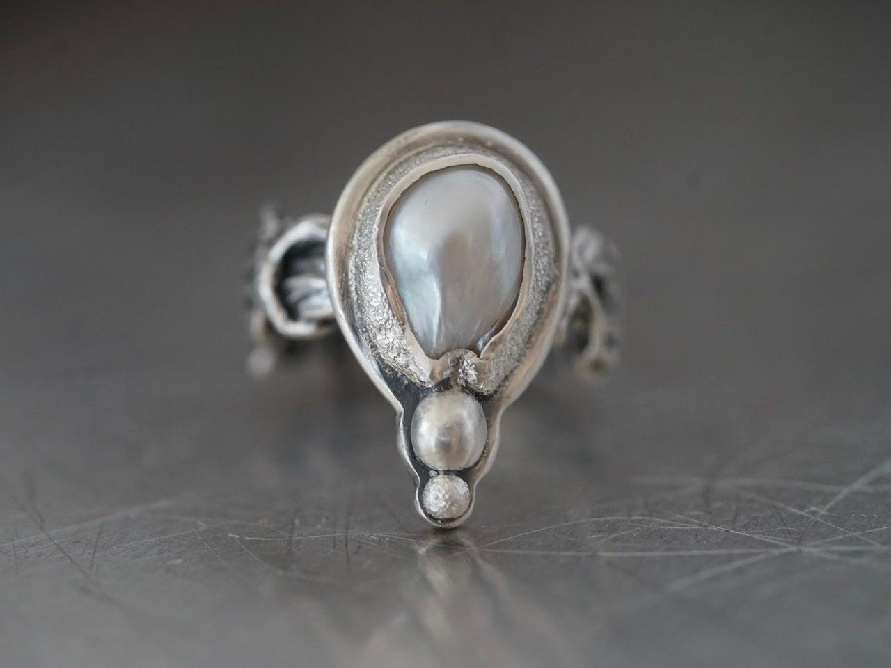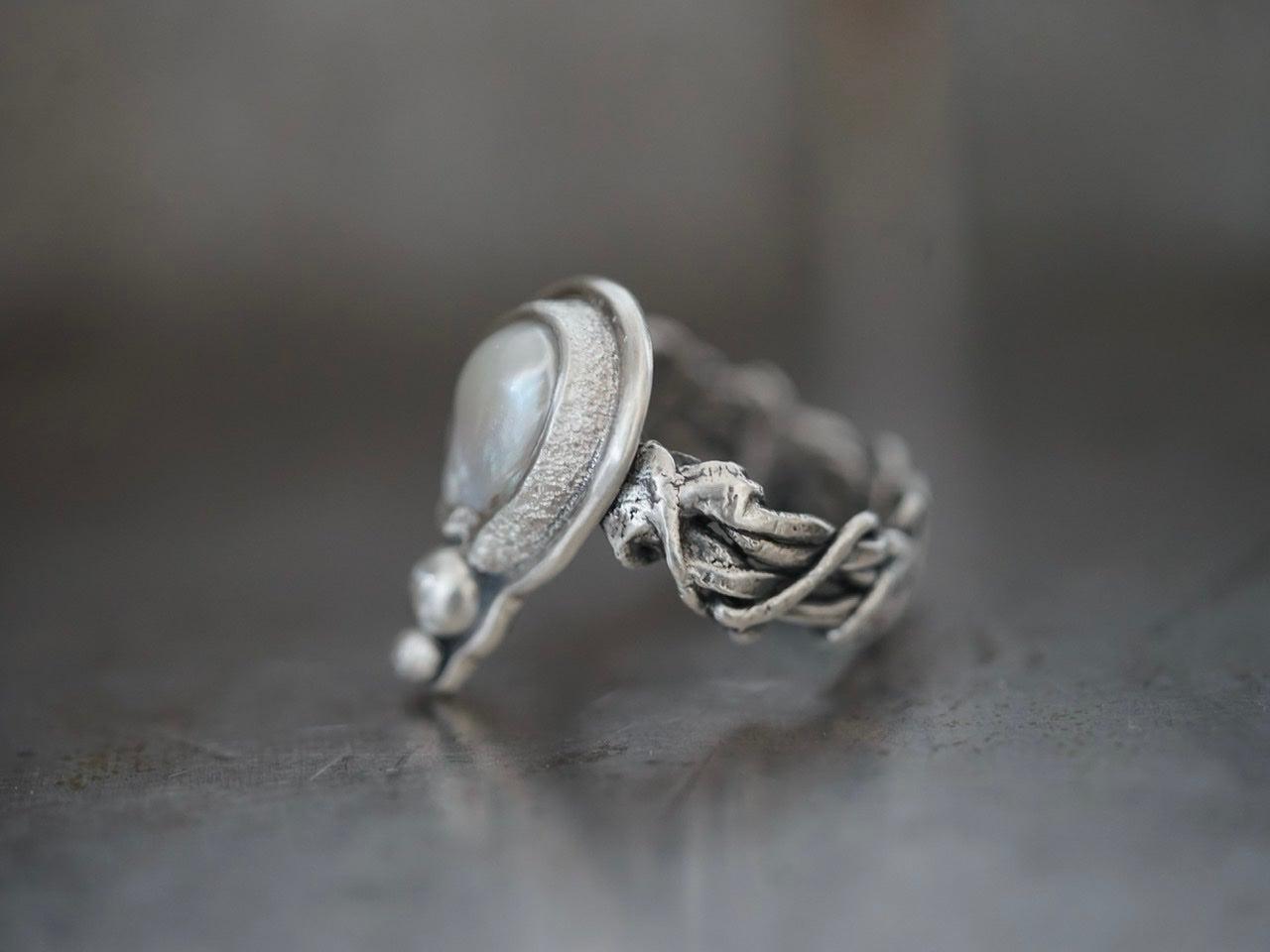 The freshwater pearl is enfolded by a textured, organically shaped fine silver bezel and sits on a setting embellished with two little sterling silver spheres which complement the shape of the pearl. The band of this ring was created from intertwined and fused sterling silver wires. The ring was oxidized to accentuate the textured surfaces, I polished it to a satin sheen. This piece is one of a kind, its shape and feel is determined by the natural form of the pearl.