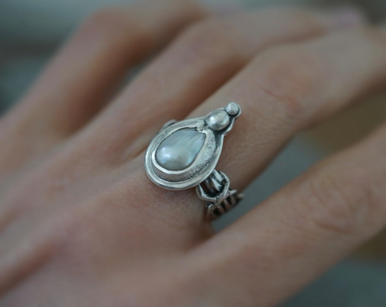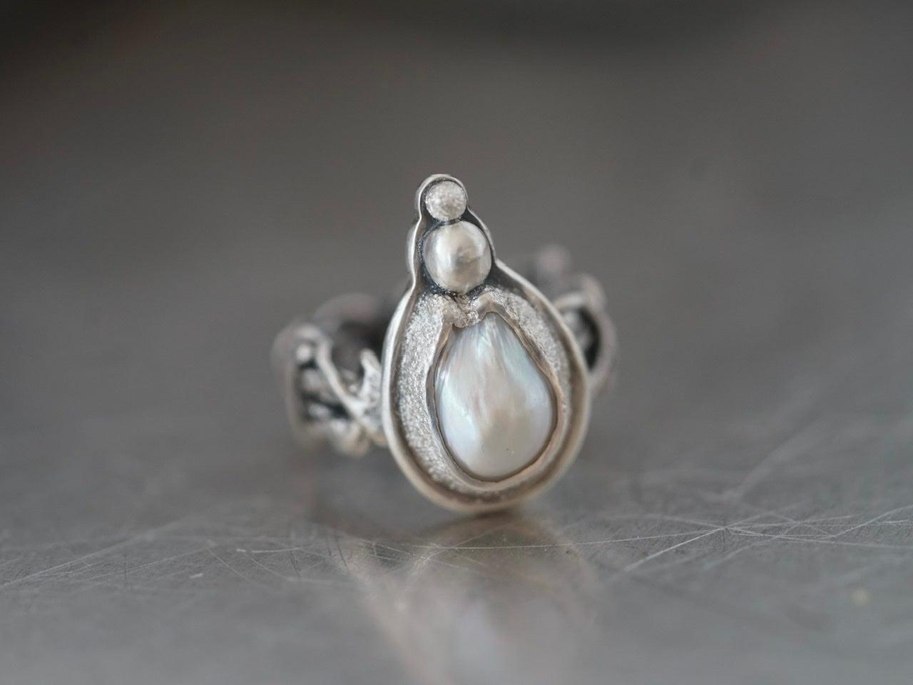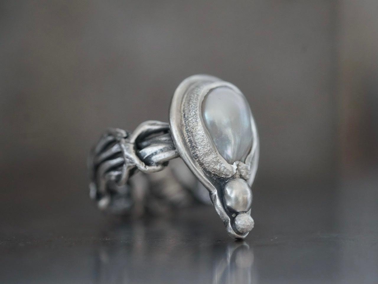 The freshwater pearl is enfolded by a textured, organically shaped fine silver bezel and sits on a setting embellished with two little sterling silver spheres which complement the shape of the pearl. The band of this ring was created from intertwined and fused sterling silver wires. The ring was oxidized to accentuate the textured surfaces, I polished it to a satin sheen. This piece is one of a kind, its shape and feel is determined by the natural form of the pearl.