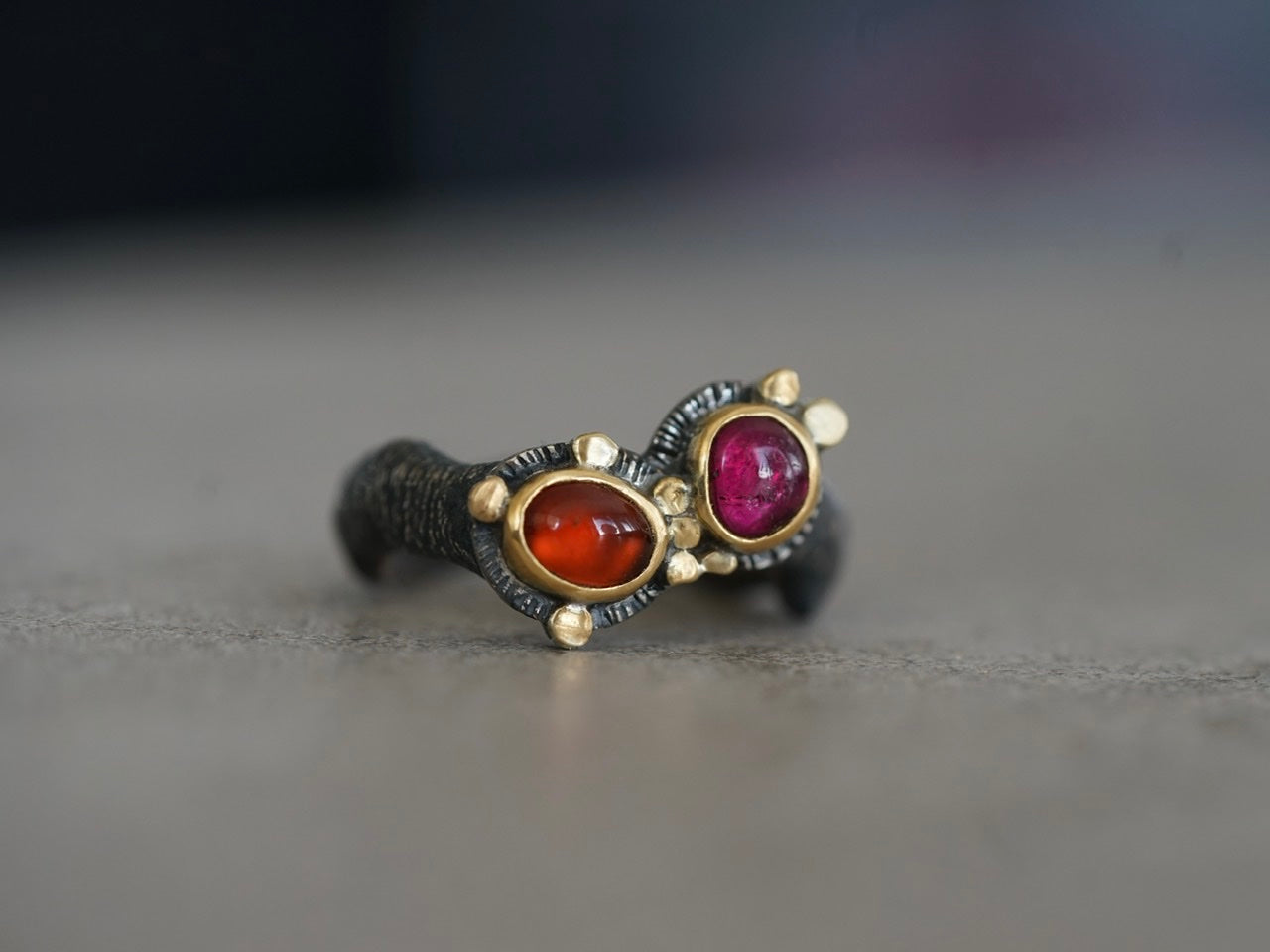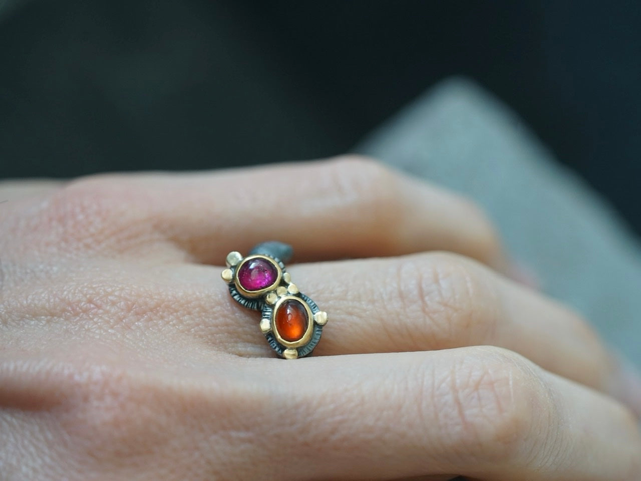 A substantial, organically shaped, blackened sterling silver band holds a gold set fuchsia coloured tourmaline and a deep red garnet. Small 22k gold embellishments accentuate the vibrancy of the color scheme and contrast nicely with the earthy feel of the band. As most mazulou items this ring is one of a kind.