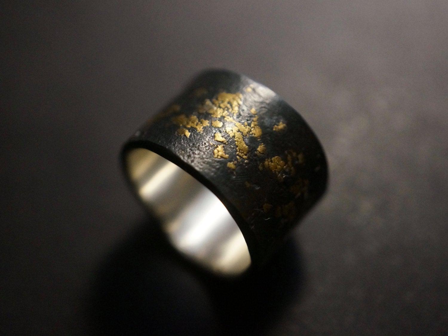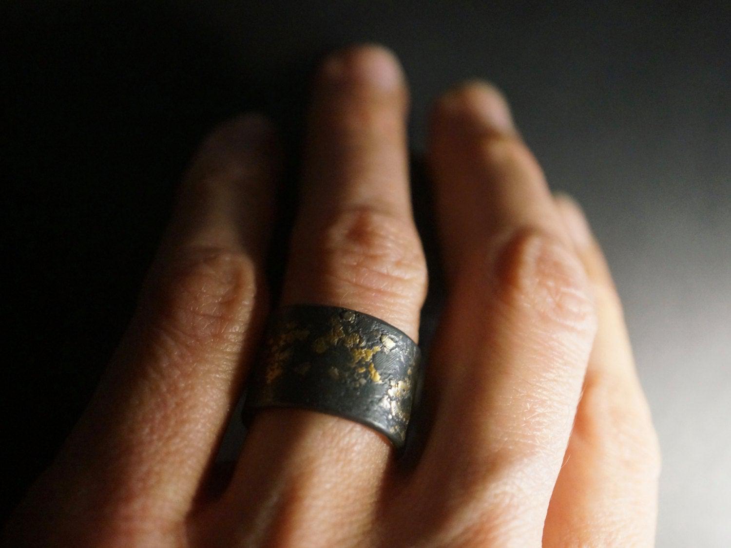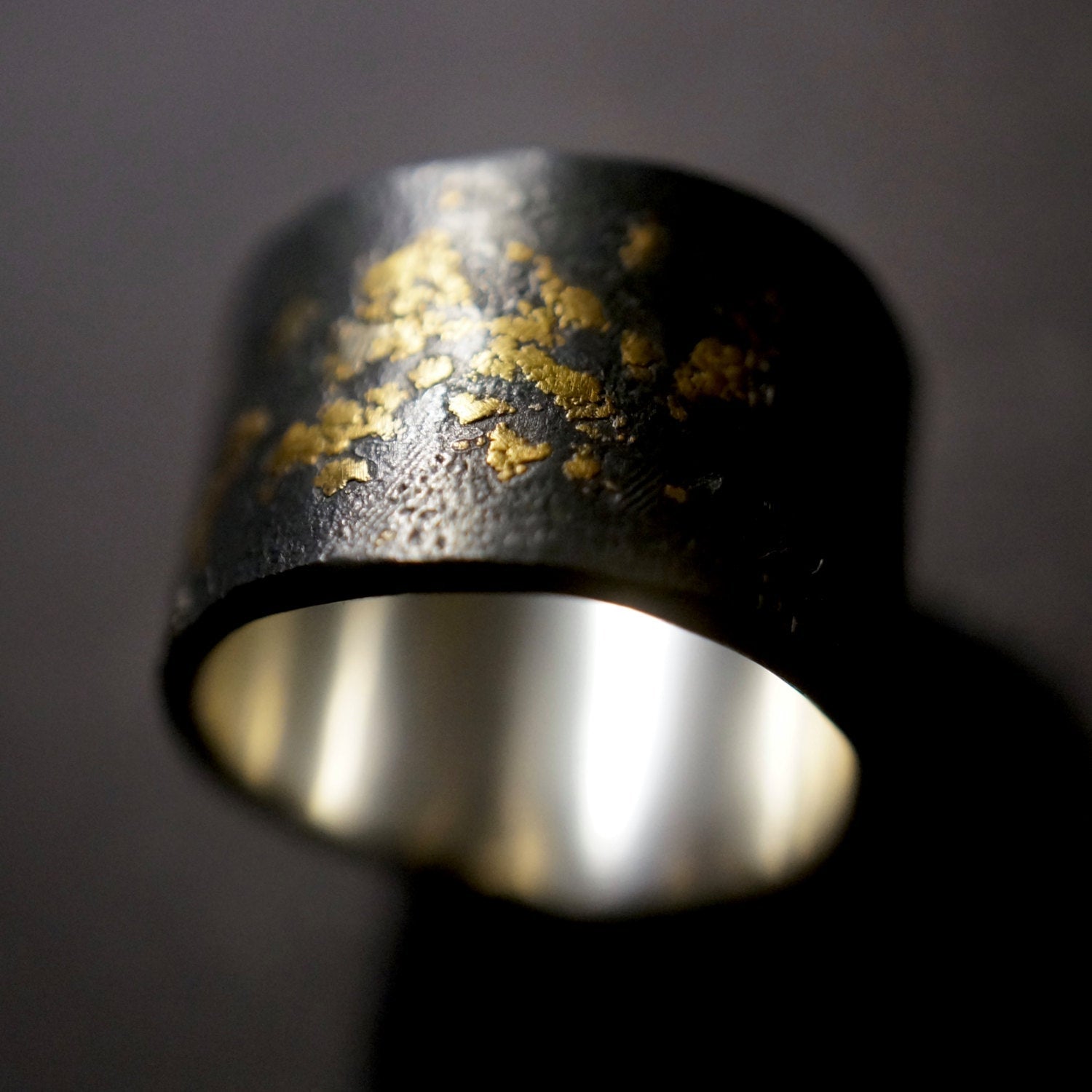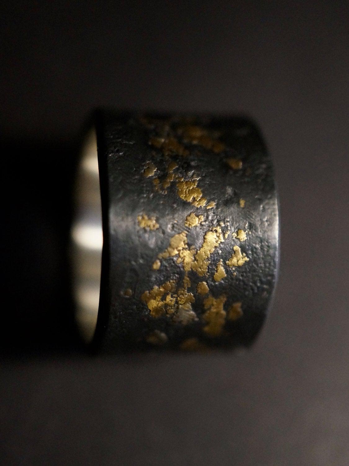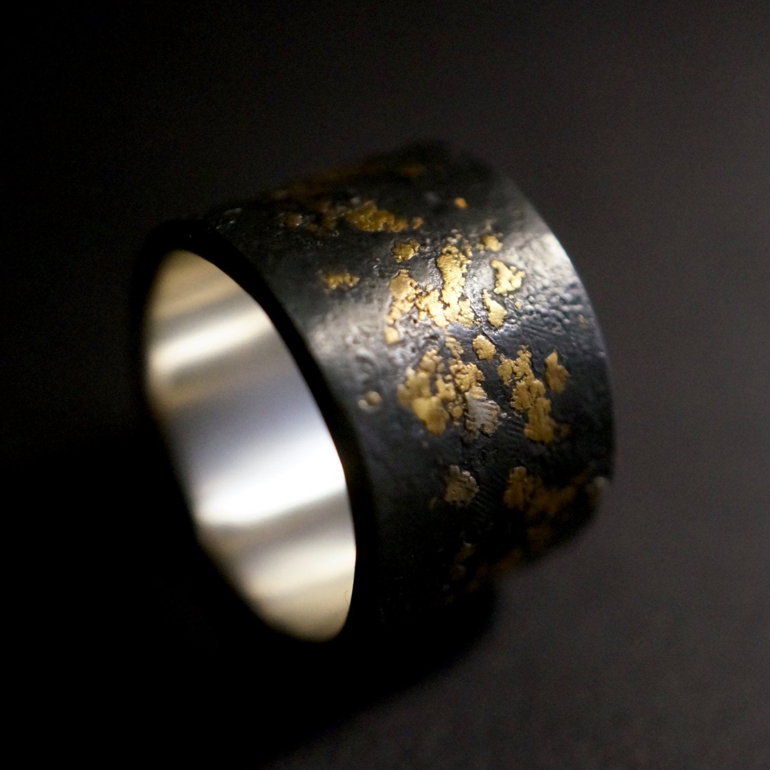 Midas interrupted: oxidised Sterling Silver band, fused with 24K gold dust, a simple ring, unique on second look. This version has a wider band and a rougher texture than my original Midas rings, it makes a bolder statement but still would make a great partner ring, wedding band or gift.