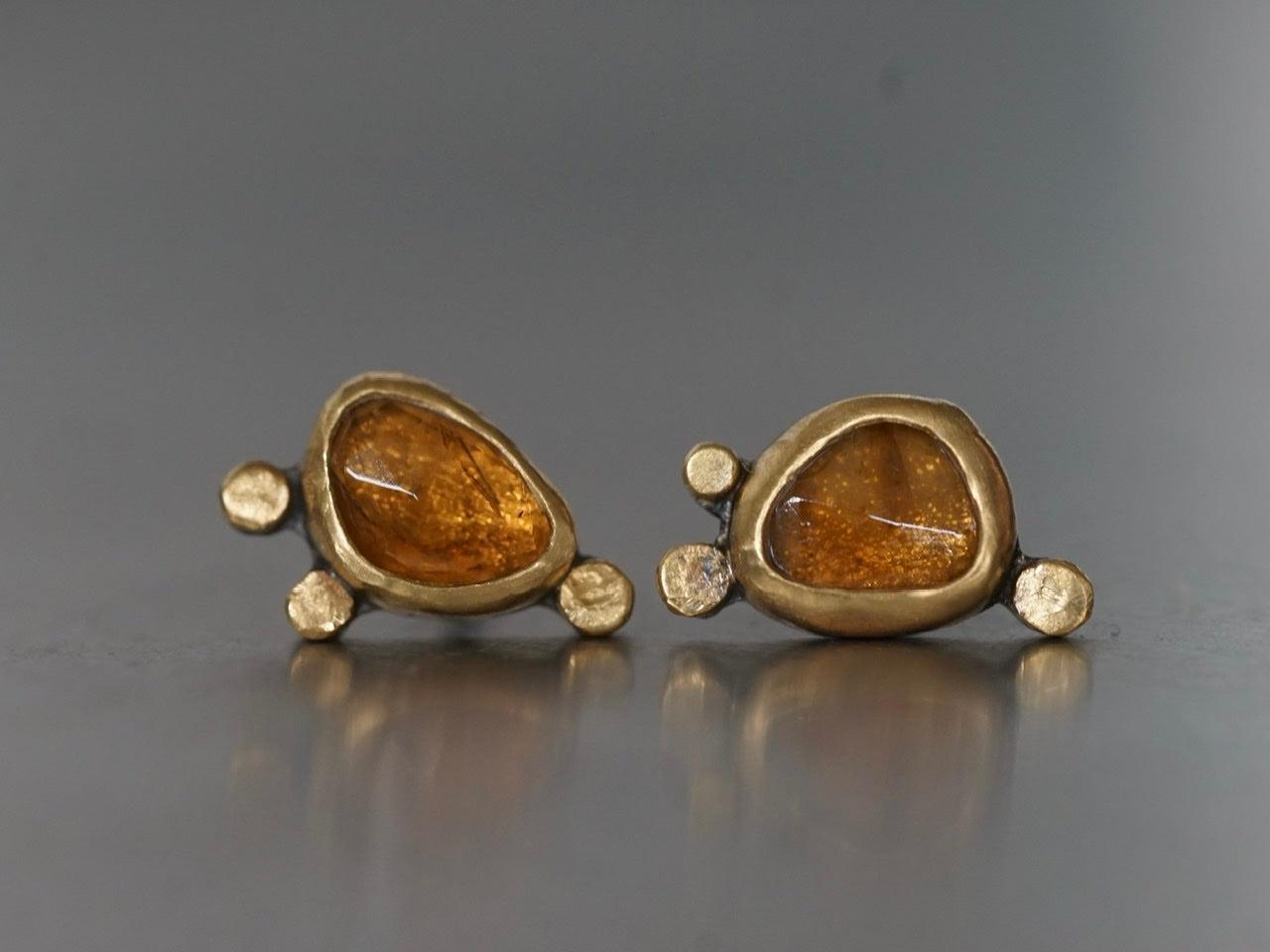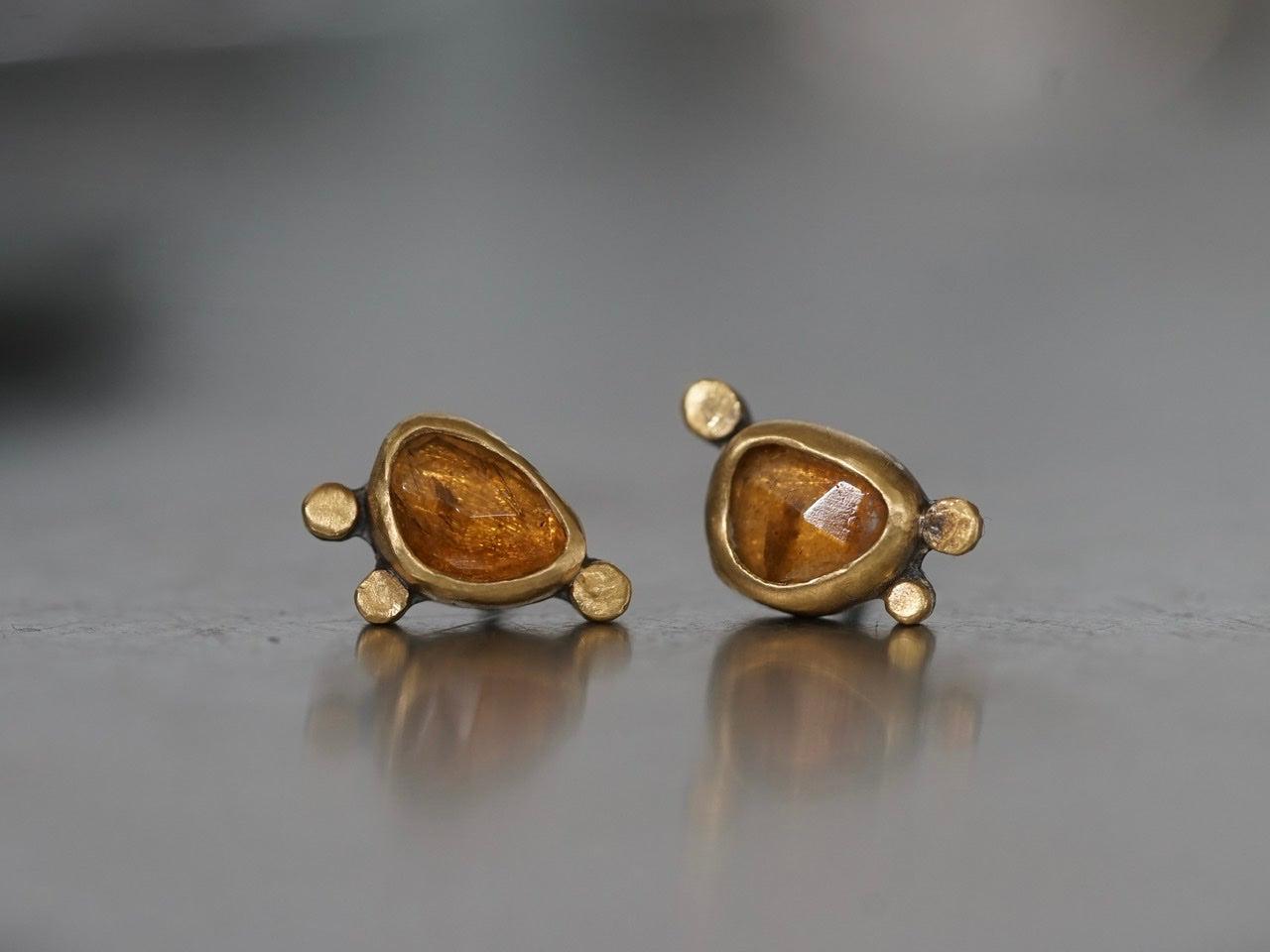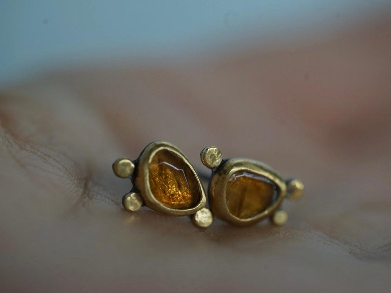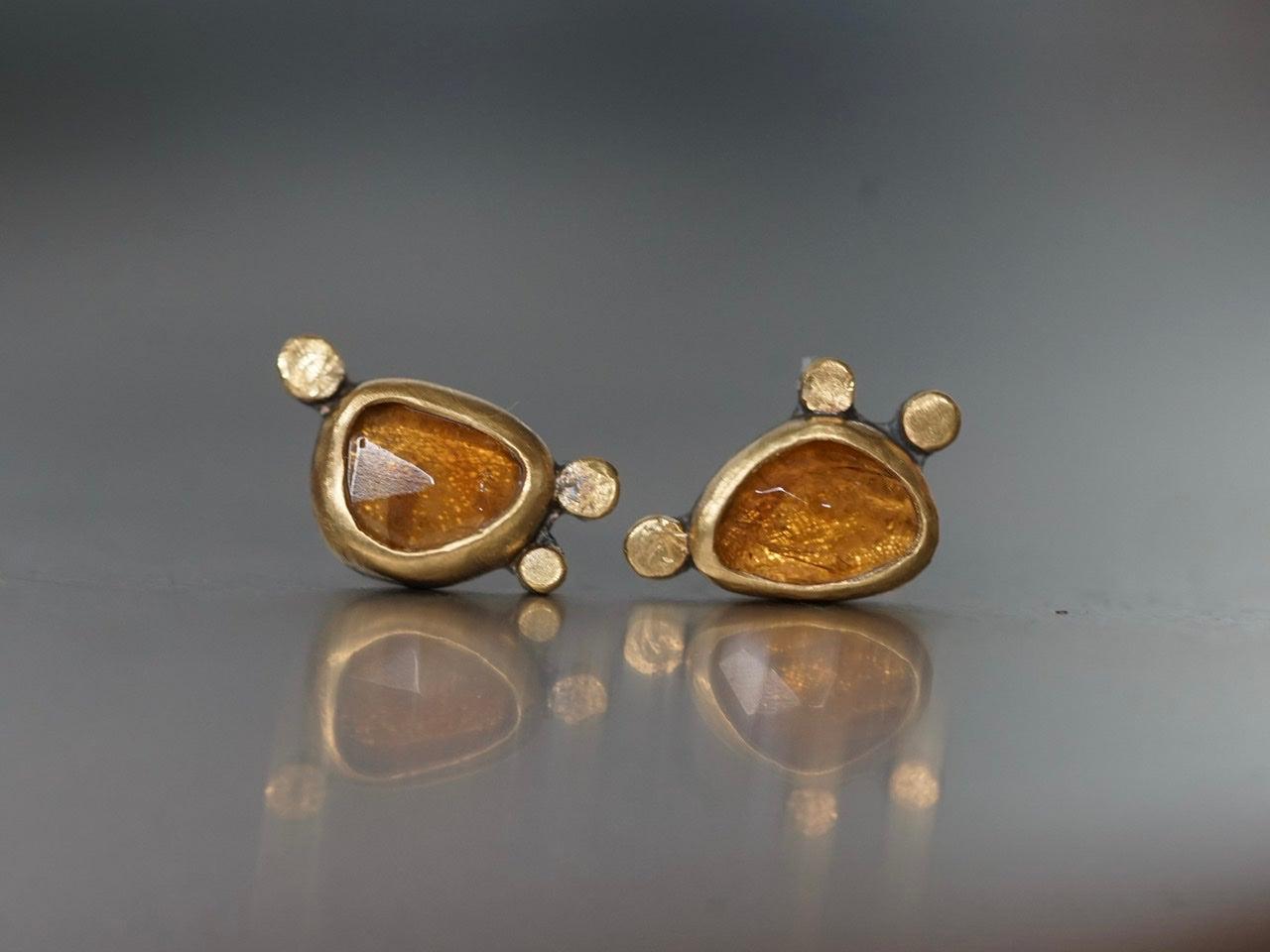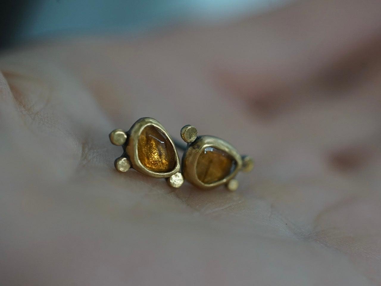 These lovely little earrings feature rose cut, honey colored tourmalines, set in 22k gold and embellished with little gold discs. They are fastened with sterling silver posts and friction earnuts and are very comfortable to wear.