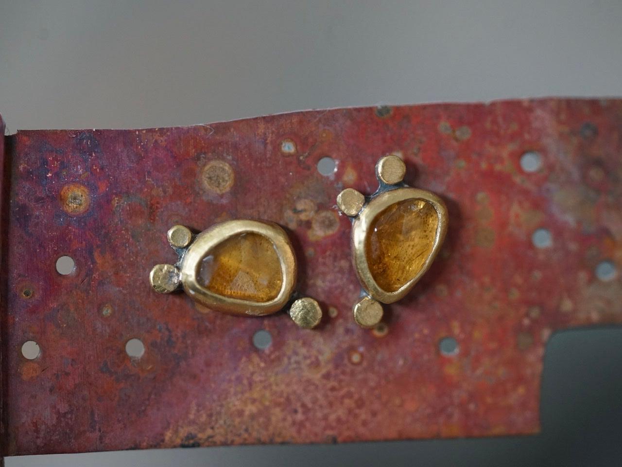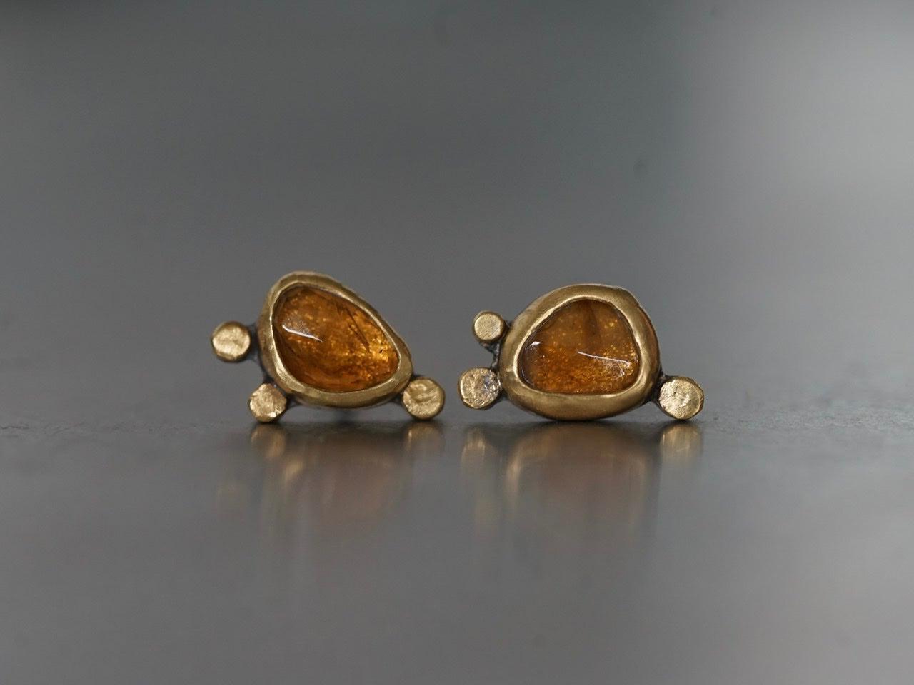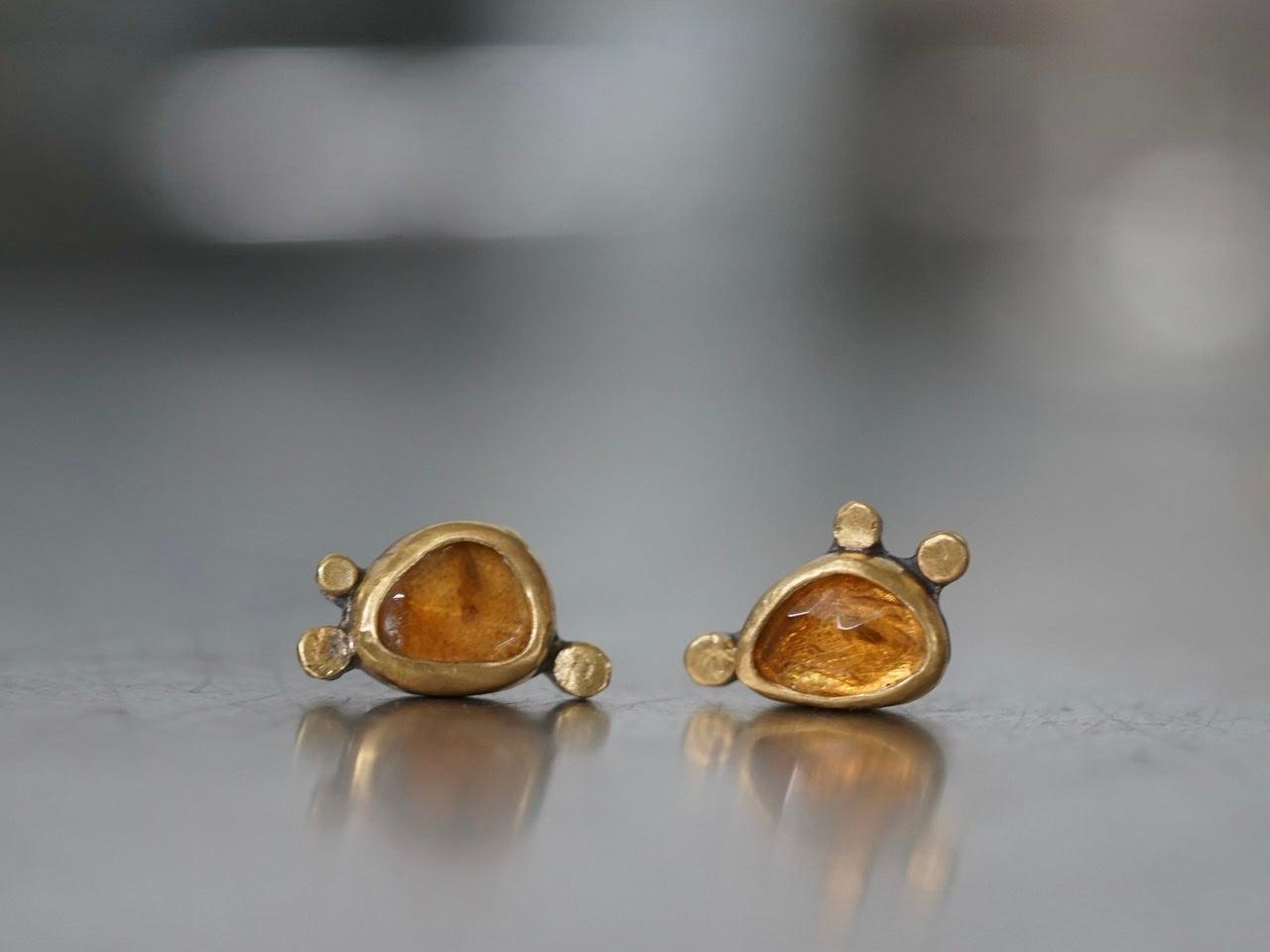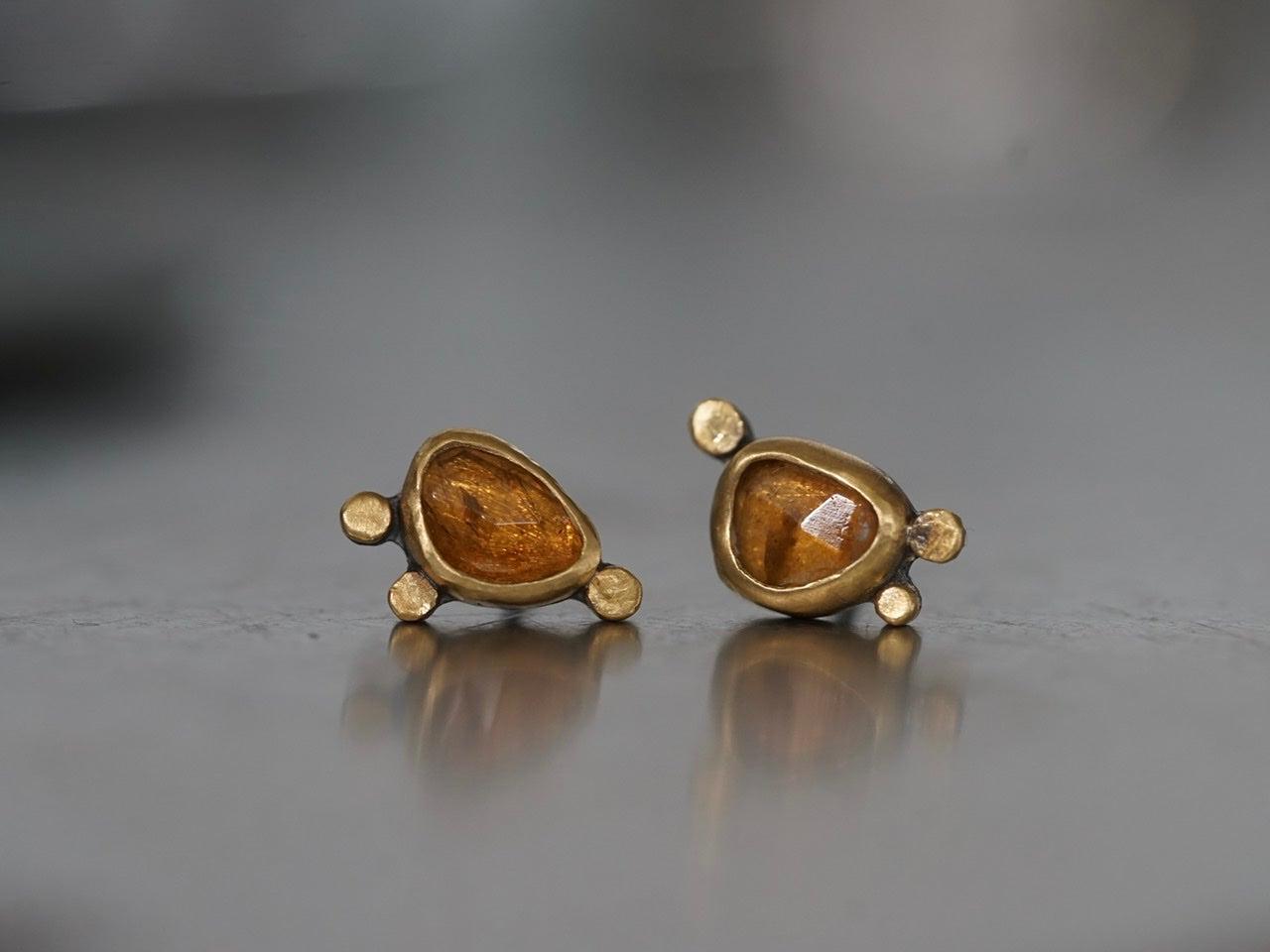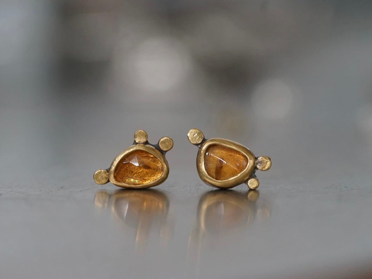 These lovely little earrings feature rose cut, honey colored tourmalines, set in 22k gold and embellished with little gold discs. They are fastened with sterling silver posts and friction earnuts and are very comfortable to wear.