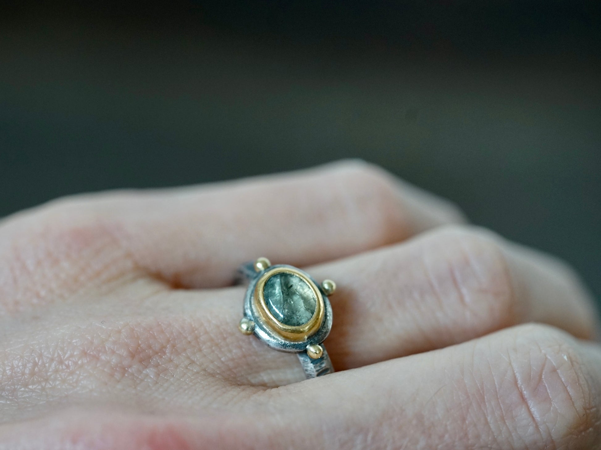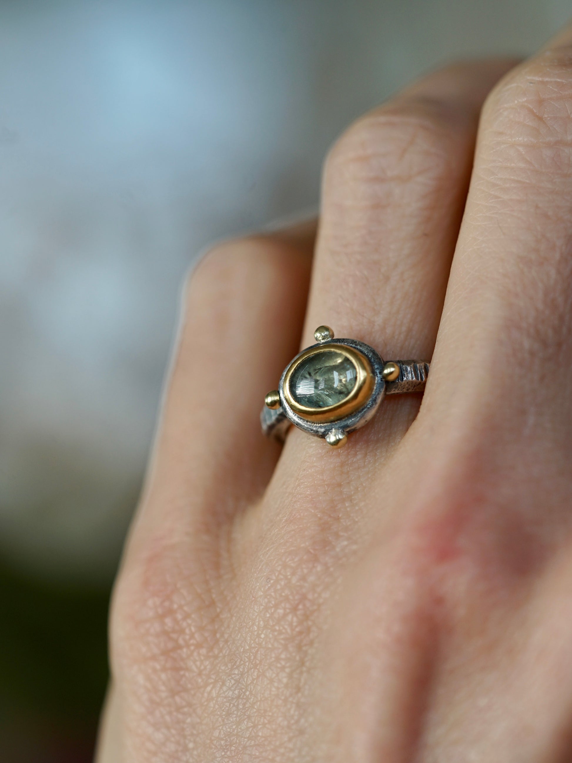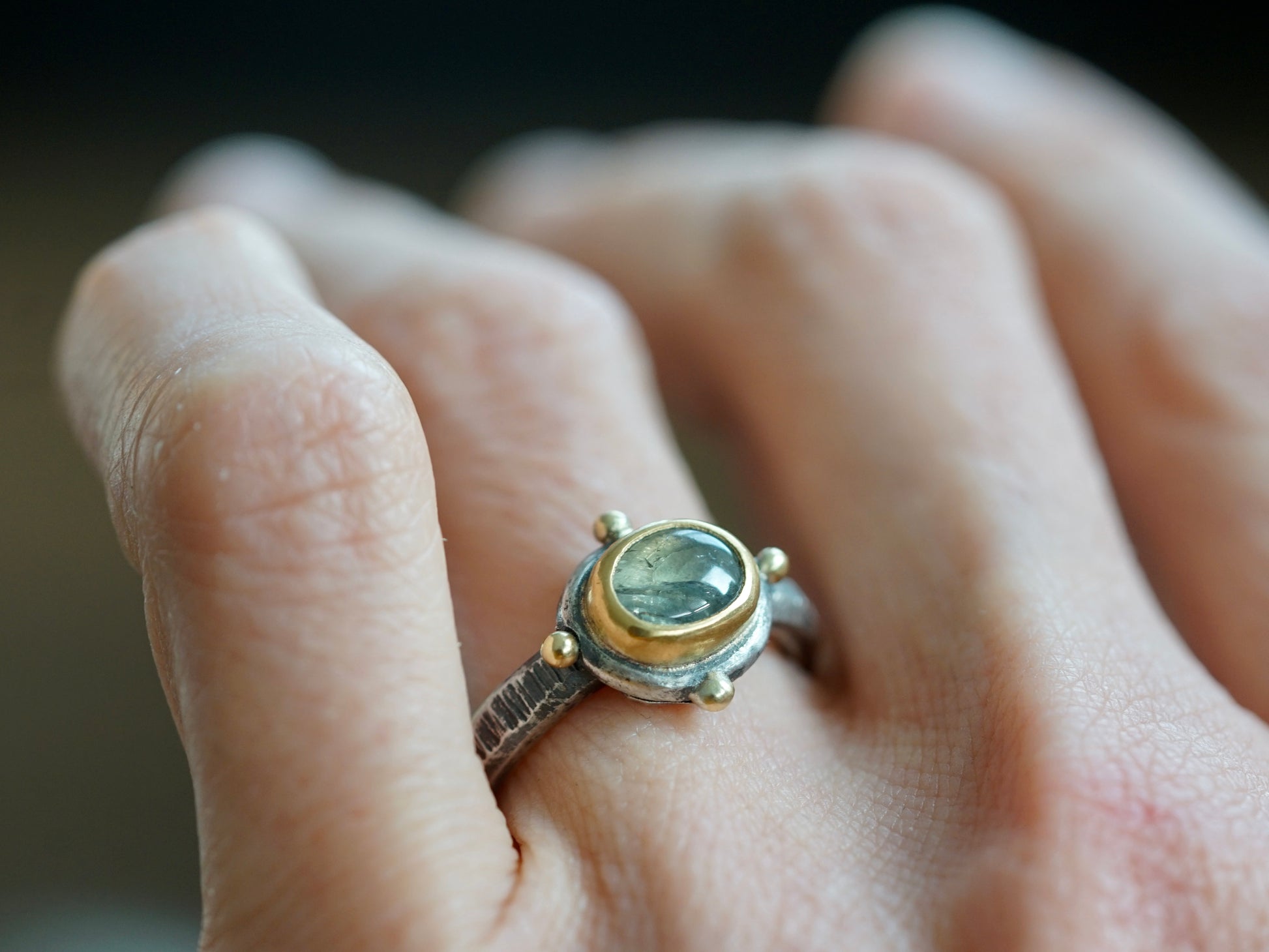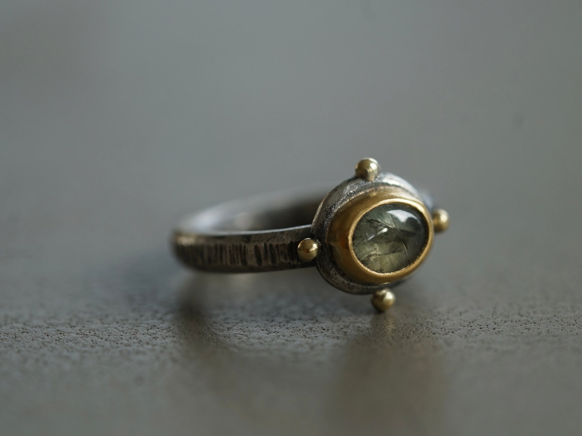 This is a custom made directions ring, size 7, featuring a green sapphire, set in 24k gold and surrounded by gold spheres. The stone is mounted on a hand-textured sterling silver band.