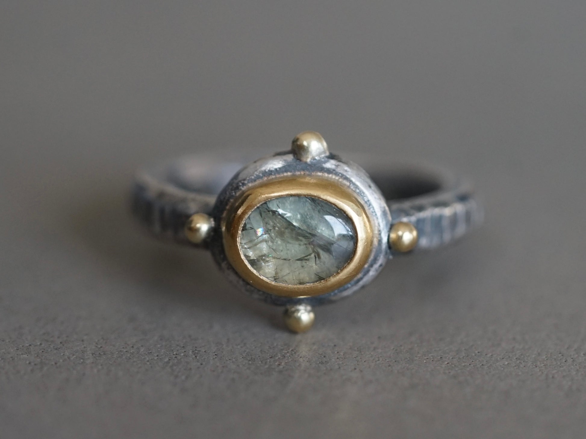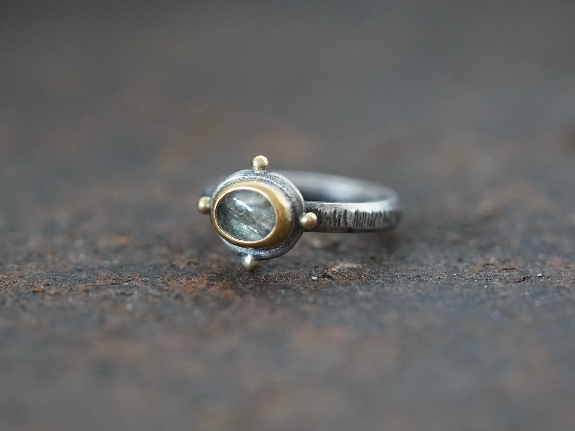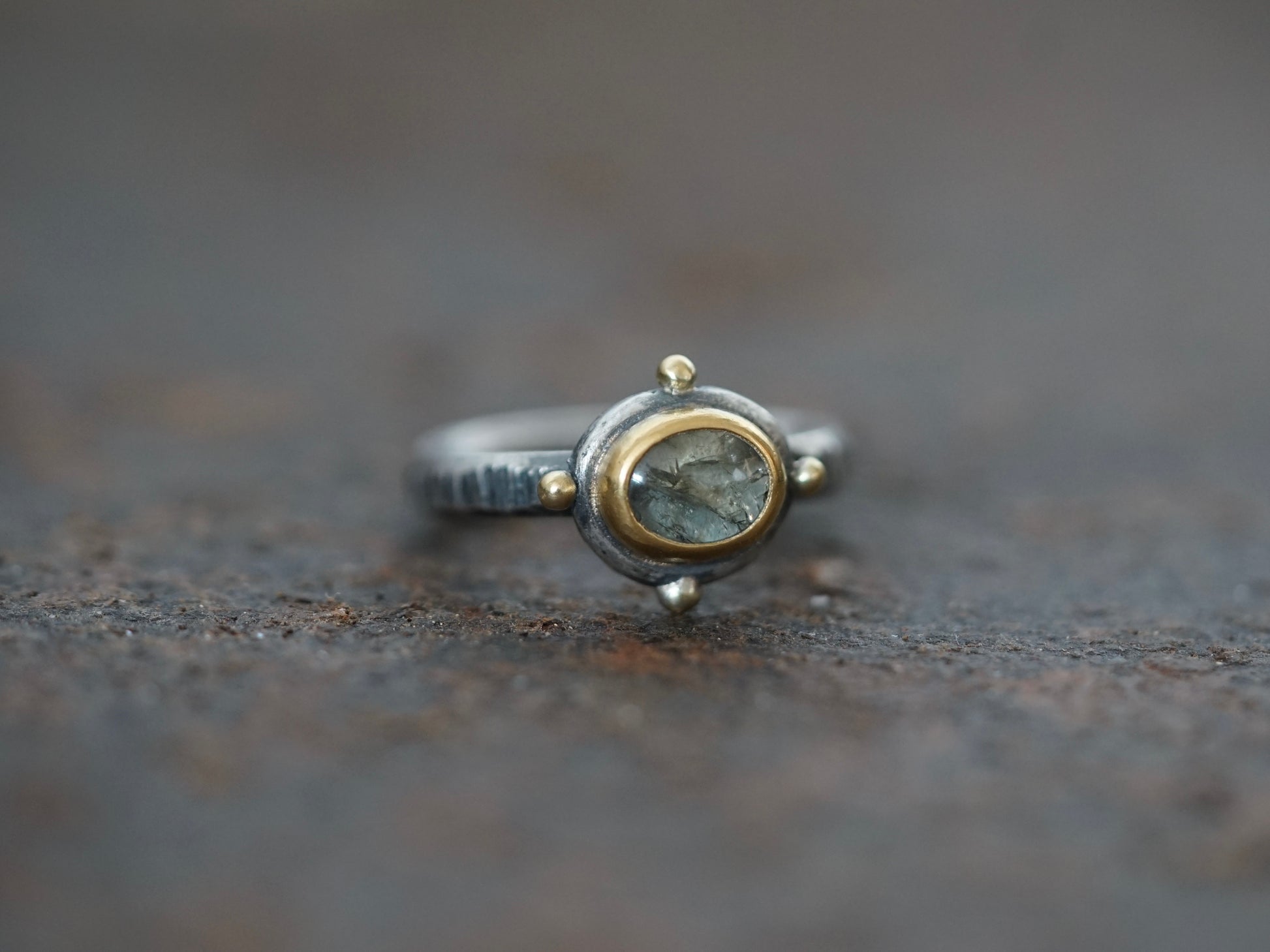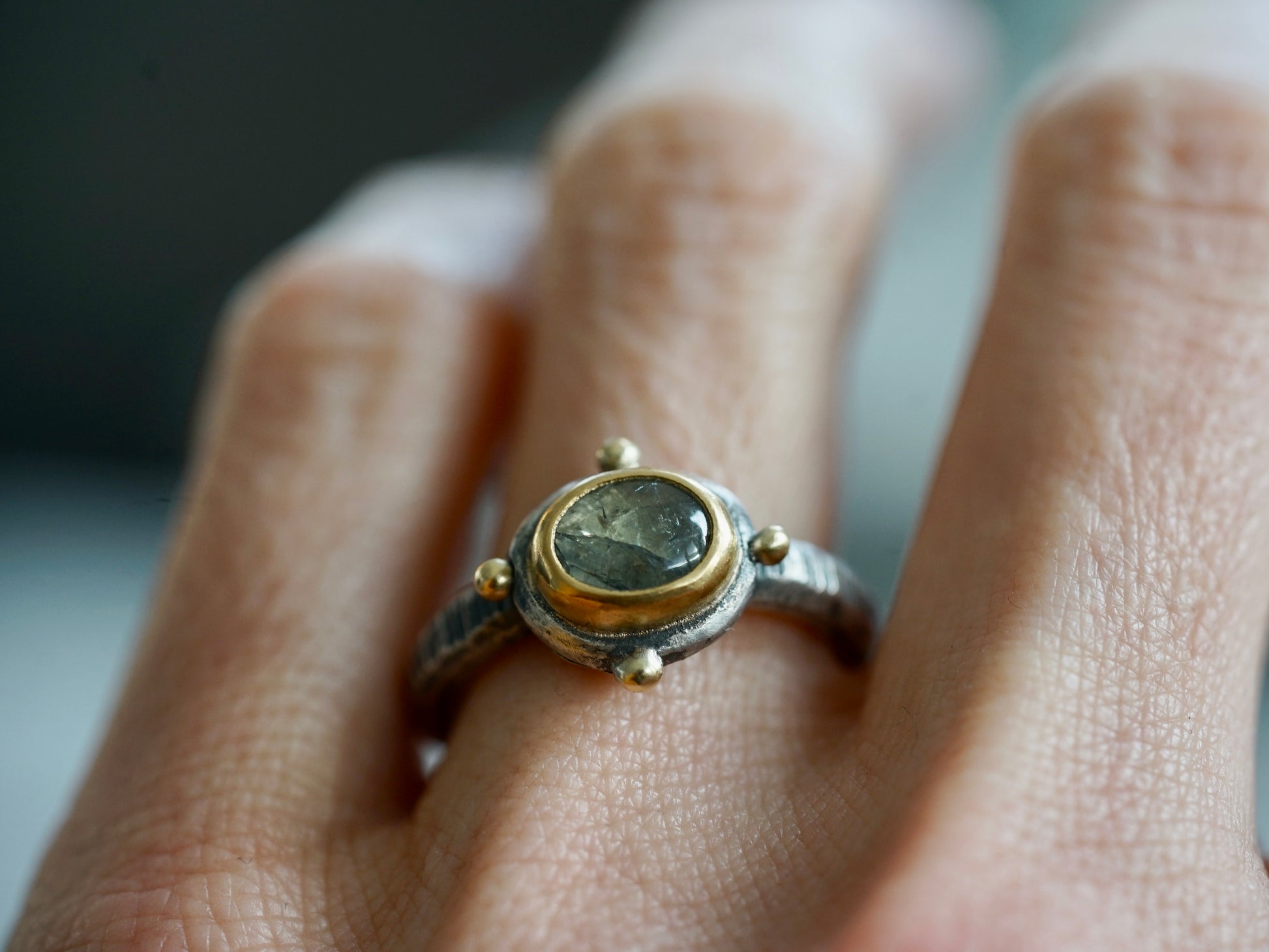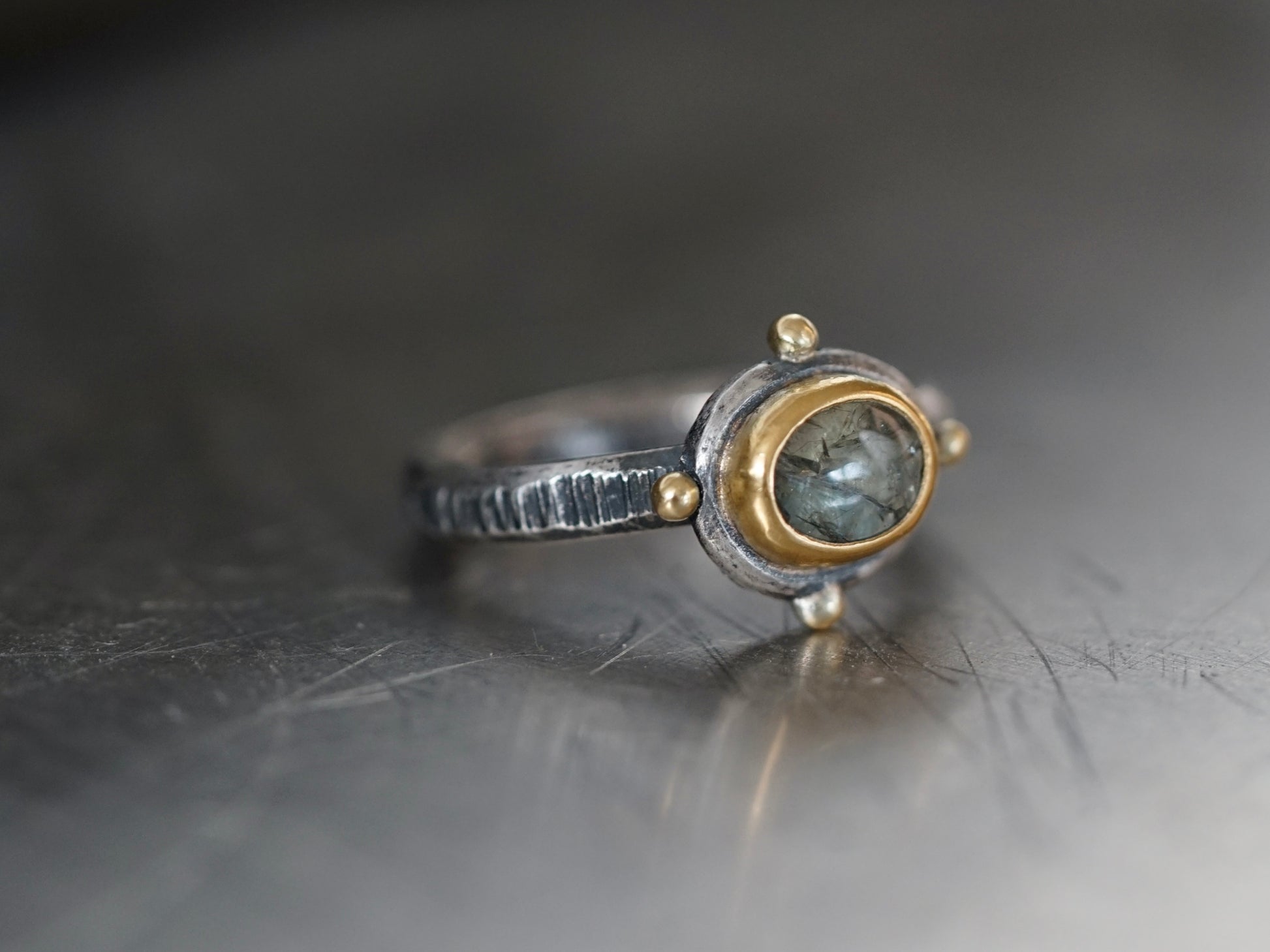 This is a custom made directions ring, size 7, featuring a green sapphire, set in 24k gold and surrounded by gold spheres. The stone is mounted on a hand-textured sterling silver band.
