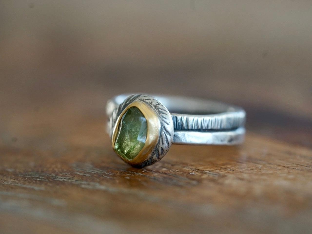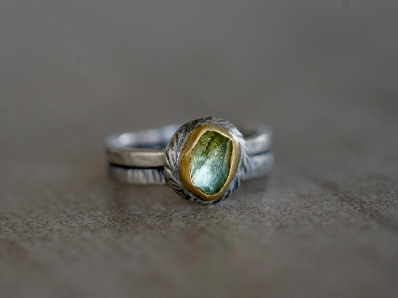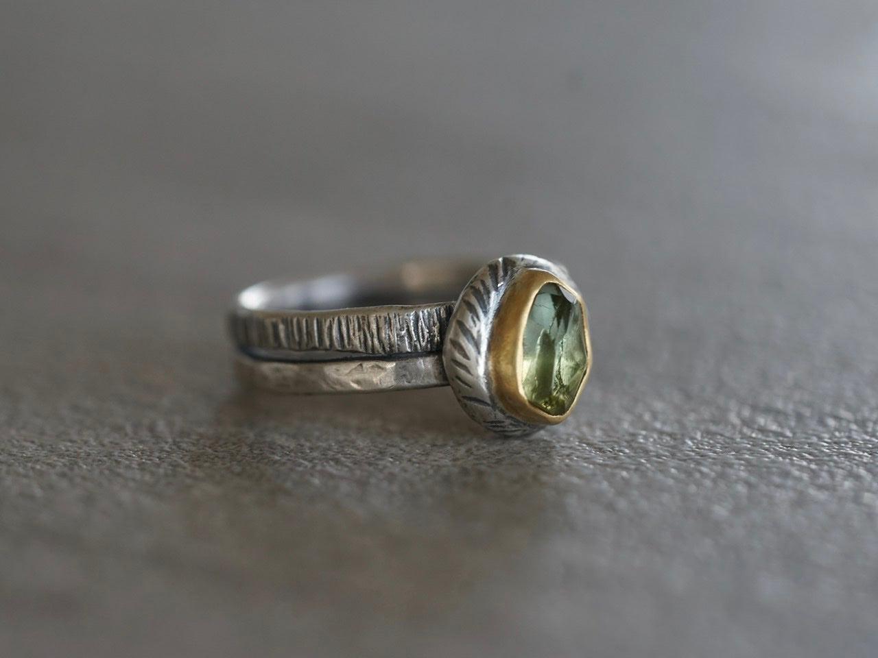 A light green tourmaline with yellow undertones is the focal element of this ring. The stone has an irregular cut and a great sparkle. The green colors pair beautifully with the warm Tones of the 22k gold. A carved and textured sterling silver pebble with an organic shape backs the setting. The look is completed with a textured sterling silver double band.