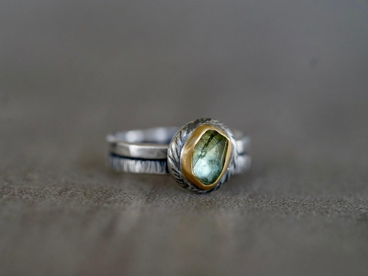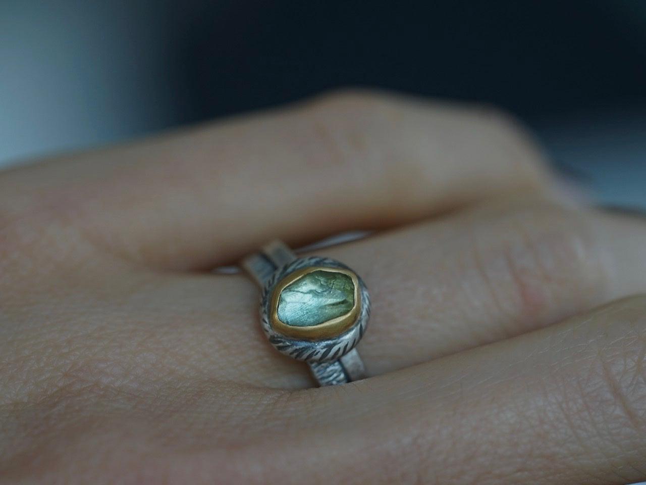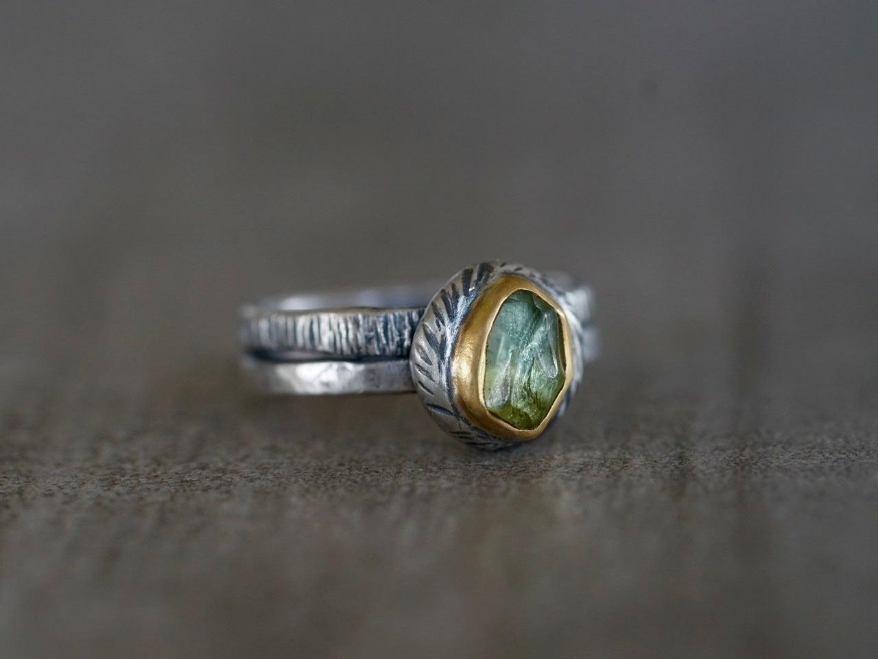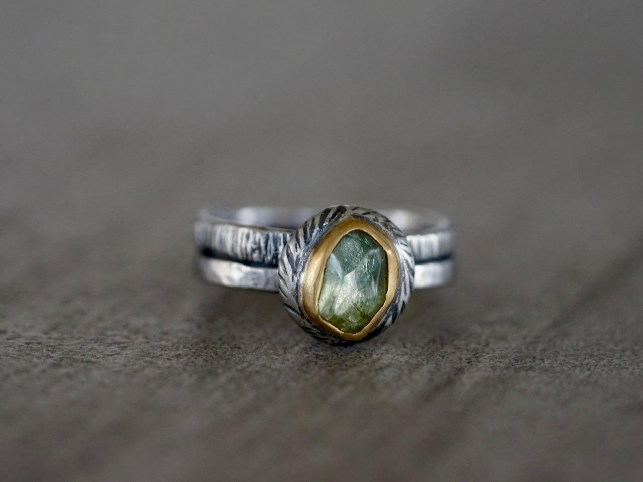 A light green tourmaline with yellow undertones is the focal element of this ring. The stone has an irregular cut and a great sparkle. The green colors pair beautifully with the warm Tones of the 22k gold. A carved and textured sterling silver pebble with an organic shape backs the setting. The look is completed with a textured sterling silver double band.