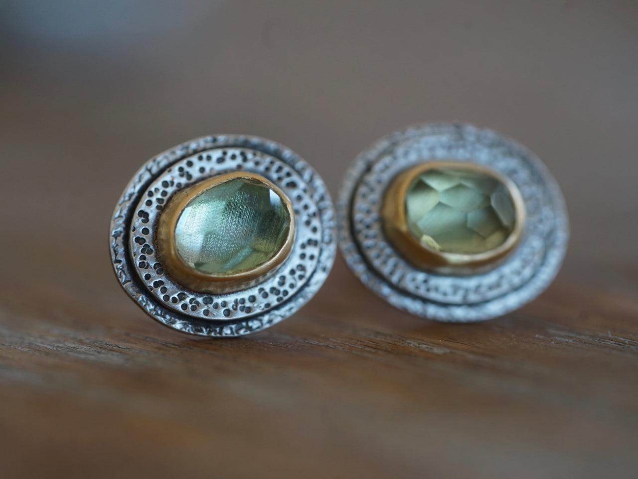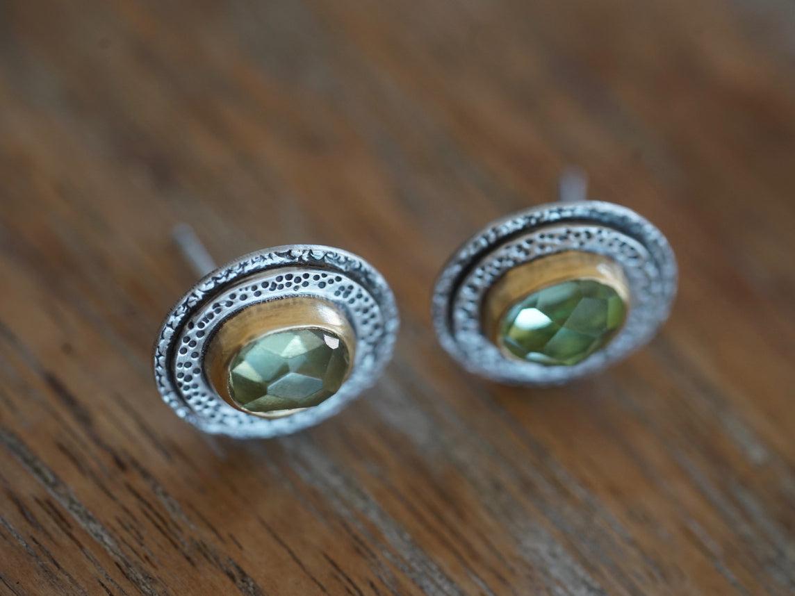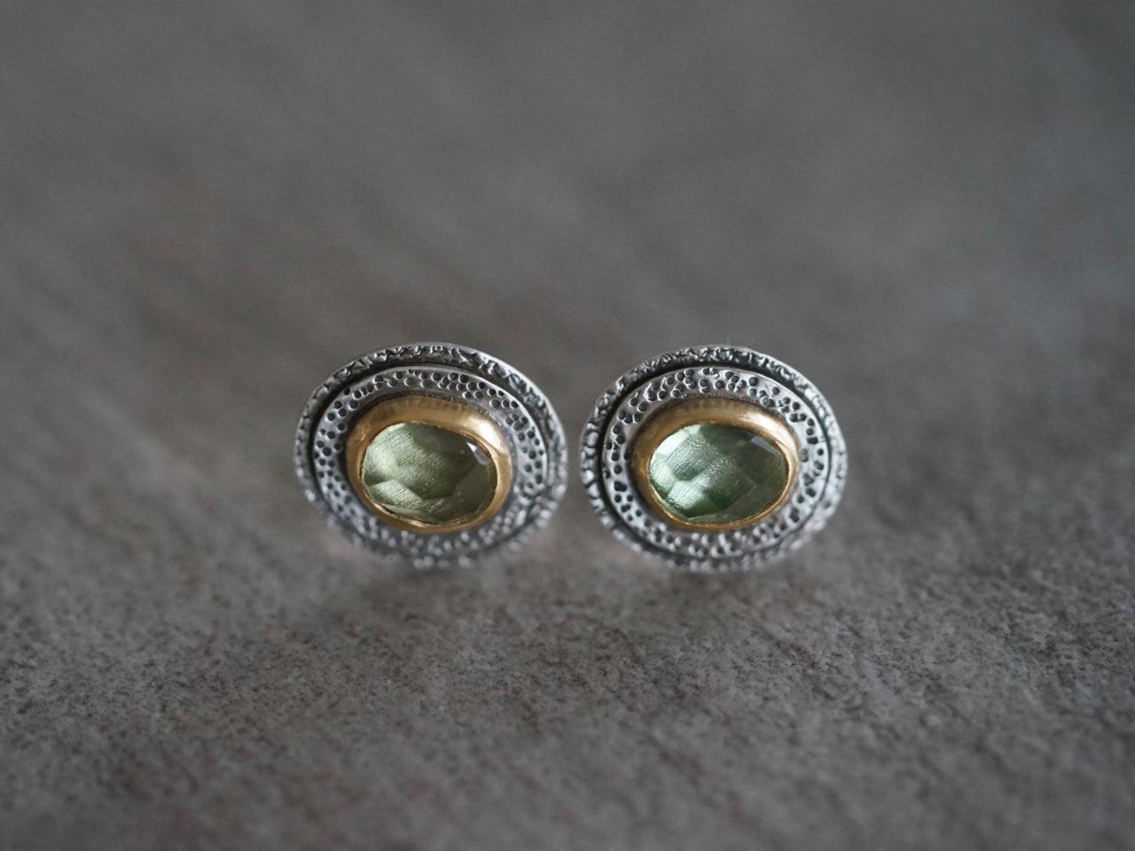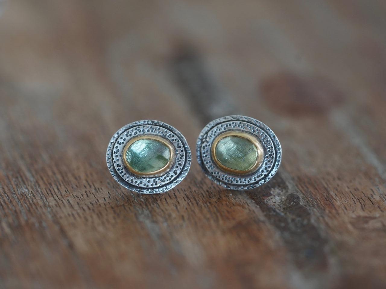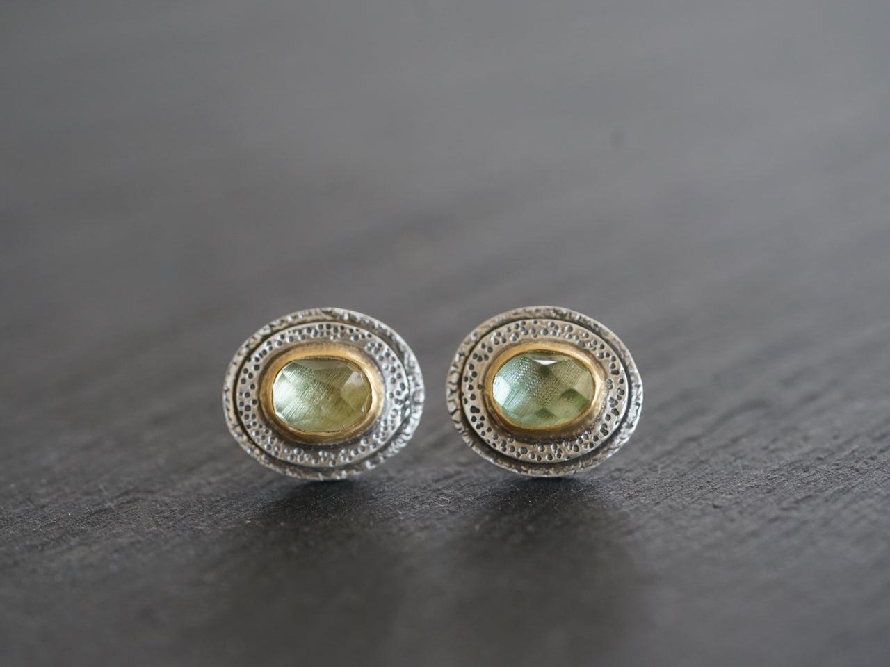 Two very pretty, irregularly cut, green tourmalines were set in 22k gold to create these lovely post earrings. The stones are not calibrated, their shapes are not identical but together they form a great pair. They are mounted on a layered and textured sterling silver setting and are fastened with sterling silver posts and butterfly closures.