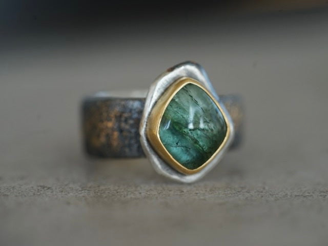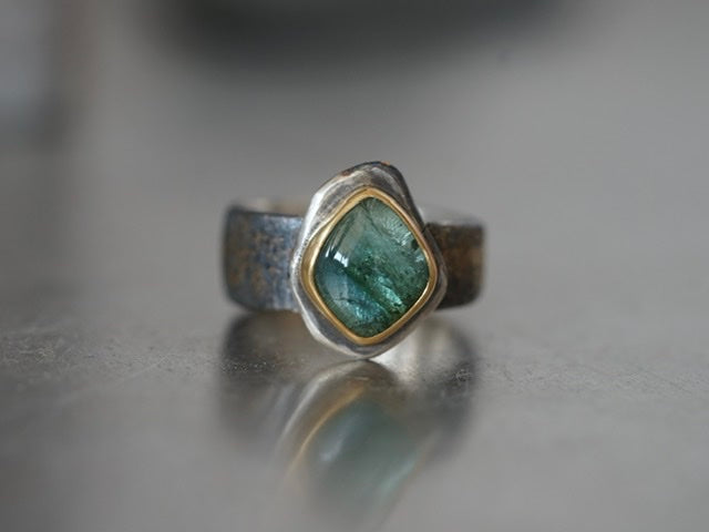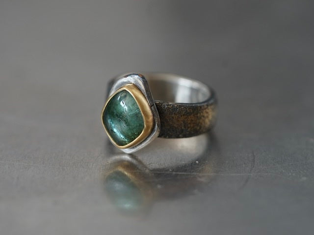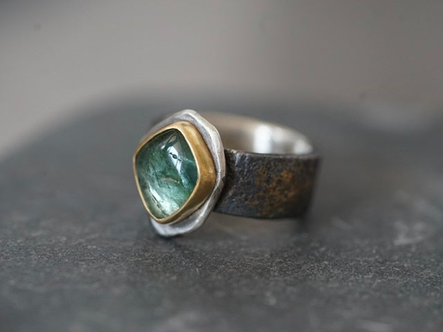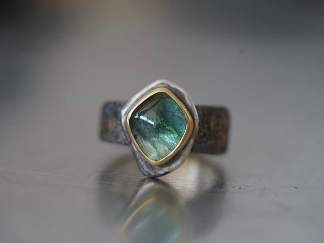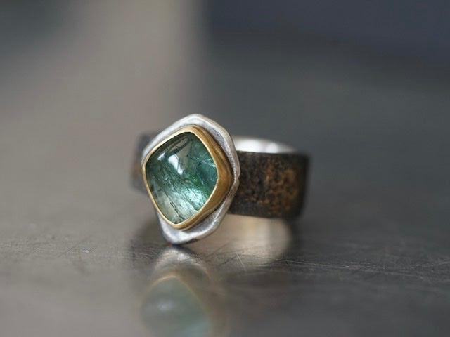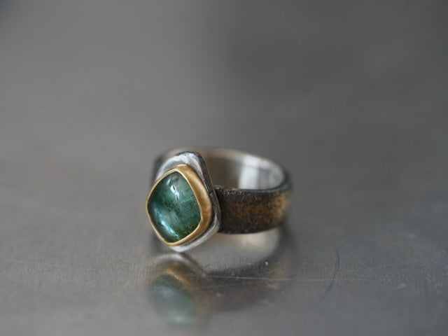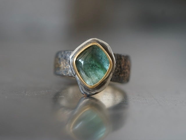 A truly unique smooth tourmaline cabochon with beautiful inclusions was set in 22k gold and mounted an a roughly carved sterling silver slice. The sterling silver band was embellished by fusing 22k gold dust to the surface and textured by reticulation. The sterling silver was darkened to enhance the contrast to the gold, this dark colour might fade with wear but could be refreshed depending on the wearers wishes. As most mazulou items this ring is one of a kind