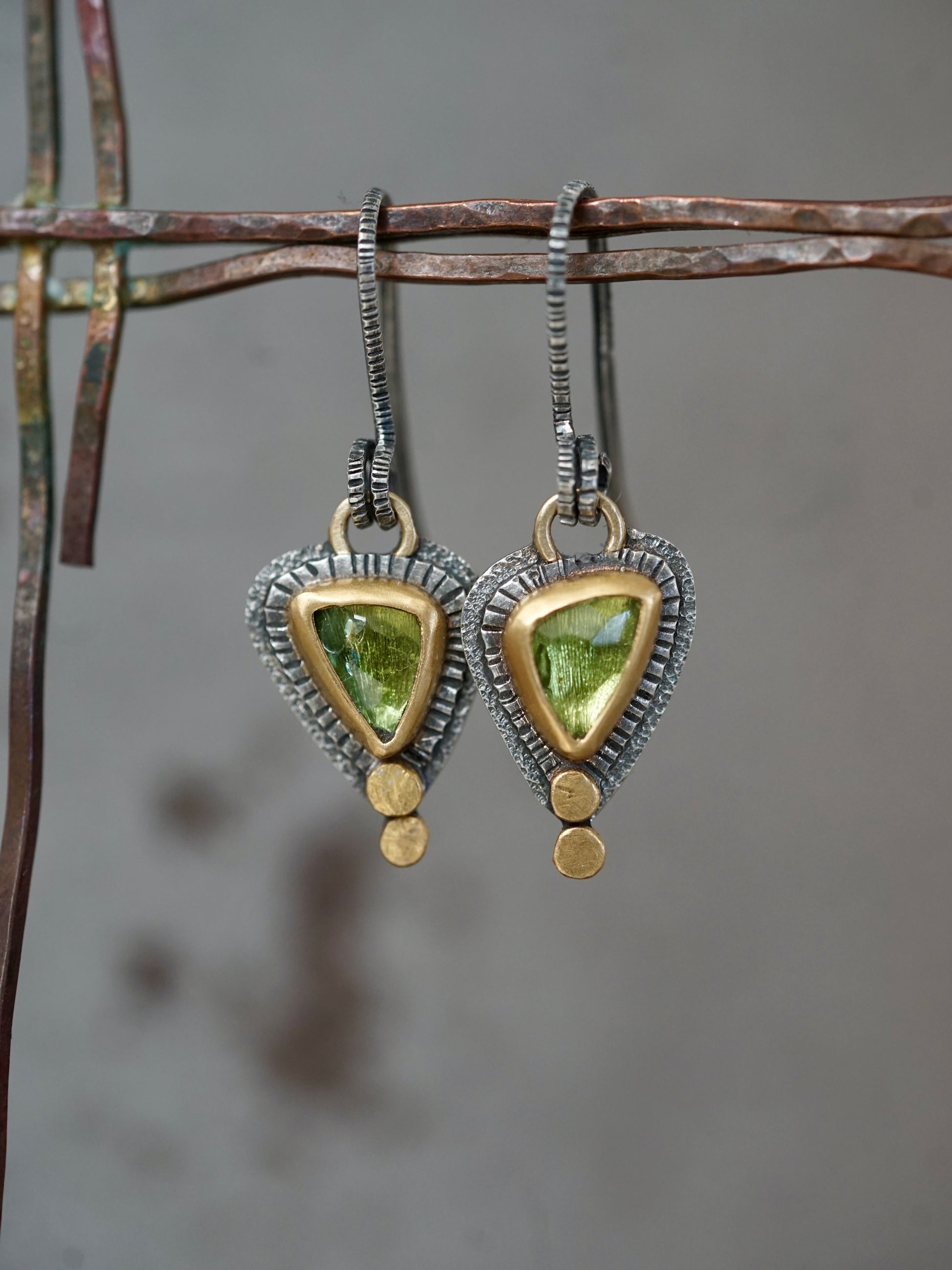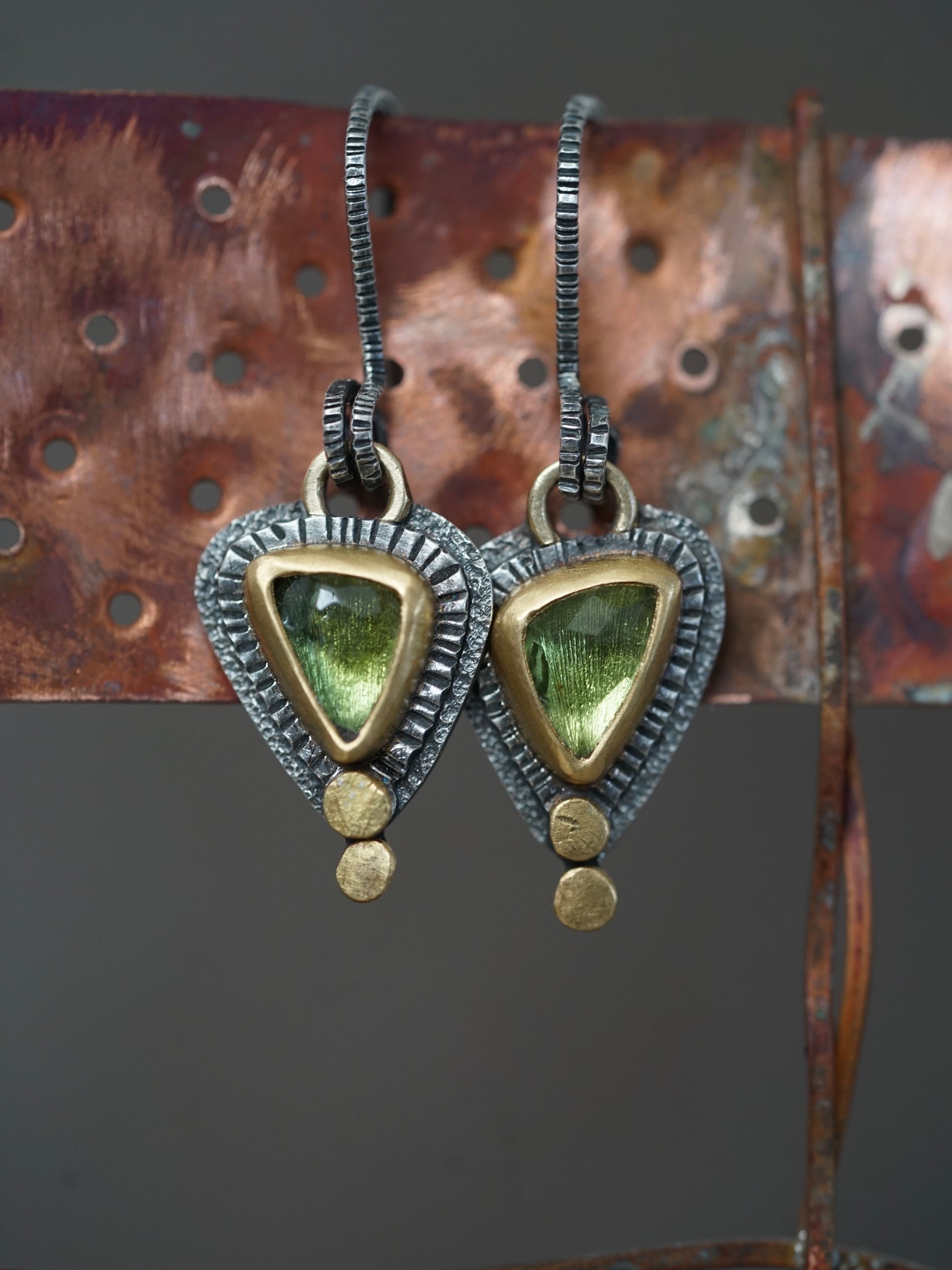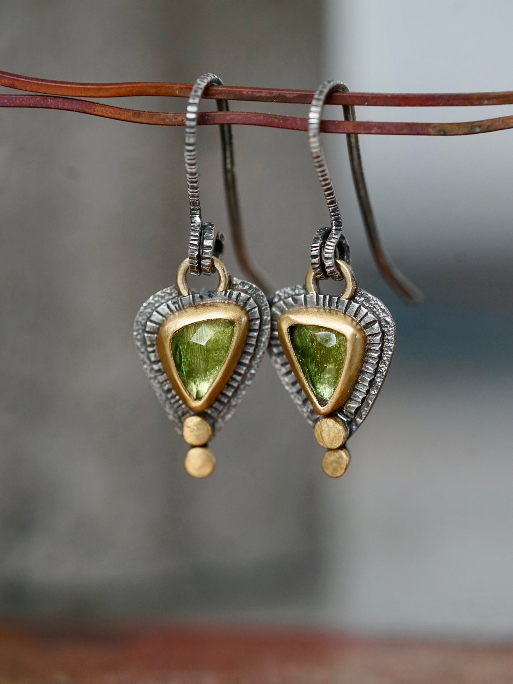 Beautiful handmade tourmaline earrings with gold accents, one of a kind and exquisite.