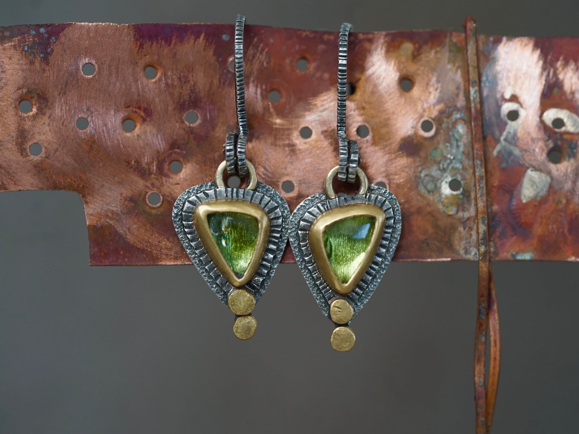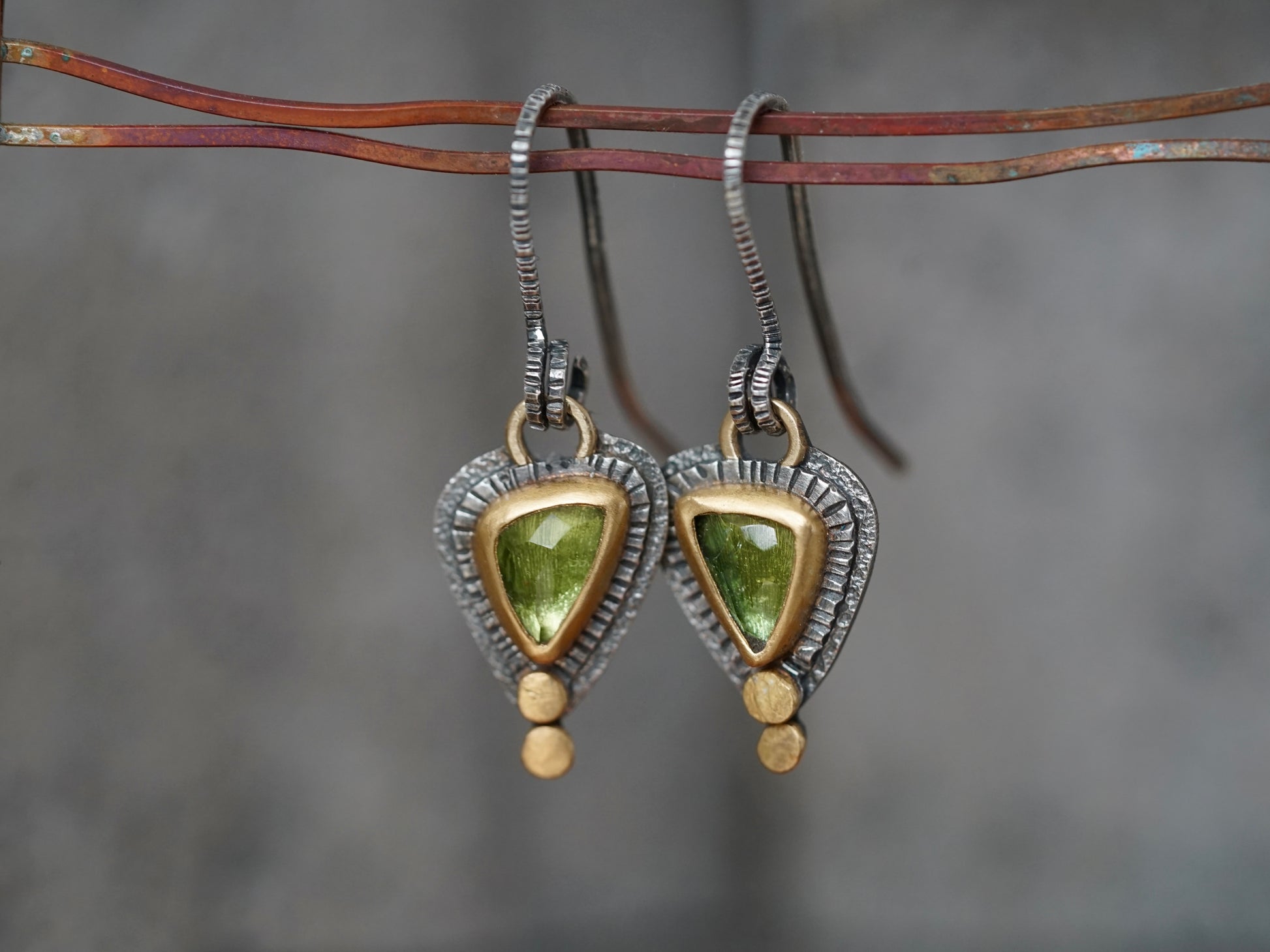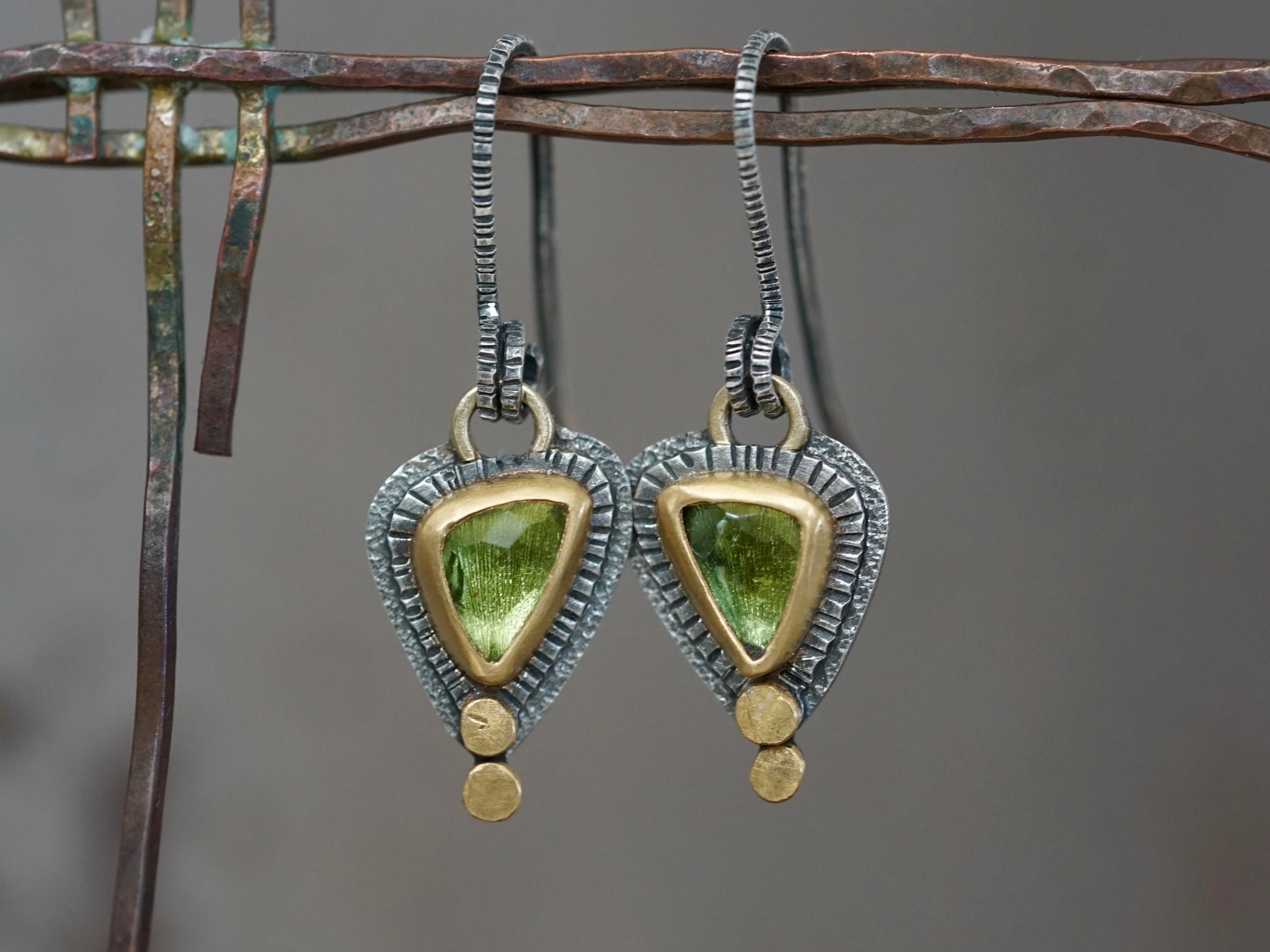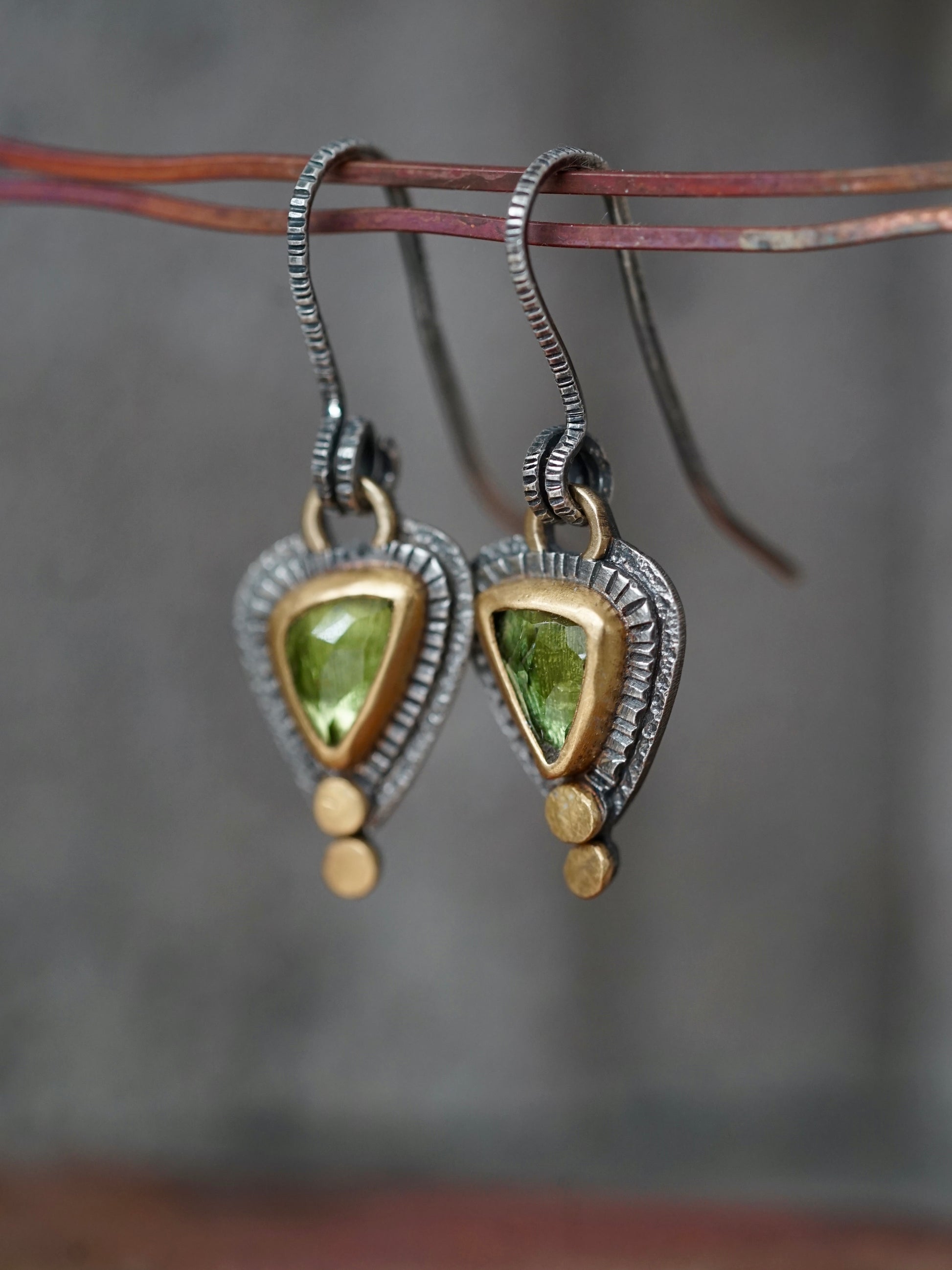 Beautiful handmade tourmaline earrings with gold accents, one of a kind and exquisite.