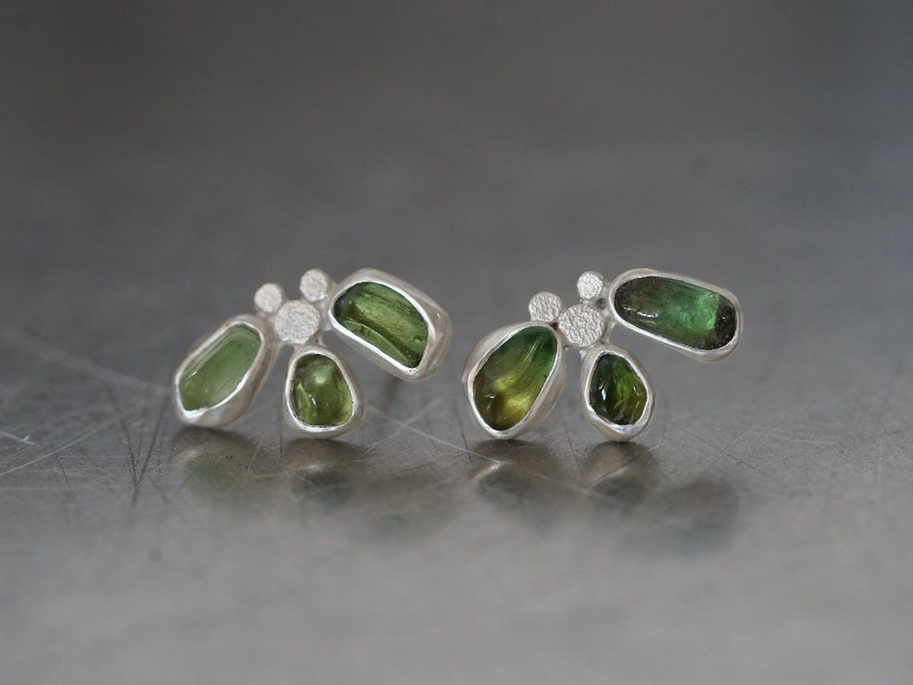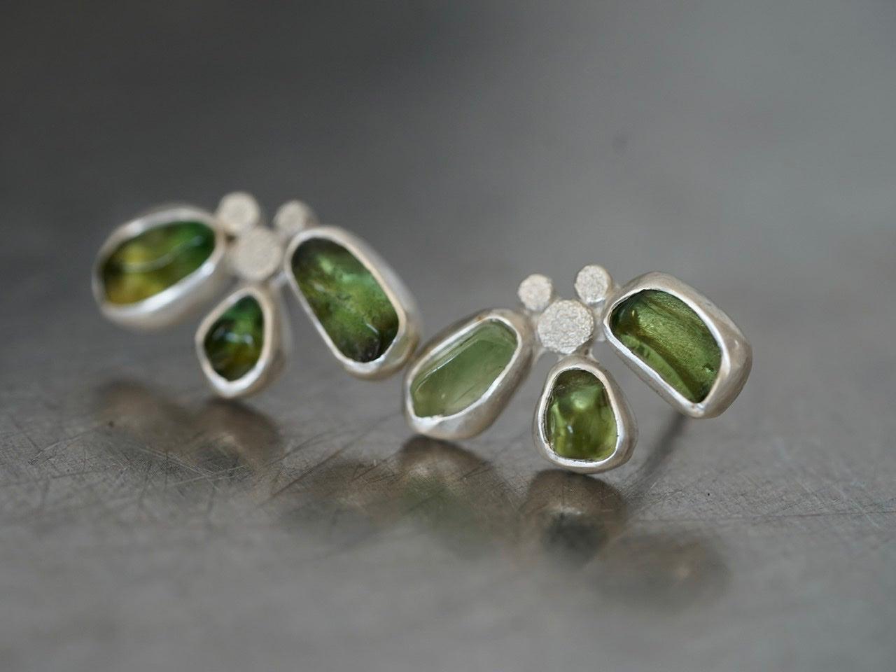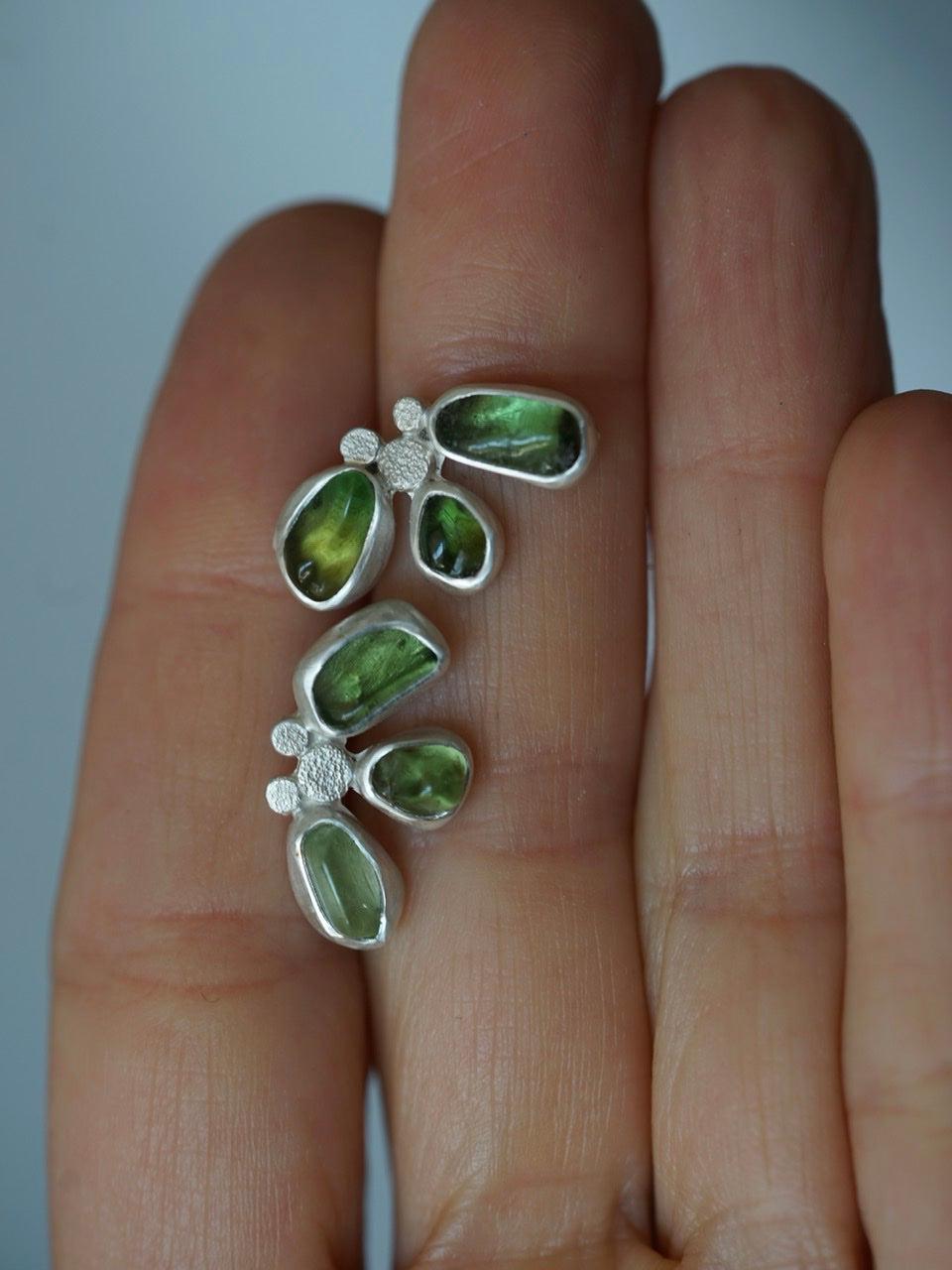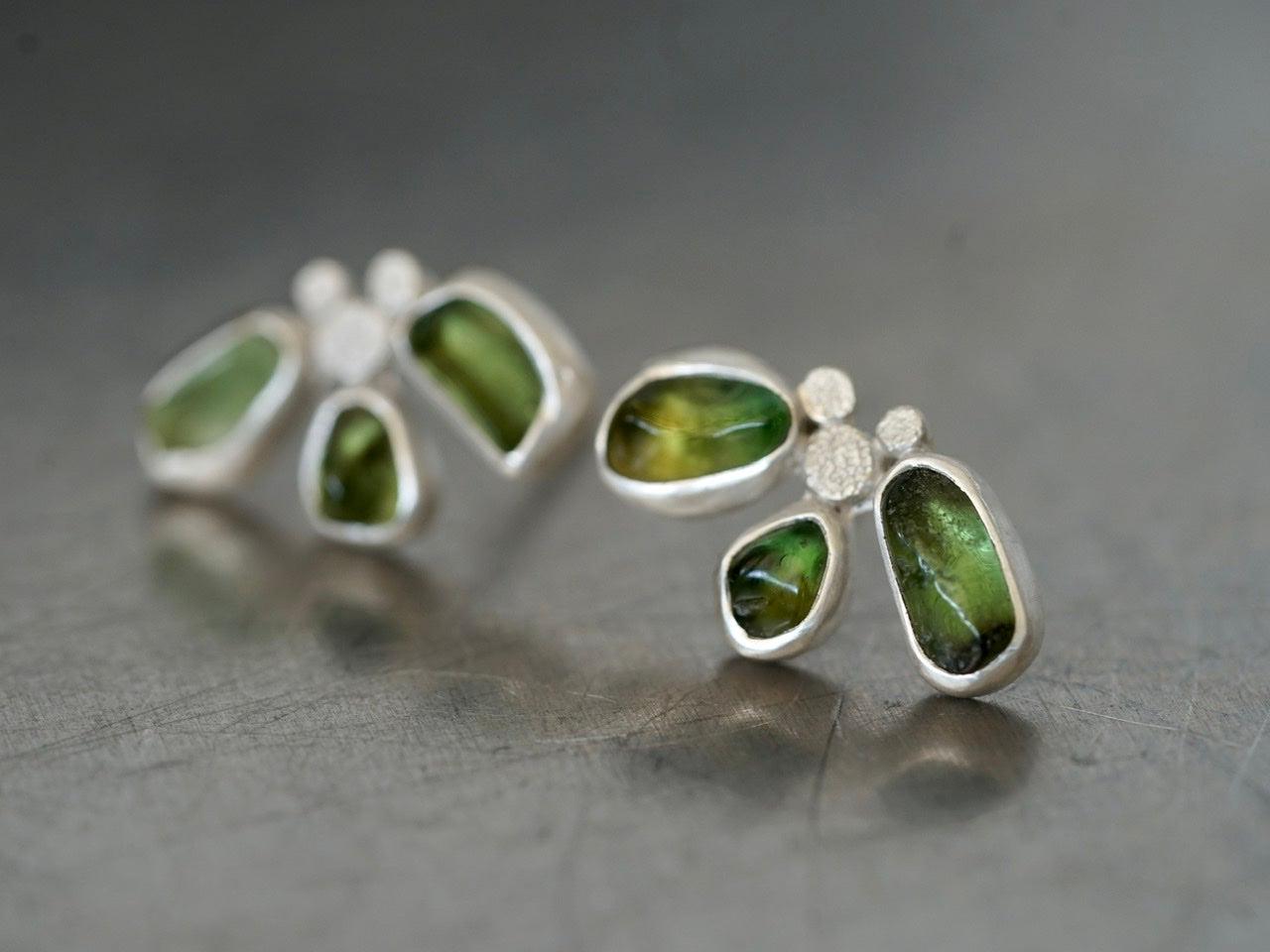 Green tourmaline crystals, smoothed by tumbling, were set in fine silver to create these lovely leaf-like post earrings. To me these earrings symbolize new beginnings, spring and hope. Created with natural, uncut stones they are not symmetrical, but complement each other in an organic way.
