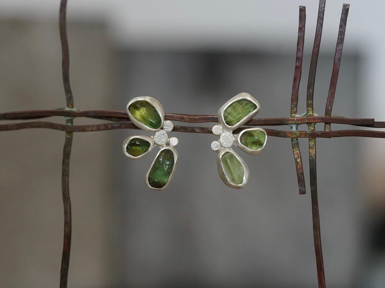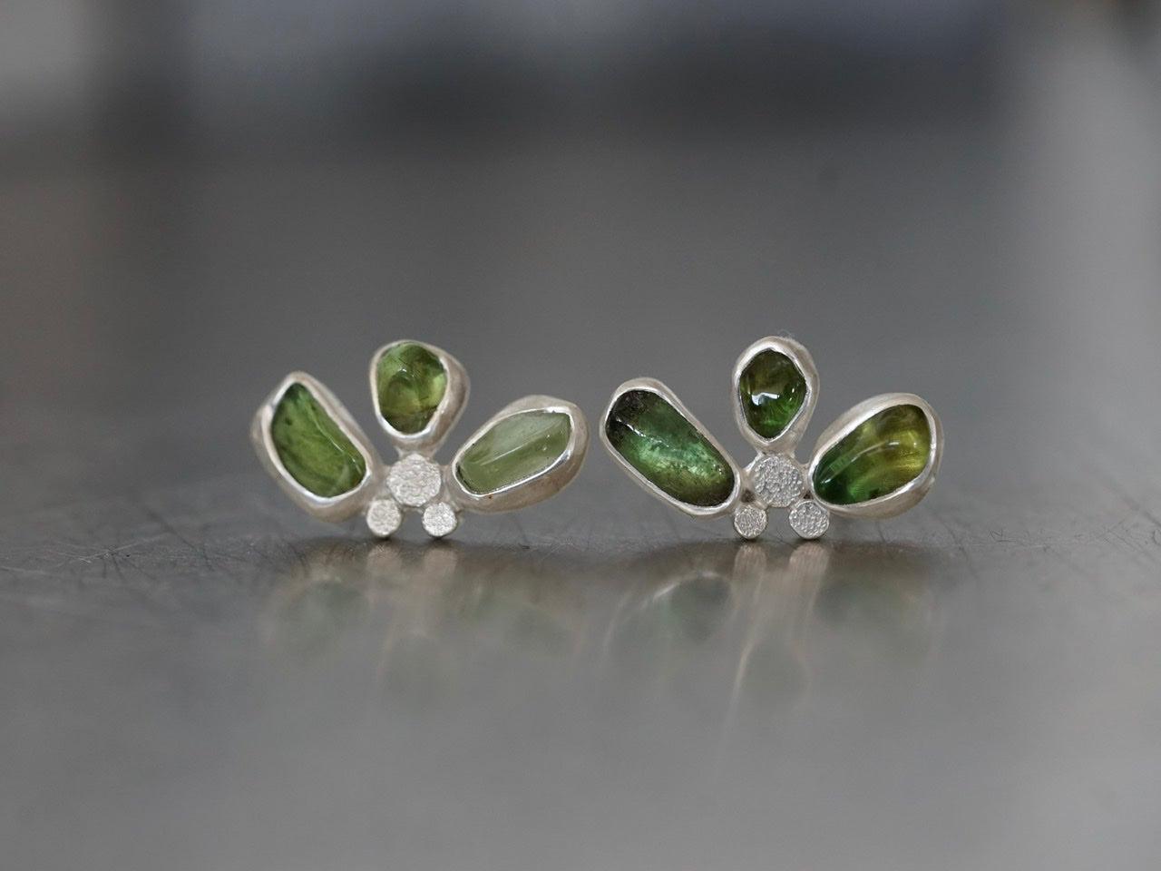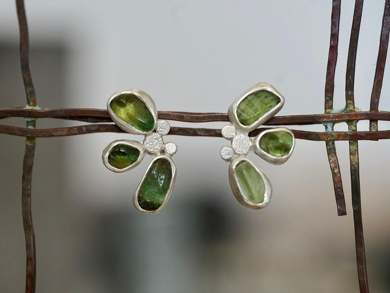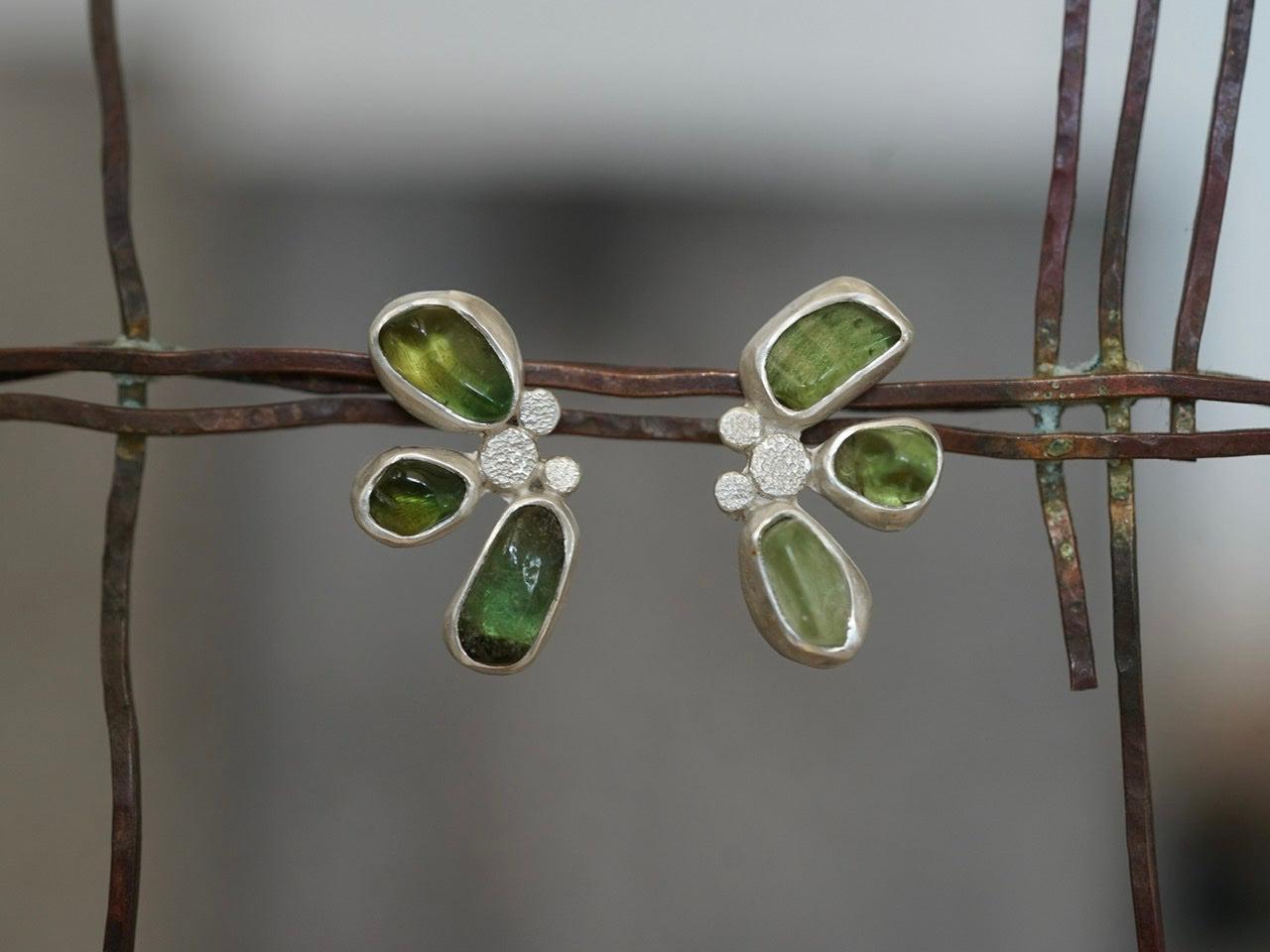 Green tourmaline crystals, smoothed by tumbling, were set in fine silver to create these lovely leaf-like post earrings. To me these earrings symbolize new beginnings, spring and hope. Created with natural, uncut stones they are not symmetrical, but complement each other in an organic way.