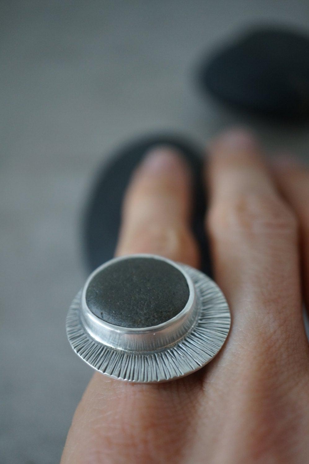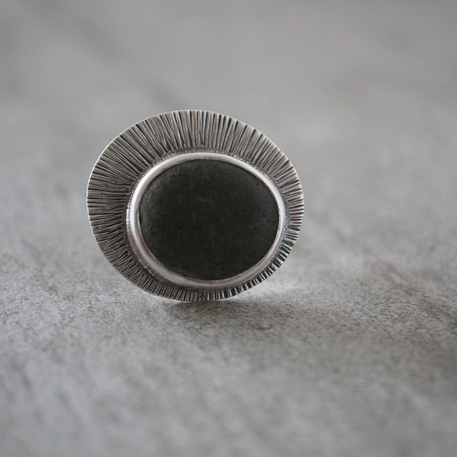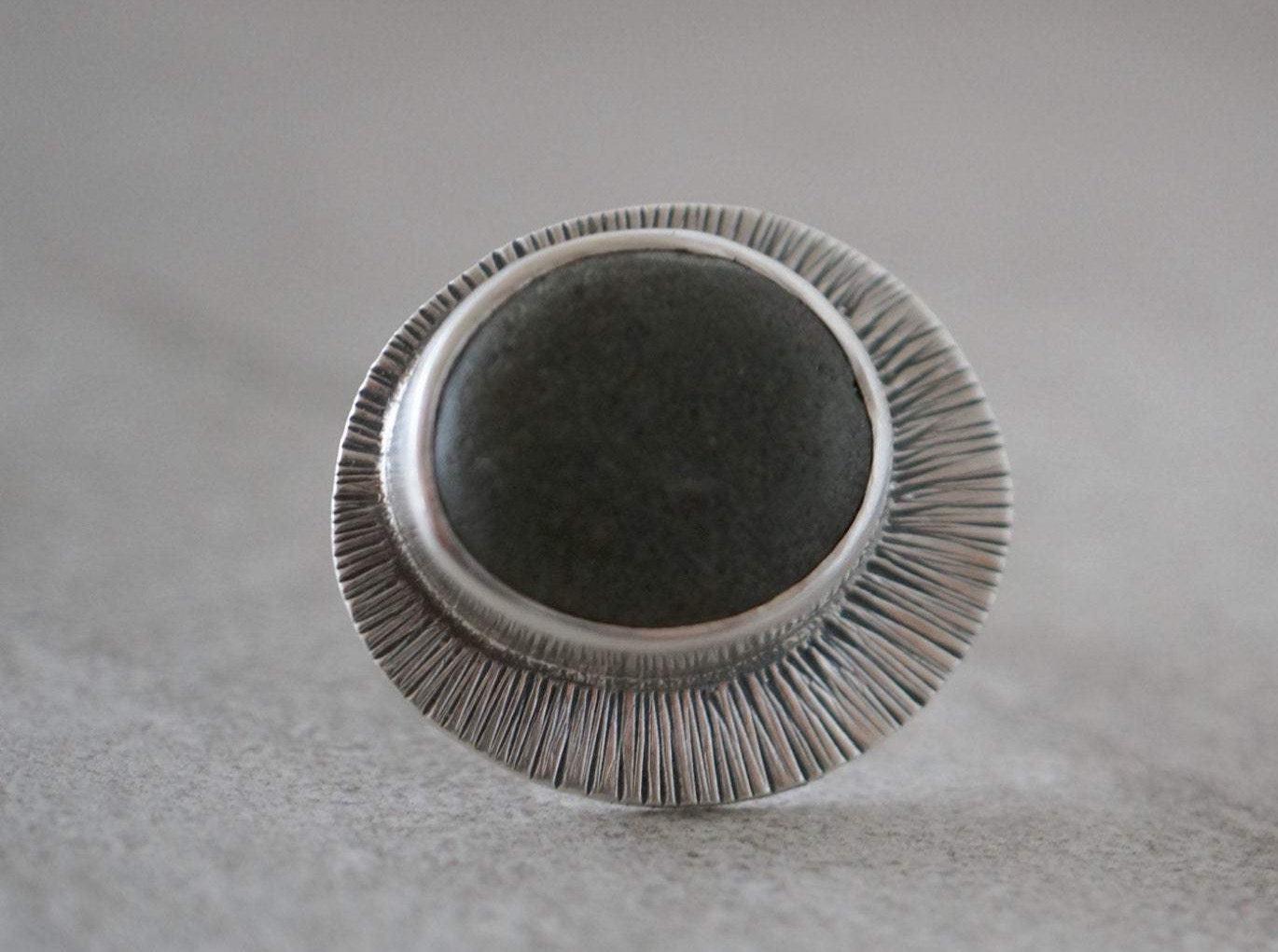 This is a very interesting, asymmetrical statement ring, US size 5.25, featuring a grey, smooth beach pebble framed by a setting with a ray-like texture. The reduced colour scheme of the design gives this ring an understated elegance and a very contemporary feel. A modern shield ring, reduced to the essentials.